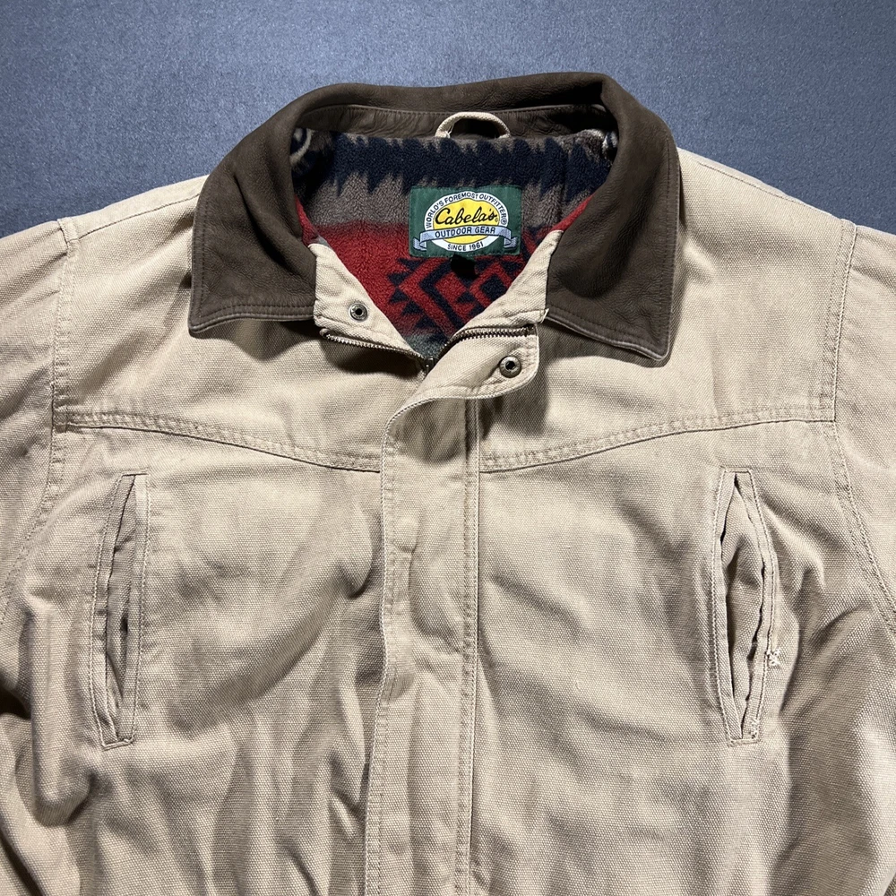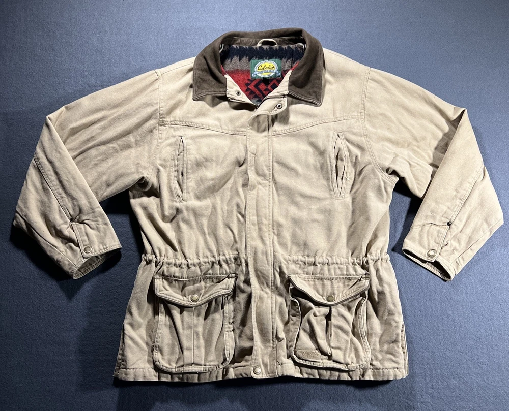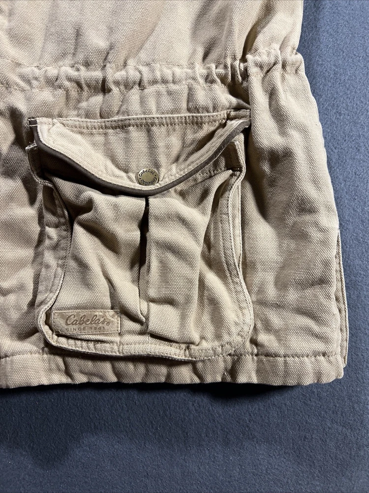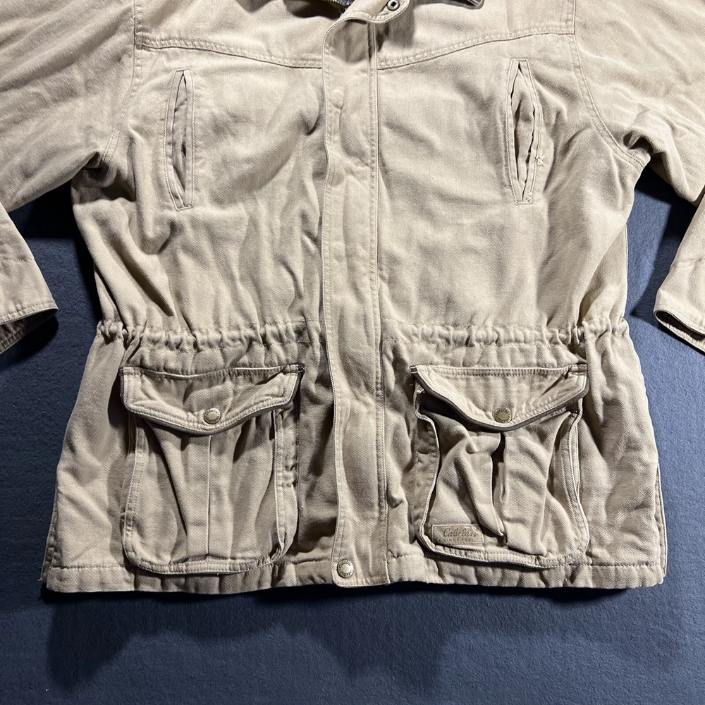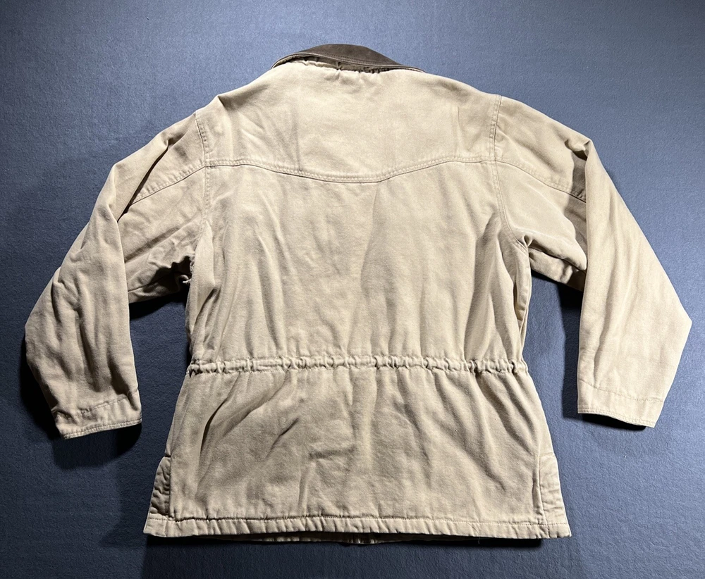 *Please review all photos closely due to jacket having several small spots on front left sleeve and jacket having one small hole on front left chest near pocket as well as canvas exterior having some color fade from washing use and wear to prevent return.* Embrace the great outdoors with this rugged Cabela's field jacket in beige. Designed for the avid hunter or fisherman, this mid-length coat is made from durable cotton canvas and features a warm polyester lining. The jacket boasts a variety of features including a suede leather collar, drawing waist, interior pockets, and a zip closure. Ideal for colder weather, this fleece-lined coat is perfect for staying warm while out on the hunt or fishing trip. The solid beige color and overcoat style make it a versatile addition to any outdoor wardrobe. This jacket is machine washable and made to last with high-quality materials. Chore Coat Barn Coat Hunt Fish Work Oilfield Construction Feed Lot Farmer Rancher Lined Warmth Winter Wear Cabela’s Outdoor Gear Outside Duck Canvas Heavy Durable Pipeline GasPlant Industrial Foundry Roustabout Construction Builder Fishing