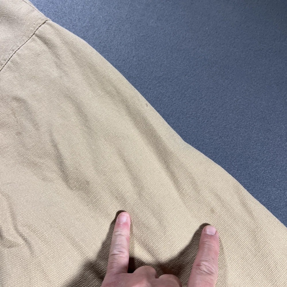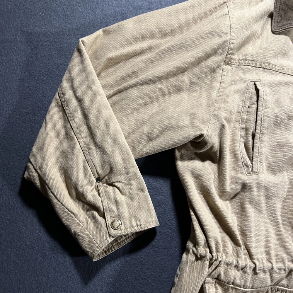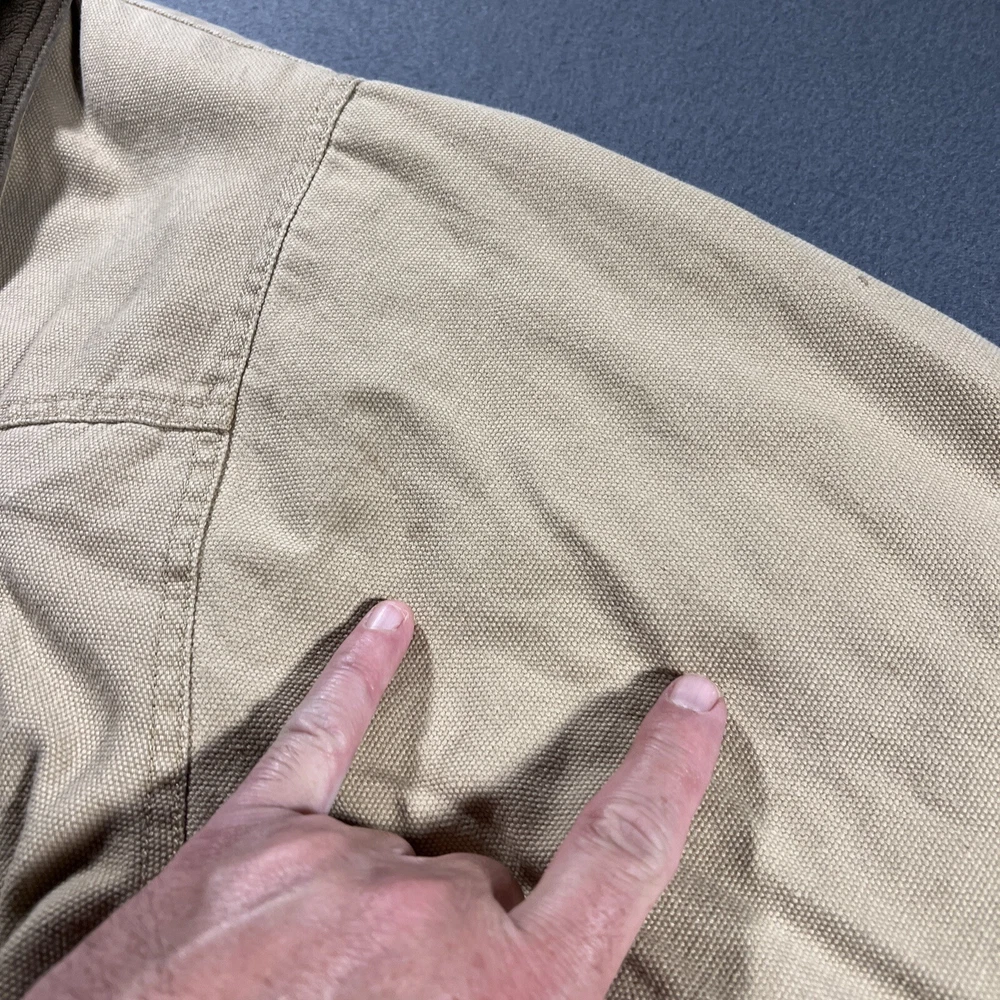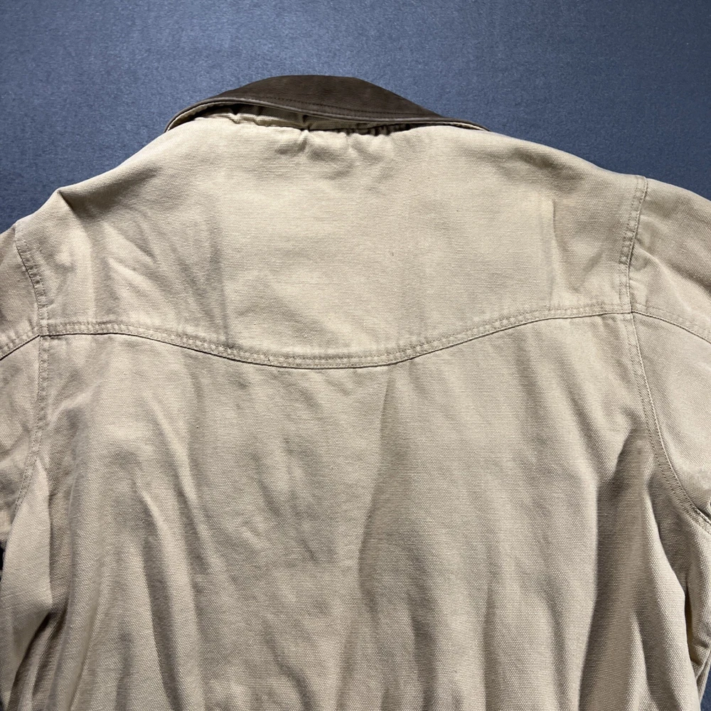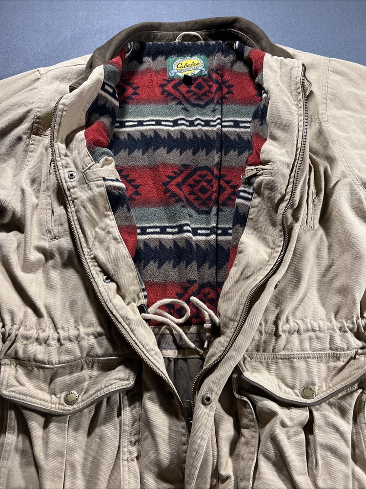 *Please review all photos closely due to jacket having several small spots on front left sleeve and jacket having one small hole on front left chest near pocket as well as canvas exterior having some color fade from washing use and wear to prevent return.* Embrace the great outdoors with this rugged Cabela's field jacket in beige. Designed for the avid hunter or fisherman, this mid-length coat is made from durable cotton canvas and features a warm polyester lining. The jacket boasts a variety of features including a suede leather collar, drawing waist, interior pockets, and a zip closure. Ideal for colder weather, this fleece-lined coat is perfect for staying warm while out on the hunt or fishing trip. The solid beige color and overcoat style make it a versatile addition to any outdoor wardrobe. This jacket is machine washable and made to last with high-quality materials. Chore Coat Barn Coat Hunt Fish Work Oilfield Construction Feed Lot Farmer Rancher Lined Warmth Winter Wear Cabela’s Outdoor Gear Outside Duck Canvas Heavy Durable Pipeline GasPlant Industrial Foundry Roustabout Construction Builder Fishing