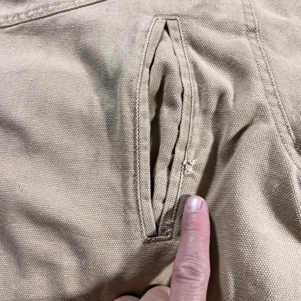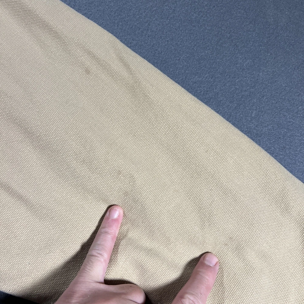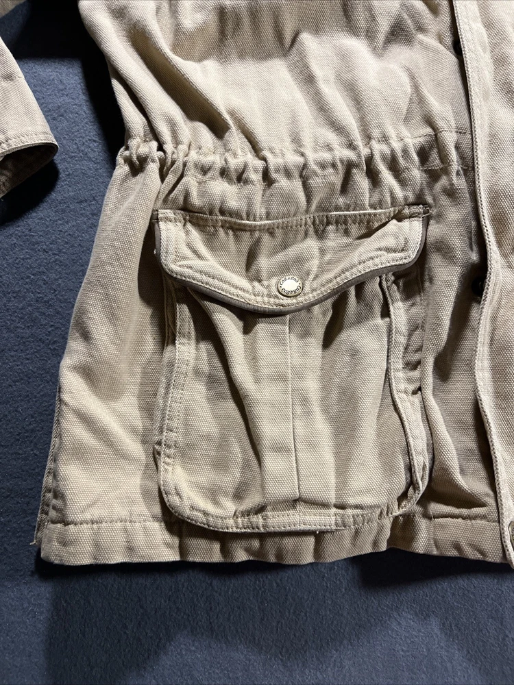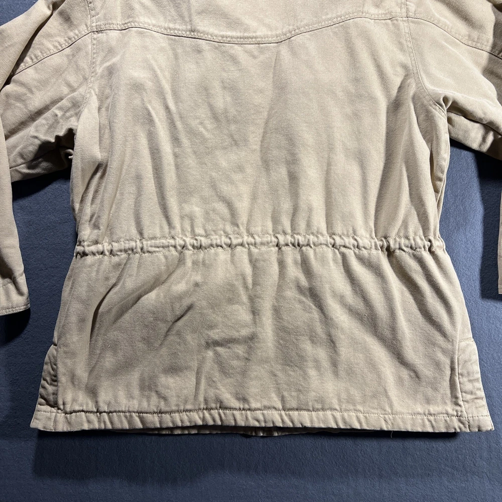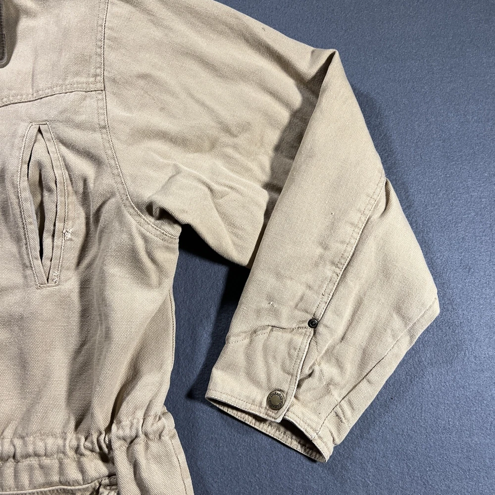 *Please review all photos closely due to jacket having several small spots on front left sleeve and jacket having one small hole on front left chest near pocket as well as canvas exterior having some color fade from washing use and wear to prevent return.* Embrace the great outdoors with this rugged Cabela's field jacket in beige. Designed for the avid hunter or fisherman, this mid-length coat is made from durable cotton canvas and features a warm polyester lining. The jacket boasts a variety of features including a suede leather collar, drawing waist, interior pockets, and a zip closure. Ideal for colder weather, this fleece-lined coat is perfect for staying warm while out on the hunt or fishing trip. The solid beige color and overcoat style make it a versatile addition to any outdoor wardrobe. This jacket is machine washable and made to last with high-quality materials. Chore Coat Barn Coat Hunt Fish Work Oilfield Construction Feed Lot Farmer Rancher Lined Warmth Winter Wear Cabela’s Outdoor Gear Outside Duck Canvas Heavy Durable Pipeline GasPlant Industrial Foundry Roustabout Construction Builder Fishing
