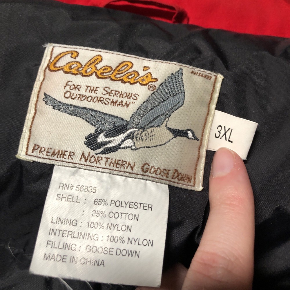 Cabela’s Goose Down Puffer Jacket Men’s Size 3XL Red Full Zip Outdoors Hiking Good condition A couple faint marks, but no major flaws. Measurements in photos.