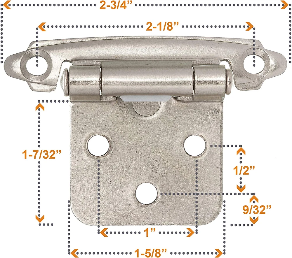UPGRADE YOURS TODAY: The beautiful finish on our semi concealed brushed nickel cabinet door hinges matches your style of cabinet pulls or any nickel decorative hardware that will lift the appeal of your tired-looking cabinets. SELF CLOSING CABINET HINGES : Our proprietary metal spring Satin Brushed Nickel Cabinet Hinges gives you outstanding functionality and product performance. Your cabinet door hinge will automatically close under 30 degrees. Silicon dampers also ensure every close is a quiet one. ½ INCH or VARIABLE OVERLAY CABINET HINGES. It means your cabinet door "overlays" or overlaps the cabinet face frame. These self closing cabinet hinges are also known as the surface mount cabinet door hinges or flush mount hinges for cabinet door. NEWLY UPGRADED HINGE SCREWS. The Decobasics bulk cabinet hinges satin nickel come with newly strengthened 5/8 screws to ensure a perfect fit, even using with power tools. Separately packed with silicon cabinet door bumpers for your convenience. BUILT TOUGH FOR AMERICAN FAMILIES. Our silver hinges for kitchen cabinets can take the everyday grind of large families. Thick stainless steel and an electroplated outer coating of nickel mean they are durable, rust-proof cupboard hinges made to last. Product Description Decobasics hardwares are made to fit your home and lifestyle perfectly. High performance and premium quality with long-lasting durability. The Beauty and Classic Style of Cabinet Hinges Premium Quality Variable Overlay Hinges Decobasics variable overlay hinges are made out of premium thickened materials for required durability and longevity. Each hinge is constructed with attention paid to every last detail so you can be assured that your cabinet will be functioning perfectly. Variable Overlay Soft Closing Hinges. Strong, Durable and Beautiful. Quality Steel Screws and Door Bumpers. Comes in Different Color Options. Suitable for Every Traditional Kitchen & Bath Cabinet. Self-Closing Hinges Durable and flexible metal spring’s module ensures automatic functionality to open and close the cabinets when the door angle is less than 30°. Suitable for American Style Face Frame cabinets Our overlay cabinet hinge works on old American Face Frame kitchen cabinets doors in the kitchen, bathrooms, and any room in your house. 1/2” Silicone Round Door Bumper Each cabinet hinge comes with a cabinet door bumper to damper/reduce the slamming noise of cabinet doors and hardware.