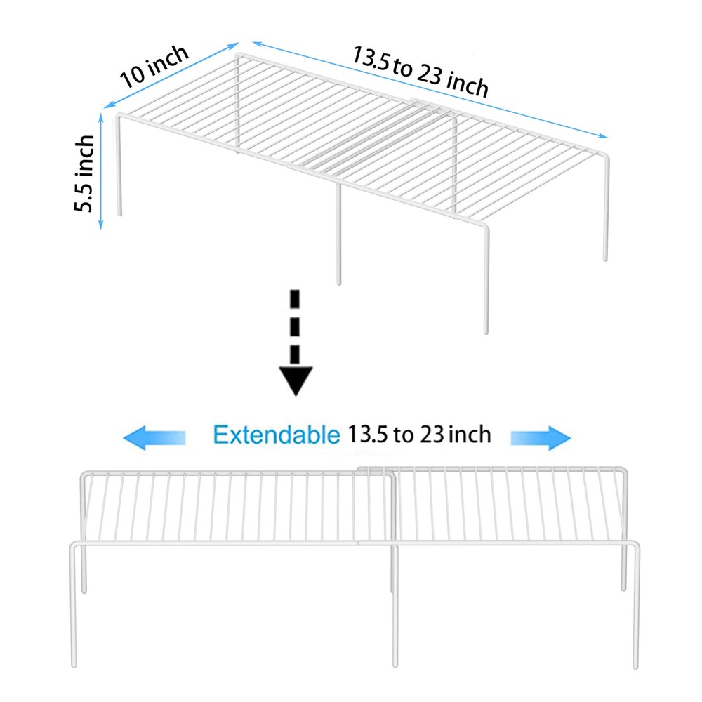 EXPANDABLE DESIGN: The length of this shelf can be adjusted to your desire. It can vary from 13.5 inches to 23 inches in length depending on how you want to arrange your space. This product is tailor-made for customers who faces difficult product selections. Size:13.5 to 23 L x 9.4W x 5.5 H inch. FUNCTIONAL STORAGE:Perfect shelf to keep everything organized in cabinet, pantry, cupboard, closet, drawer or counter top in kitchen, bathroom, bedroom and under the sink. With the mesh design board, it can be a drying rack for dishes, bottles, plates. QUALITY CONSTRUCTION:Made of metal steel with a white PR coating that cleans easily and wont rust or scratch delicate items, these shelves will be around for the long haul. NO INSTALLATION:No installation or hardware is required for the assembly of the steel shelf cabinet organizer. You can simply place it wherever required. 100% SATISFACTION GUARANTEE:Please keep in mind that we provide product quality assurance, feel free to contact us anytime if you are not satisfied.