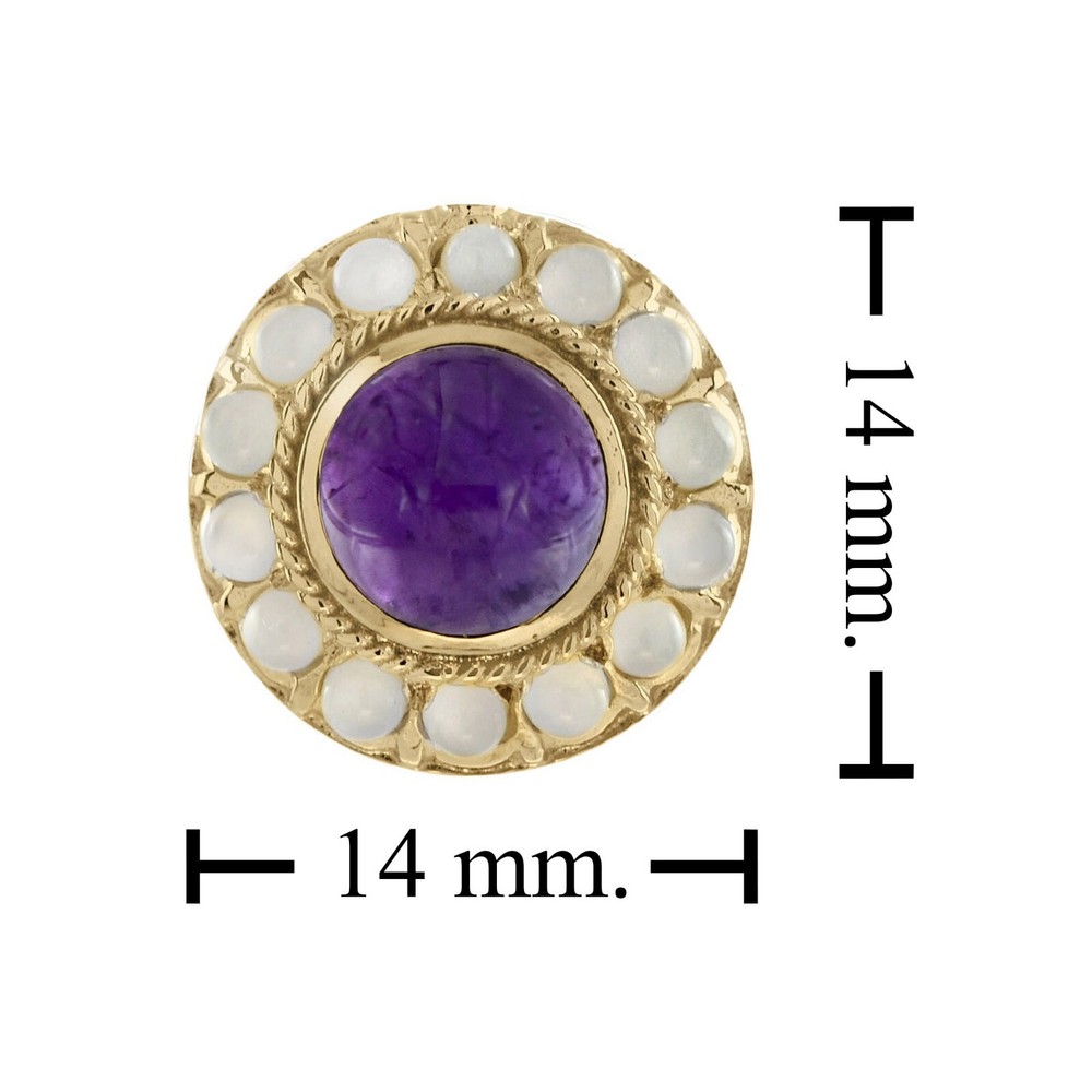 Cabochon Amethyst and Moonstone Halo Stud Earrings in 14K Yellow Gold A halo of milky moonstones surrounds a cabochon of amethyst in the middle of this gorgeous pair of stud earrings. This eye-catching gemstone is set in yellow gold with a post friction back. This luminous gemstone is the birthstone for the month of February. Earrings Information Style: Art Deco Metal: 14K Yellow Gold Width: 14 mm. Length: 14 mm. Weight: 5.40 g. (approx. in total) Backing: Push Back Center Gemstones Type: Cabochon Amethyst Shape: Round Size: 7 mm. Number: 2 Weight: 3.00 Carat (approx. in total) Accent Gemstones Type: Moon stone Shape: Round Size: 2.3 mm. Number: 28 Weight: 1.00 Carat (approx. in total) These earrings will be made to your order in 1-2 weeks, contact us to find out more. An attractive earrings box is included. We dispatch all items via a secure and trackable for your item. You will receive a shipping notification after purchase with your tracking number so that you know your order is on its way. Please note that import taxes may be incurred. This duty/tax must be paid by the importer/customer and it's not included in our service since the import duty rate varies depending on the country. Our Story Customized Jewelry Shipping Packaging Product Guarantee Our Story We didn’t start as a retail jeweler. Our company has been in the fine gemstone business for generations and has deep roots in antique and vintage design jewelry. While we have primarily catered to larger retailers around the world, we finally decided to bring our jewelry directly to the public with the brand Lilly M. JEWELERS . Since 2005, Lilly M. JEWELERS continually strived to achieve customer satisfaction in every aspect of our business. Our goal is to make incomparably beautiful antique jewelry, just for you. We obsess over comfort, quality, and durability to ensure that this is jewelry you will cherish for a lifetime. Our factory’s location in the world’s foremost hub for colored gemstones, and our knowledge of and appreciation for Thai craftsmanship have uniquely positioned us to provide the best jewelry manufacturing experience. We are a vertically integrated company – right from stone-cutting, designing, manufacturing, quality control and, fulfillment, everything is taken care in-house by our team with more than 16-year of experience in the jewelry industry. Currently, we ship our quality jewelry to more than 40 countries worldwide with our primary customer base located in the US region and Continental of Europe. To provide the best service possible to our customers is the goal. Like a personal assistant, we help you to find the perfect piece of jewelry in a simple and easy to understand way. Though it might sound cliché, providing excellent customer service is vital to the work we do. We hope that you won’t hesitate to contact us with any questions. Customized Jewelry MADE TO ORDER ITEMS We offer customization for all of our made-to-order jewelry . Available center stone: Various Natural Gemstones Available metal: Platinum 950 / 18K or 14K White Gold , Yellow Gold , Rose Gold Available ring size: All size (Eternity or band ring might be different depends on the design.) Production lead time is 10 - 12 days after order confirmation. READY TO SHIP ITEMS We offer a free 1/2 size bigger or smaller resize with every purchase. Please contact us for more information. The resizing process takes 2-3 days. Shipping 100% FREE SHIPPING! We now offer FREE worldwide shipping for all orders! (Auction Items are not included in this shipping policy) ✈️ SHIPPING SERVICE We ship almost all international packages via FedEx International Priority . Please note that you may incur additional customs taxes/local duties. Please check with your local customs office for information. Should you enter the wrong address, we are not obliged to re-send the order to the correct address at our expense. Lilly M. JEWELERS is committed to the timely delivery of your order. However, delivery delays due to inclement weather conditions, carrier delays, or incorrect addresses are beyond our control. Production Lead Time: 1-2 weeks Delivery Timeframe: 3-4 business days. Made to orders items : We will provide you with an expected delivery time upon completion of your order. It is the responsibility of the customer to inform Lilly M. JEWELERS if an order does not arrive. Once we learn an order has not arrived by the due date, we will lodge inquiries with the courier to ensure delivery occurs as soon as possible. We will not be held liable for any loss or damage resulting from late delivery. Packaging When you open your package from Lilly M. JEWELERS, you’ll discover a simple, elegant, and stylish rectangular box with sturdy folders filled with Lilly M. JEWELERS certificate of authenticity, including your GIA or certificate (for some item(s)), your receipt of purchase. INSURED AND DISCREETING PACKAGING In order for insurance to be valid, we “double box” our shipment, and our insured shipping box won’t give away what’s inside. Please closely examine the package upon receipt. Product Guarantee Lilly M. JEWELERS provides a universe of hand-finished jewelry made from genuine material . We stamp our jewelry with quality marks to indicate the metal’s purity. We guarantee the authenticity of the items we sell, of the period mentioned in their description on the website and the condition described. 14 DAYS RETURN POLICY We accept returns for refund or exchange within 14 days of delivery . Our 14 days money-back guarantee gives you time to make sure you are completely satisfied with your purchase. The policy begins from the date of delivery. Please see whether either of these pertain to you and if the item(s) are covered by our 14 days return policy. The 14 days COVERAGE Returns/Exchanges the Policy applies to the following condition: • The products are damaged or corroded caused by production or transportation. • If the customers find any ston