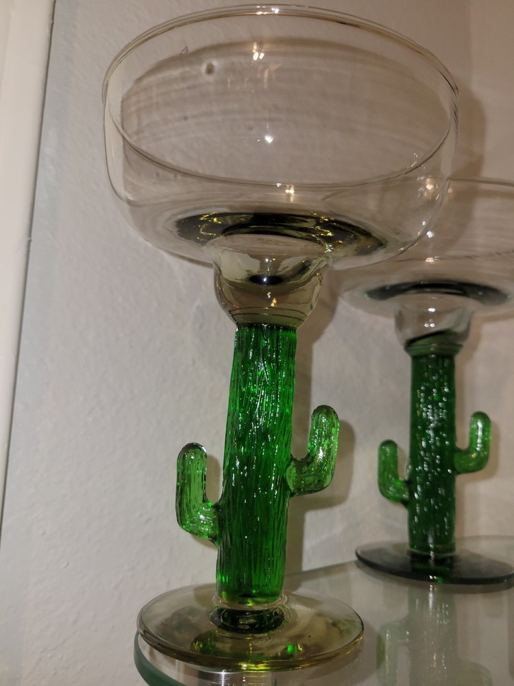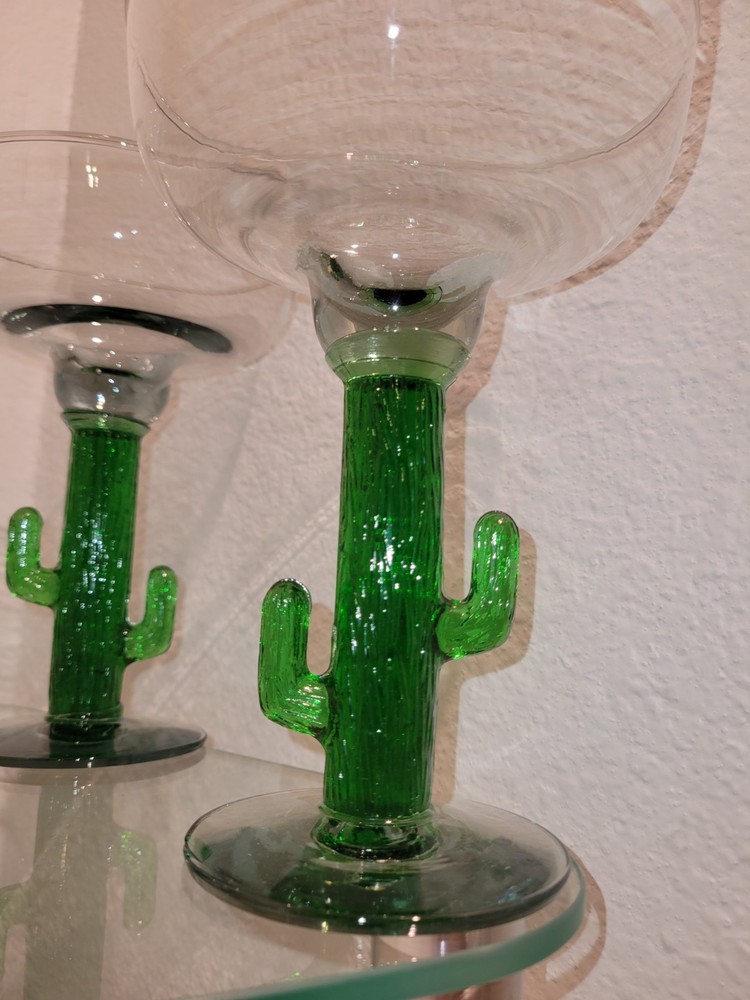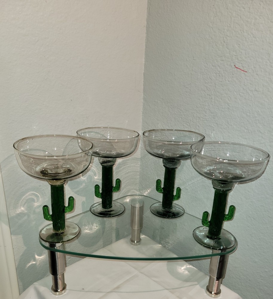 Cactus Saguaro Margarita Glasses – Set of 4 | Handcrafted in Mexico Serve your cocktails with southwestern charm using this Set of 4 Cactus Saguaro Margarita Glasses, handcrafted in Mexico. Each glass features a vibrant green cactus stem with a clear-to-smoke gradient bowl, blending rustic elegance with festive flair. Made from high-quality glass, these pieces are both durable and eye-catching—perfect for margaritas, specialty cocktails, or decorative use. Each glass measures approximately 7 inches tall with a 5-inch diameter, making them ideal for entertaining with style. The photos have been taken with and without flash to best capture the details.