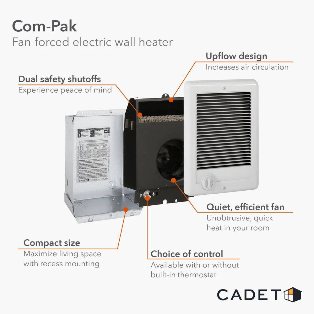 Com-Pak Plus 1000-Watt 240-Volt Fan-Forced Wall Heater Assembly Store New Arrivals Add to Saved Sellers View Feedback Contact Com-Pak Plus 1000-Watt 240-Volt Fan-Forced Wall Heater Assembly Compact, in-wall electric fan heater warms quietly and quickly Interior replacement heater assembly only (no thermostat) Electric wall heater retrofit/replacement into existing wall can Get warm on your terms with this top selling wall heater. The Com-Pak is an efficient and affordable way to add warmth without installing ductwork. With multiple installation options and proven safety features, your family can enjoy safe, sensible warmth for years. ACLI Safety Plug: No Accessories Included: No Amperage (A): 4.17 A Anti-freeze setting: No Area Heated (sq. ft.): 150 sq ft Automatic shutoff: Yes Color: Black Color Family: Blacks Fuel Type: Electric Heat rating (BTU/hour): 3415 Btu/h Heater Controls: Thermostat Heater Type: Unvented Heating Product Type: Electric Wall Heater Heating Technology Type: Forced Air Indoor/Outdoor: Indoor Installation: Recessed/Surface Mounted Number of Heat Settings: Variable Oscillation: No Pack Size: 1 Product Weight (lb.): 2.55 lb Remote Control: No Room Size (sq. ft.): 150-250 Thermostat: No Timer Included: No Voltage (V): 240 V Wattage (W): 1000 W Certifications and Listings: cULus Listed Product Depth (in.): 4.5 in Product Height (in.): 10.8 in Product Width (in.): 7 in ABOUT US Customer service is our top priority! Please be sure to read the description thoroughly to make sure that this is the item you want before making a purchasing decision. If you have any questions about this item, please contact us via eBay messages before placing your order. We make every effort possible to accurately describe and depict the items. Please be aware that slight variations in color may be due to differences in lighting and computer monitor resolutions. All items are in stock at the time of listing; however, in the unlikely and unforeseen event that we are unable to fulfill your order through any of our networked warehouses, we will notify you as quickly as possible and offer you a 100% refund on your purchase. Thank you for shopping with us. We appreciate your business! SHIPPING We provide fast, free shipping. Most items are shipped within 3-5 business days of receiving cleared payment. We ship to the lower 48 contiguous United States only. We do not ship to P.O. Boxes or APOs. For select items, we ship internationally through eBays Global Shipping Program. We do ship most of our smaller items internationally using eBays Global Shipping Program. If ordering electrical items outside of the U.S., please note that they will come equipped with a standard U.S. voltage plugs. You will need a suitable adapter to use the item in your country. Certain restrictions apply. Standard or Economy Shipping is ALWAYS FREE! You will be notified via eBay messages as soon as your items ship. Special Notice for Freight Items: If an item ships via Freight (Truck) Delivery, a valid phone number will be required so that we can contact you to schedule delivery. The item may be delivered with curbside delivery. An adult signature will be required. Please be sure to have available help on hand to assist you with moving the item to the desired location in or outside of your home. Freight items must be inspected upon delivery. In the unlikely event that damage is observed, you MUST refuse delivery and note the damage on the shipping receipt and send it back via the Freight carrier. Returns will not be accepted on Freight items after they have been delivered, inspected, and the driver has left the premises. RETURNS When returning an item, it must be in all of the original packaging and include all of the original accessories or items that came with it. The item and package should be in original and perfect condition. You will be required to cover shipping on the return of non-defective items. All returns MUST be done within 30 days of date of purchase. Please note that we cannot give refunds or replacements after the 30 day limit has expired. When sending in a return, please note that it can take up to 7 business days for the return to be processed. We do our best to process as quickly as possible. We are extremely fair, and in the rare event of something out of the ordinary happening with our products or shipping, we will gladly work with you to find a fair resolution. PAYMENT We accept all of the standard payment options offered at eBay checkout. To provide a safe experience, eBay only allow payment methods that offer strong protection for buyers and sellers. Your order will be processed pending receipt of cleared payment. Sales tax may be charged depending on your location. DISCLAIMER We are sorry, but we do not honor product exchange requests. If you need to exchange an item received, you will need to go through the normal returns process identified in our returns section and then order the correct item, if it is still available. Orders are processed immediately and dispatched to fulfillment as soon as they are received. For this reason, we are typically unable to honor cancellation requests. If you need to cancel the transaction, please contact us as soon as possible and we will attempt to cancel the order. If the order has gone too far through the fulfillment process, we will be unable to cancel. In that event, you would need to wait until you receive the item and go through the normal returns process as mentioned in the returns section of our policies. Please note that electronic items are only rated for use inside the United States. If you order an electronic item for use outside the USA, that is at your own risk. If the product gets damaged or does not work, you will be liable and we will not accept a return of the item CUSTOMER SATISFACTION We try our very best to make sure every customer is completely satisfied. If there's a problem, message us! We're happy to help. © navonk69. | All Rights Reserved