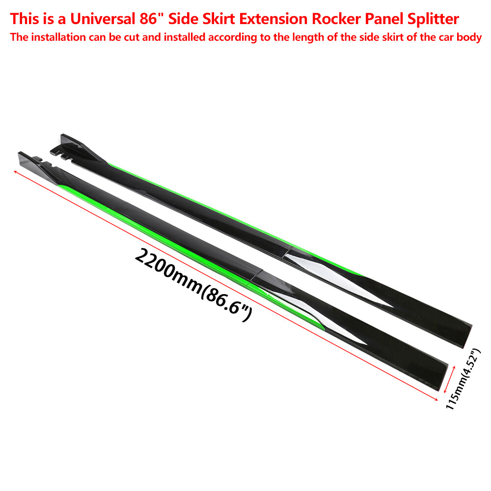 Universal 86 inches Side Skirt Extension Rocker Panel Splitter Can be cut according to the length of the side skirt of the car Suitable vehicle type: Fits for car universal: Honda,Toyota,Mazda,Subaru, Volkswagen,Acura,mitsubishi,Cadillac,lexus,Audi,BMW,Mercedes Benz,Ford,VOLVO,Hyundai,Nissan,Infiniti,Buick,Chevrolet,Kia,Dodge (You can contact us if you have any concerns). Feature: Made of Updated durable and sturdy ABS plastic, no deformation in long-term use. More longer and wider than others,Provide an elegant and personalized appearance. Prevent the car from being scraped and improve the level of the decoration of the car. Come with screws, More convenient installation and stable installation. Instruction Not Included, Professional Installation Is Highly Recommended. Specification: Type:side skirt Material:ABS Color:Black+Green Package Included: 1 x Set Of side skirt 1 x Bag Of screws Delivery details/Shipping and handing: 1. We will ship your order within 3 working days 2. If you didn't receive the item after 7 days, Please contact us, we'll investigate and solve the delivery problem. If you are satisfied with our service, please leave 5 Stars Rating Thanks! Terms of sales: 1. Please contact us before leaving a Negative feedback if you are not satisfied our service or products. Good communication is helpful for both of us to resolve any problems and issues. We are promising to try our best to provide the best service and 100% satisfaction for valuable buyer like you 2. All of the items are new. If it is not in new conditions, refund is offered. Otherwise, replacement can be offered for defective product. We will exchange or give the seller credit to buyer. 3. Customers are responsible for return shipment fee except for wrong shipment or defective products. About us: If you have any questions, please feel free to email our service specialists 24 Hours a Day, 7 Days a Week, and we will reply you ASAP. If no response within 24 Hours, please check the spam of mail box or kindly re-send it to us. We greatly appreciate your POSITIVE feedback. Please do NOT leave negative feedback without any contact. If you haven't received item in 30 days, please contact us and We will try our best to solve your problem ! We are the professional car decoration dealer, if you would like to make your car a shinny look, please contact us !!!