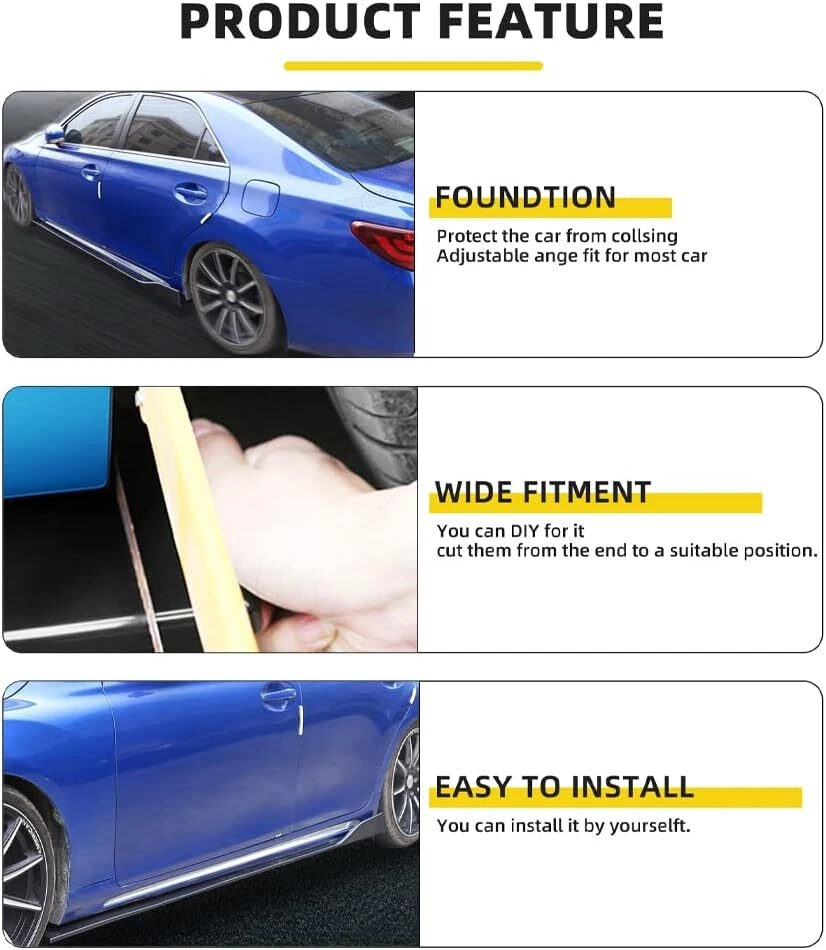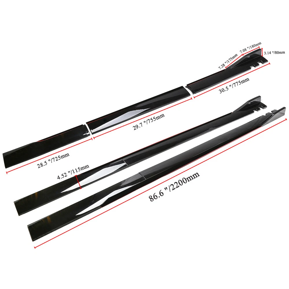 1.Front Bumper Lip Body Kit Spoiler Feature: Made of Updated durable and sturdy ABS plastic, adding stiffeners, no deformation in long-term use. Longer and wider than others. Provide an elegant and personalized appearance. Prevent the car from being scraped and improve the level of the decoration of the car. Adjustable angle, suitable for most models of Cars. Come with 2 blocks, More convenient installation, and stable adjustment. This is a set(4 pieces) front bumper cover lip front spoiler ***Instruction Not Included, Professional Installation Is Highly Recommended Specification: Type: Front Bumper Lip Body Kit Spoiler Material: High quality ABS Polyurethane Color: Glossy Black Weight: about 3.5 lbs Placement on Vehicle: Front; Lower Tough&Hard-wearing: Made from good-quality ABS Material with excellent abrasion-resistance and toughness, durable in use and NOT easy to deform. Dynamic Shape Design: With dynamic shape design, the front bumper lip can reduce wind resistance while driving. Protection: The sturdy materials of this front bumper lip can reduce damage and prevent the car from scratches. Advantages: 1.Prevent the car from being scraped and improve the level of the decoration of the car. 2.Reduce the wind resistance and disturbing effect. 3.Give 3D visual effect, Provide an elegant and personalized appearance 2.Side Skirt - Type: Side Skirt Extensions Splitters Diffuser, Side Skirt Extensions - Material: ABS - Color: Glossy Black -Length Size: 2.2m(Make Sure 2.2m Length is the size you WANT!) - Placement on Vehicle: Left & Right Feature Improve the appearance of the car, enhance the protection, and make the car stylish and cool Using matching bolts for easy installation(Screws and instruction are included). It requires drilling holes to attach the side skirts stably to the vehicle. (Application of double-sided tape may provide more stability and is very highly recommended. However, the double-sided tape is not included. ) Product may be trimmed to accommodate vehicle's side skirt length. ( Please measure your vehicles length before purchasing. ) Package Included 1 x Front Lip Chin Bumper Body Kits Pair of 2.2m Side Skirt Extensions (L&R) 10 x Screws -Note: -Please allow 1-5mm differs due to manual measurement. -Due to the different display and different light, the picture may not reflect the actual color of the item. Thanks for your understanding. - It's does not fit the car has a curve underneath by the back door.our item is straight.