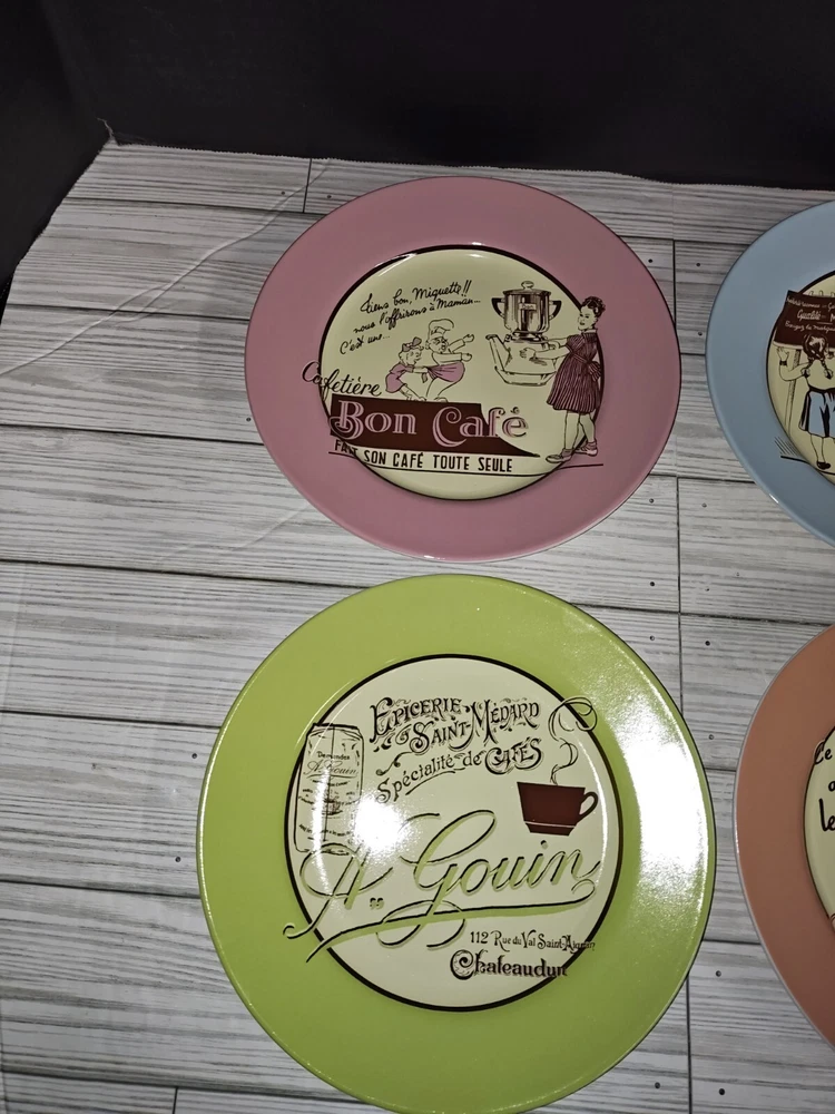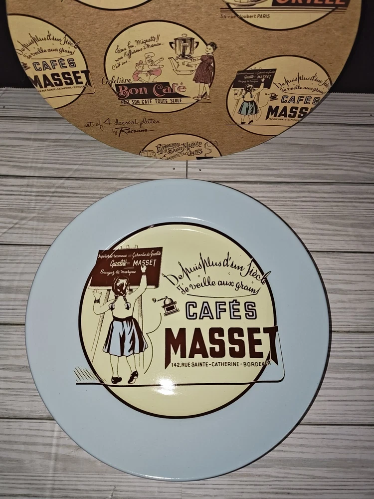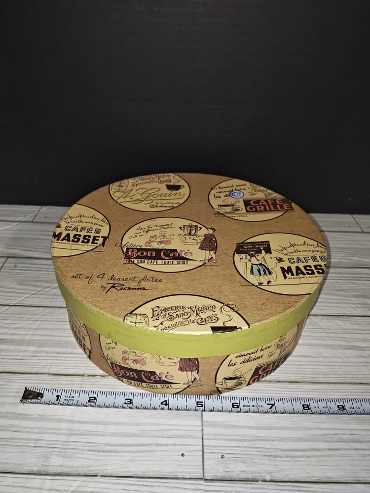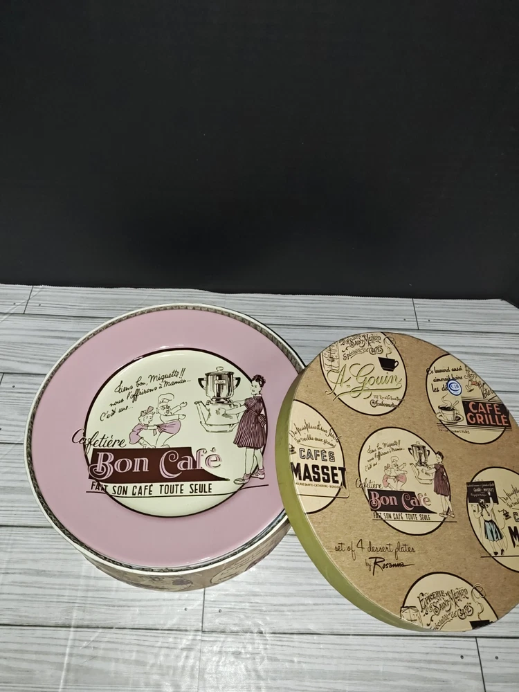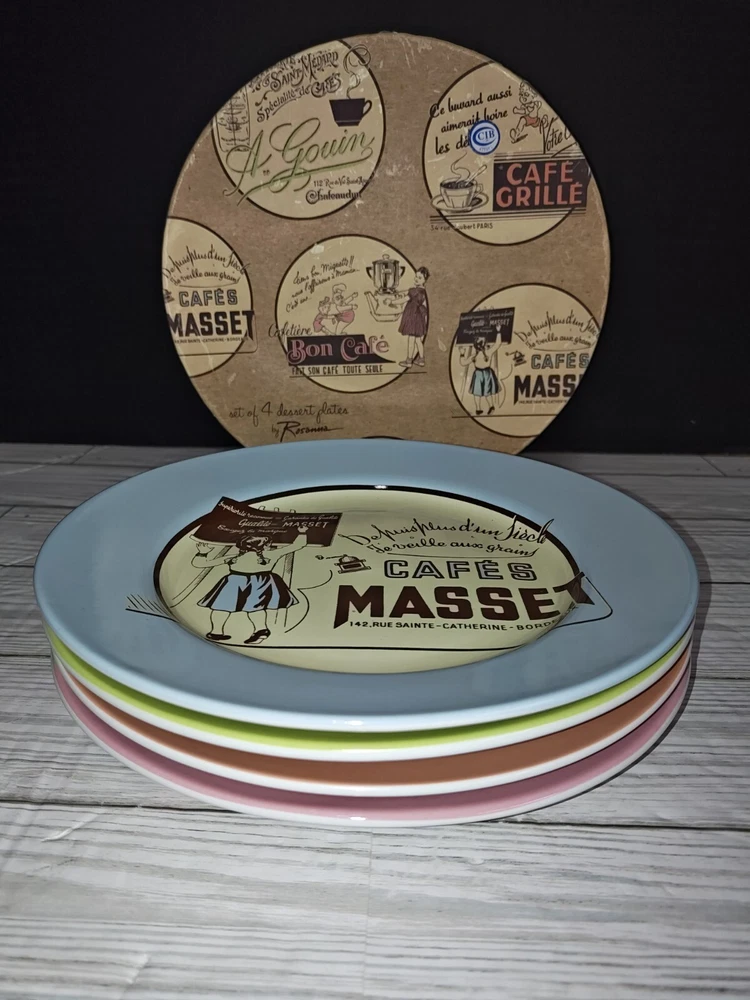 Colour: Multicoloured Pattern: France Time Period Manufactured: 2000-2009 Set Includes: Plate Set Country/Region of Manufacture: China Brand: Rosanna Finish: Glossy Vintage: Yes Style: Retro Number of Items in Set: Four-Piece Backstamp: Printed Shape: Round Type: Decorative Plate Product Line: Rosanna Material: Ceramic Theme: French Cafe Occasion: All Occasions Plate Diameter: 21cm Handmade: No Original/Licensed Reproduction: Original Production Style: Art Pottery Color: Multicolor Department: Adult, Teens Features: Decorative