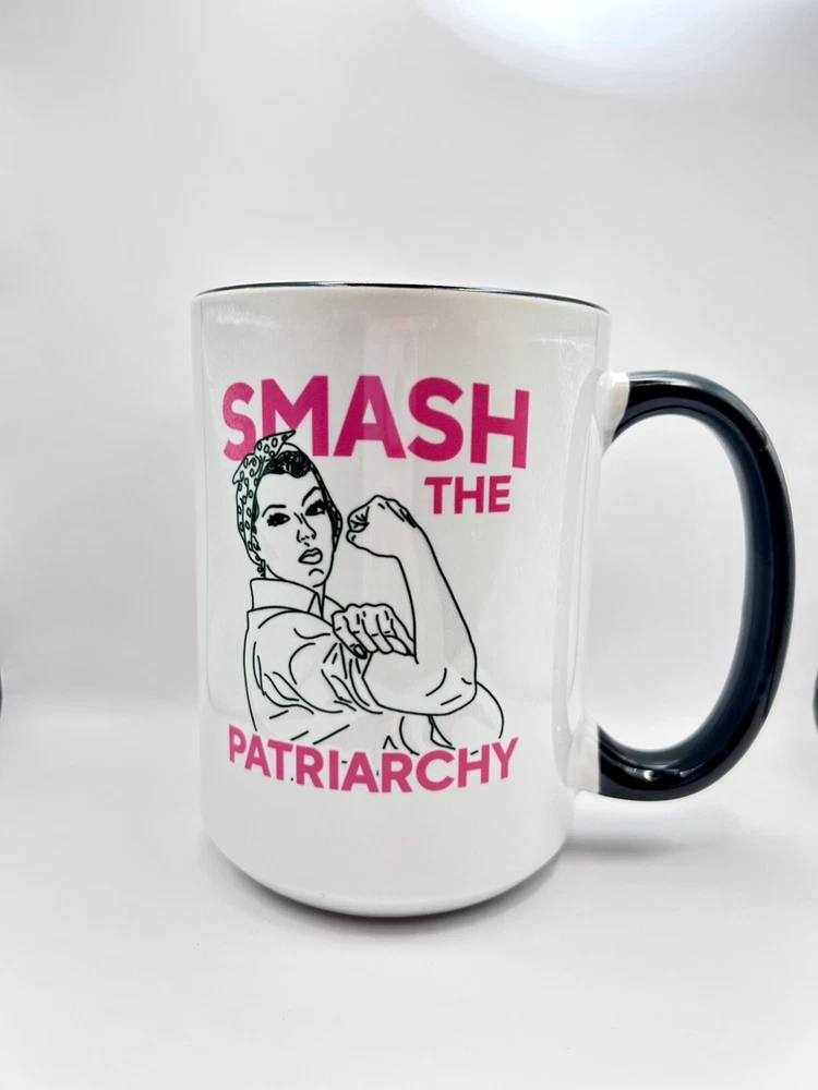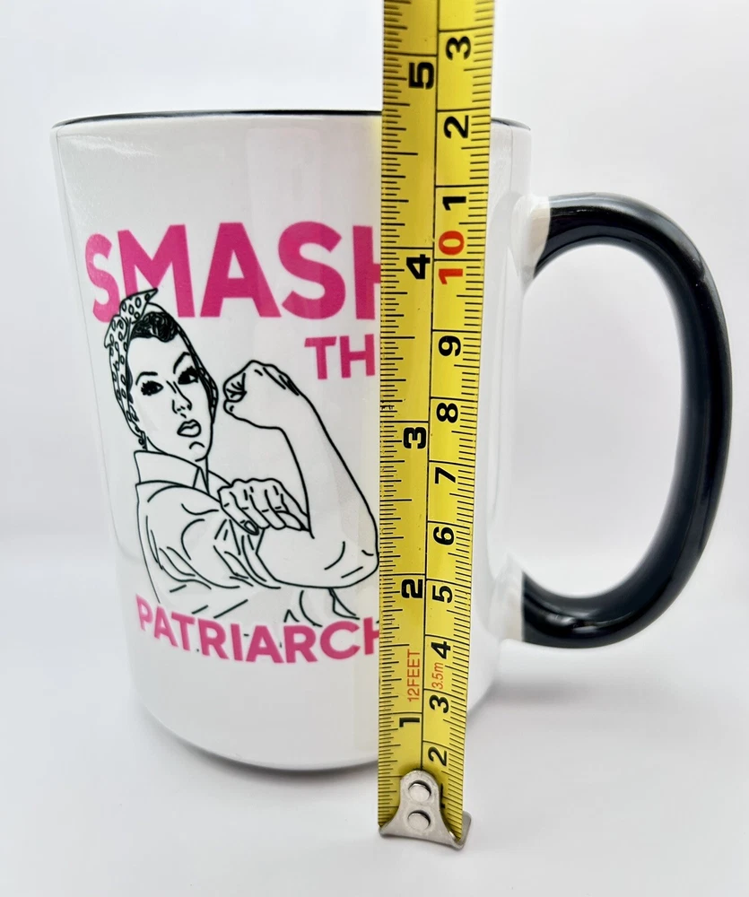 This CafePress Rosie The Riveter Smash Large Mug is a ceramic coffee mug with a white exterior and black interior. It features a professionally printed design, portraying Rosie the Riveter. The mug is microwave and top shelf dishwasher safe, making it convenient for everyday use. Made in the United States, this mug is a great addition to any kitchen or a thoughtful gift for someone who appreciates iconic imagery.