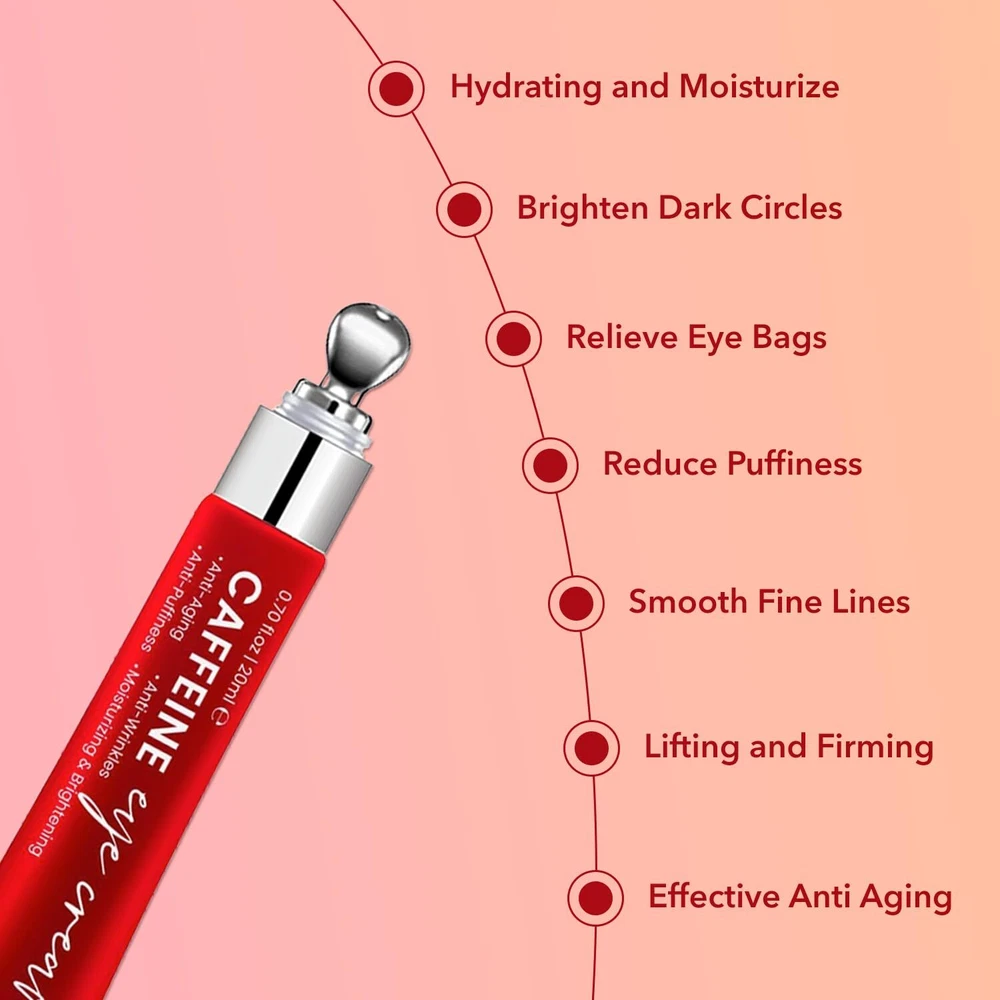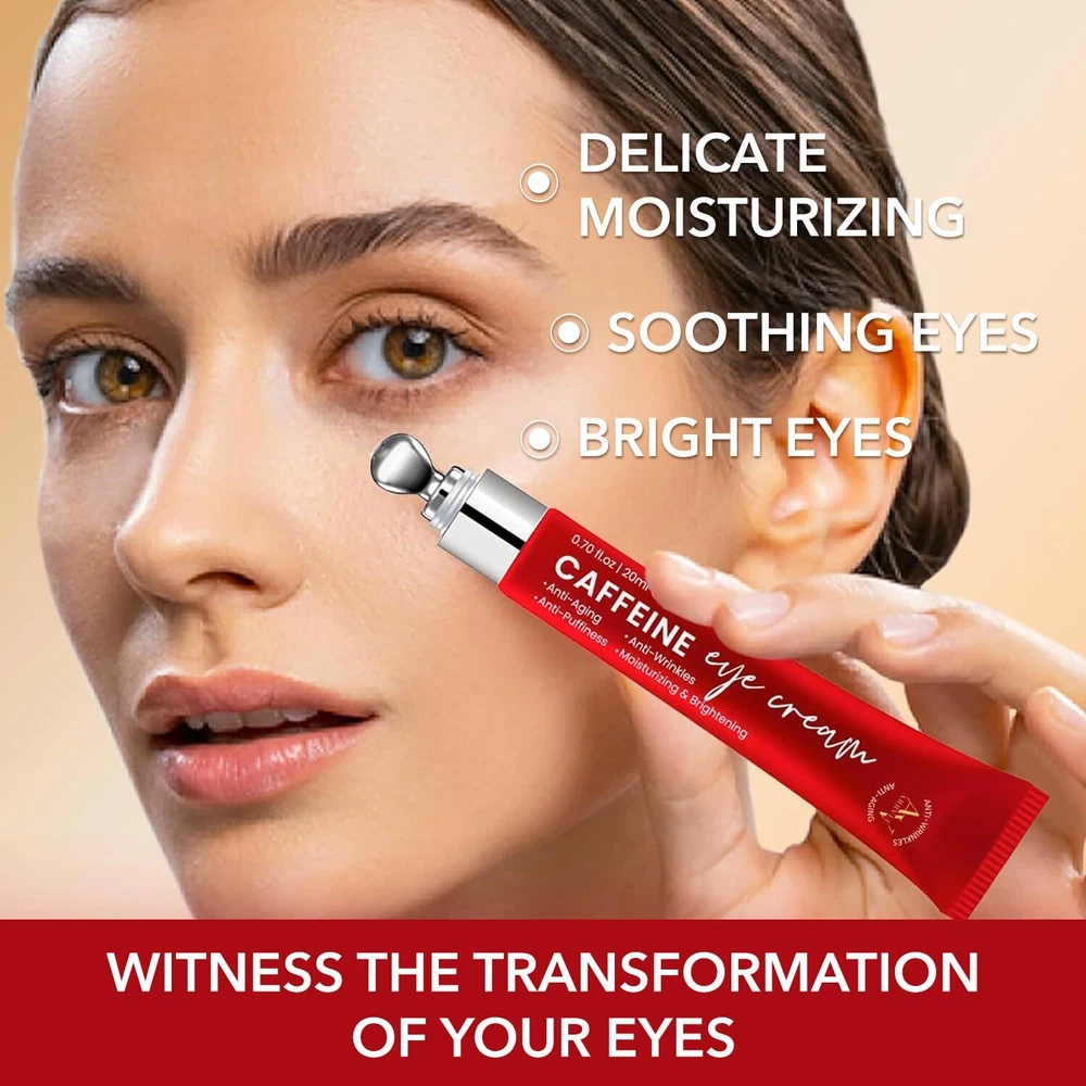 Caffeine Eye Cream for Anti Aging: Under eye cream for dark circles, Eye wrinkle, Anti Puffiness - Anti Aging Caffeine Eye cream For Under Eye Bags And Puffy Eyes 0.7 oz Product Details Brand: MEOLY Item Volume: 0.7 Fluid Ounces Item dimensions L x W x H: 5.3 x 1.1 x 0.8 inches Age Range (Description): Adult Special Feature: Water Resistant CAFFEINE EYE CREAM ANTI-AGING SOLUTION: MEOLY Caffeine eye cream specially formulated with strong anti-aging ingredients like Retinol, Caffeine, Sodium Hyaluronate, Vitamin E. It reduces dark circles, puffiness, wrinkles, fine lines, and sagging eyelids caused by lack of sleep. Use it twice a day, morning and night, for a more refreshed and youthful look. DARK CIRCLES, WRINKLES, FINE LINES TREATMENT: Hydrating and Nourishing, MEOLY eye cream is made with proven ingredients that prevent skin contraction, boost eye metabolism, and reduce inflammation. It moisturizes the skin around your eyes, smoothing out fine lines and wrinkles for long-lasting hydration. REPAIR, RESTORE & REPEAT: Our Retinol eye cream for anti aging has a silky, lightweight texture. It absorbs quickly and leaves your skin smooth without feeling greasy. You can easily layer it with other moisturizers and creams, repairing the skin under the eye making it perfect for dark circles under the eyes. RELAXING COOLING ROLLER: Our Anti Aging eye cream comes with a cooling roller for a soothing massage experience. Simply glide the roller over the eye area to help the cream absorb efficiently. Treat yourself or someone you love to this refreshing eye bag care for women. GENTLE SUITABLE FOR ALL SKIN: Our Caffeine eye cream for Anti Aging is suitable for all skin types, including sensitive skin. It is from safely selected materials, making it safe and gentle to use.