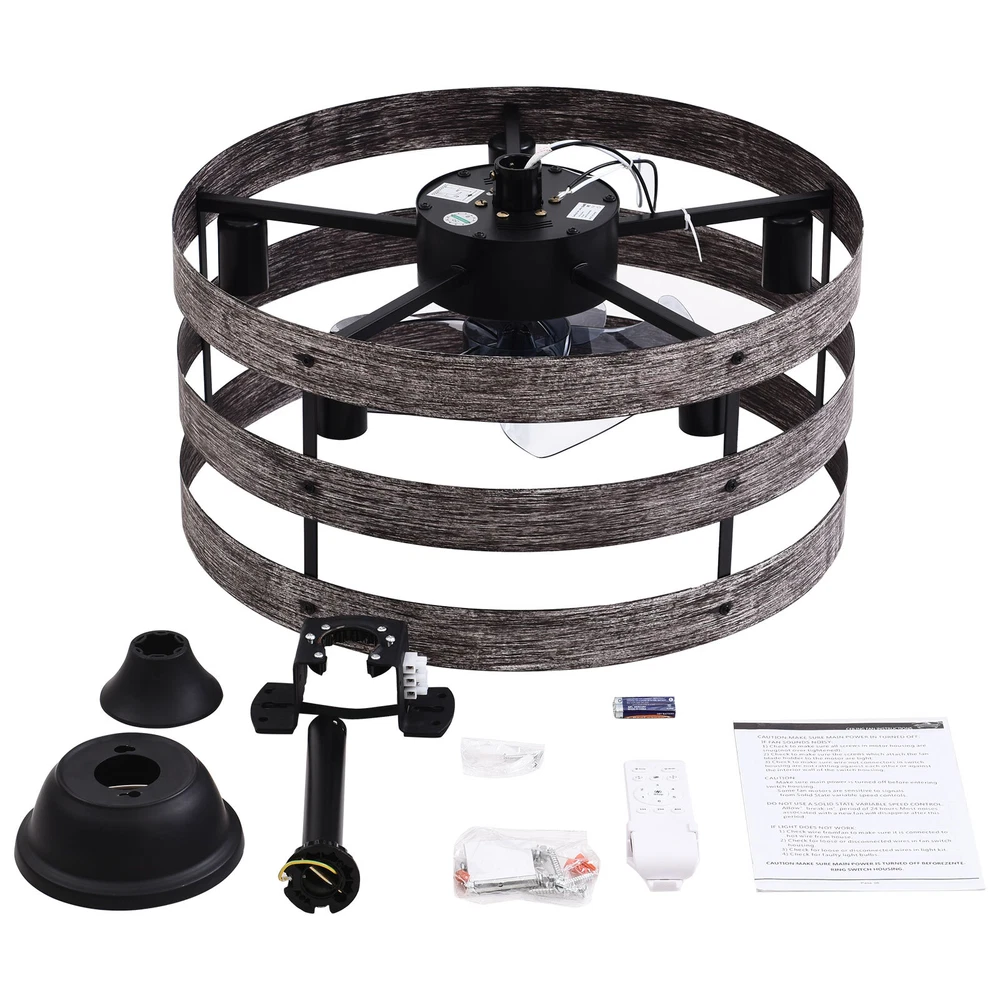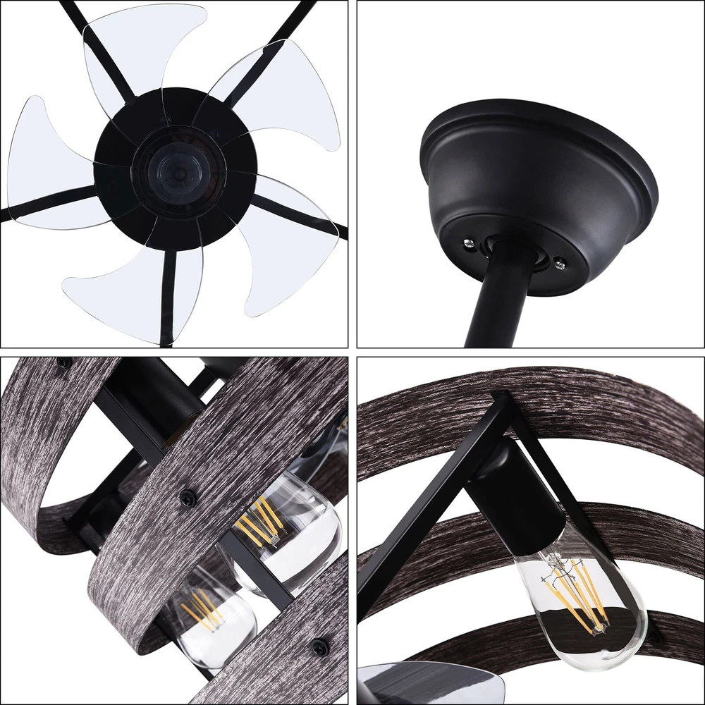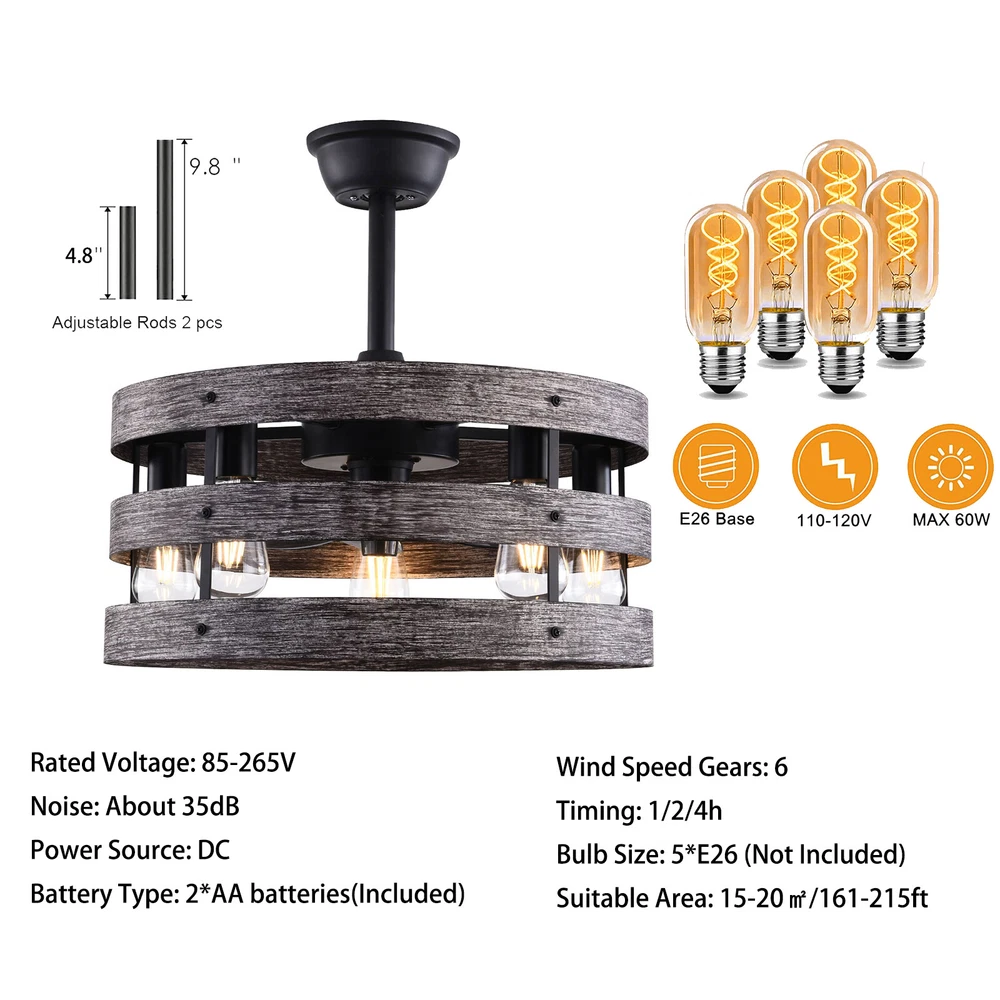 Specifications Color: Gray, Black Material: Metal, ABS Style: Modern Type: US Standard Shape: Round Surface Treatment: Baking Paint Electric Fan Design: Ceiling Fan Room Type: Bedroom, Living Room, Dining Room, Living Room, Kitchen Controller Type: Frequency Conversion Remote Control Motor Type: Pure Copper Assembly Required: Yes Mounting Type: Ceiling Mount Number of Fan Blades: 5 Number of Items: 1 Rated Voltage: 85-265V Max. Bulb Power(Each): 40W Power Source: DC Battery Type: 2*AA batteries(Included) Wind Speed Gears: 6 Timing: 1/2/4h Bulb Size: 5*E26 (Not Included) Suitable Area: 15-20㎡/161-215ft² Noise: About 35dB Base Diameter: 15cm/5.9inch Lampshade Size(L*H): 48*18cm/18*7.09inch Rod Height: 25cm/9.8inch, 12cm/4.8inch Caged Ceiling Fan with Light,Farmhouse Ceiling Fan with Remote Control,Rustic Description This 2-in-1 ceiling fan light allows you to feel the bright light and enjoy the coolness at the same time. It has six gears of wind speeds with a timing function to meet your daily usage needs, and y ou can also reverse the direction of the fan in winter. It can be integrated with different decoration styles and is ideal to create an excellent life and sleep environment to accompany you in all seasons. Specifications Color: Gray, Black Material: Metal, ABS Style: Modern Type: US Standard Shape: Round Surface Treatment: Baking Paint Electric Fan Design: Ceiling Fan Room Type: Bedroom, Living Room, Dining Room, Living Room, Kitchen Controller Type: Frequency Conversion Remote Control Motor Type: Pure Copper Assembly Required: Yes Mounting Type: Ceiling Mount Number of Fan Blades: 5 Number of Items: 1 Rated Voltage: 85-265V Max. Bulb Power(Each): 40W Power Source: DC Battery Type: 2*AA batteries(Included) Wind Speed Gears: 6 Timing: 1/2/4h Bulb Size: 5*E26 (Not Included) Suitable Area: 15-20㎡/161-215ft² Noise: About 35dB Base Diameter: 15cm/5.9inch Lampshade Size(L*H): 48*18cm/18*7.09inch Rod Height: 25cm/9.8inch, 12cm/4.8inch Key Features Stylish Appearance: Fashionable colors(black and gray)and delicate lines make it very stylish and can be a good decoration to blend in with different decor styles and add color to your room. Embrace Smart Life : Applied with remote control, you can easily adjust the wind speeds and timer while lying in bed and don't need to get up and press the switch, bringing more convenience to your life. Healthy and Energy-saving: The ceiling fan light provides more comprehensive air circulation and cooling, thereby reducing the frequency and time of air conditioning use, saving energy, and reducing expenses. It can avoid direct blowing and reduce the risk of air conditioning diseases. Build to last : The lampshade is made of high-quality metal and adopts a paint baking process , which is heat-resistant, strong, durable, and not easy to deform. The fan blades are made of ABS, which has high strength, good toughness, and good formability, which can ensure a smooth surface and good gloss. Multiple Functions: Integrating lighting and fans, illuminating the space while balancing room temperature, has become a new choice for home fashion! You can also reverse the direction of the fan in winter, blowing hot air from the top into the room and increasing the indoor temperature. High Safety: Five ABS blades are hidden in a semi-enclosed lampshade, which can allow for unobstructed lighting and air supply to avoid accidents caused by getting caught in the blades, making it much safer than traditional fans. Adjustable Speed&Working Time: It has 6 gears of wind speed and you can choose low speed to enjoy the comfortable breeze or high speed to cool down quickly. Meanwhile, You can control its working hours in advance (1/2/4 hour), so you don't have to worry about catching a cold or wasting electricity. Wide Application: T he equipped two rods(4.8", 9.8") make it suitable for a variety of ceiling heights while ensuring better lighting and air circulation effect. And it supports a wide voltage, which can adapt to different voltage environments. Easy to Clean : The smooth and flat shell, as well as the detachable fan blades, make this product easy to clean. You only need to clean it with a dry cloth, saving you lots of time and effort. Guaranteed Customer Service: We aim to provide quality products and services. If you have problems, please feel free to contact us. We will reply and solve the problem for you as soon as possible. Details Upgraded Blades: The fan blades adopt an aerodynamic design, providing a stable and powerful air supply with low noise. Solid Base: The thickened and enlarged base( 5.9inch )will bring stronger load-bearing capacity and stability. Pure Copper Motor: It has stable performance, low-temperature rise, and low noise(About 35dB), providing a quiet working and sleeping environment. Meanwhile, there are a lot of heat dissipation holes on the motor shell, which can provide a good heat dissipation effect to ensure the stable operation and long service life of the motor. E26 Lamp Holders: This product uses the standard E26 lamp base to facilitate the installation of various bulbs. Application It is suitable for the living room, dining room, kitchen, study bedroom, small bedroom, conference room, and other places of 15-20㎡/161-215ft². Package Included 1* Ceiling Fan Light 1* English Manual 1* Remote Control 2* AA Batteries All Accessories for Assembly Notes Please cut off the power supply when cleaning. This product does not include a light bulb. Please prepare four E26 bulbs in advance. Please read the manual completely before installation and use, and pay particular attention to the safety instructions included. Please allow the slight color difference caused by the shooting light and 1-3cm error due to manual measurement, and make sure you do not mind before you order. Payment Delivery details Terms of sales About us Contact us Payment We accept ebay payment 。 Fees such as import duties, taxes are not included in the item price or shipping