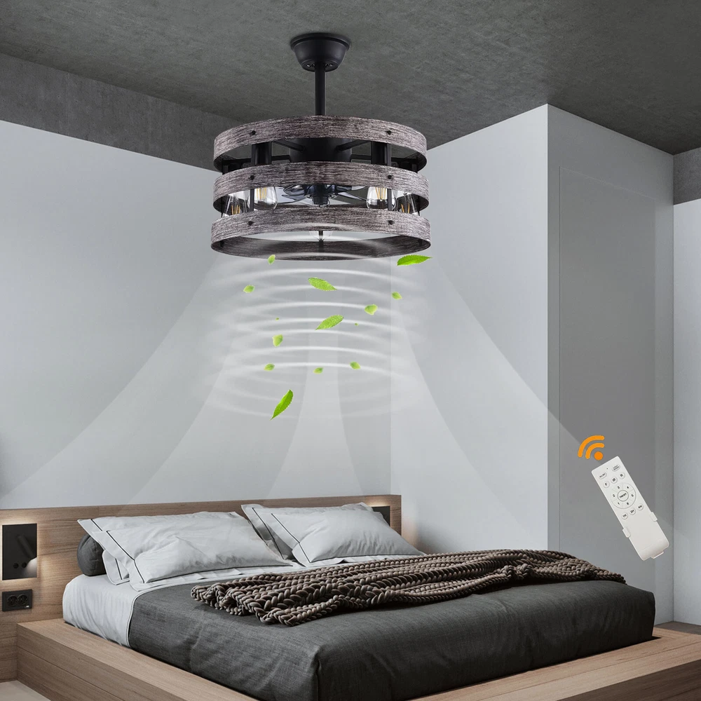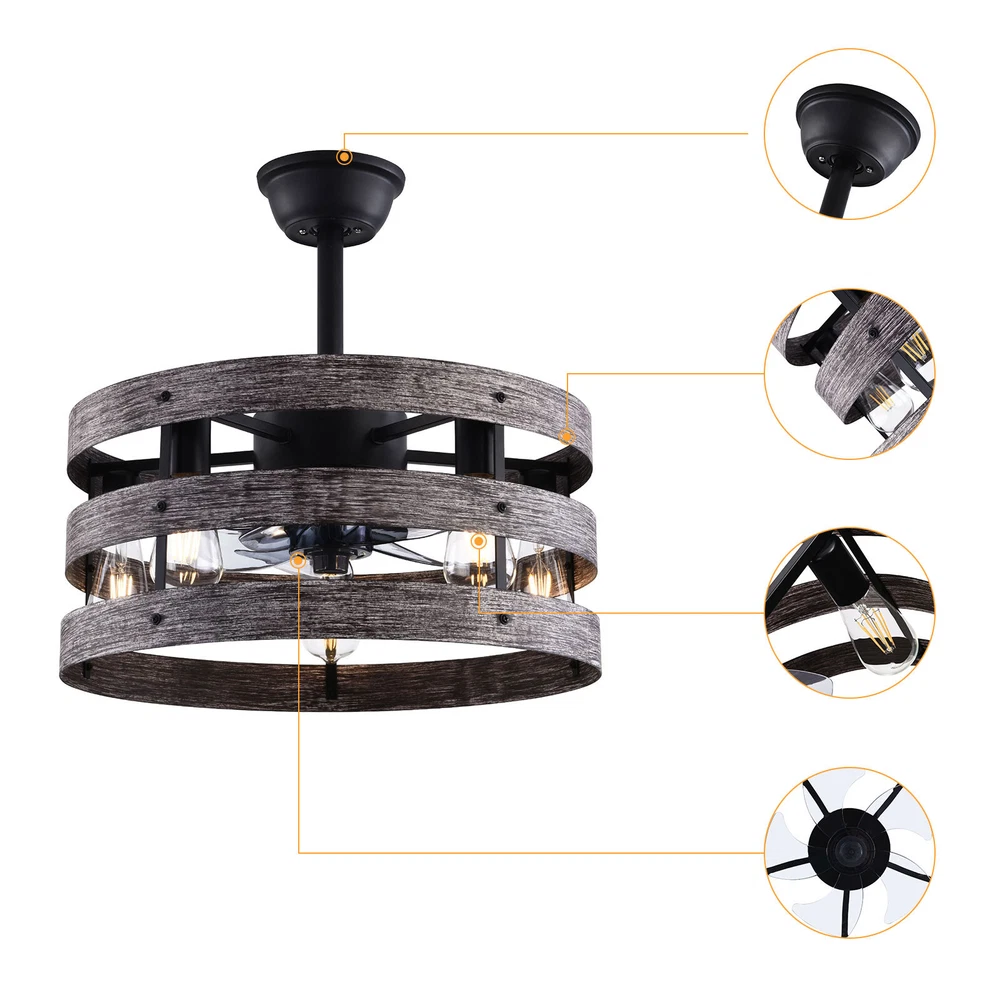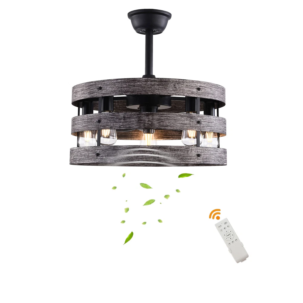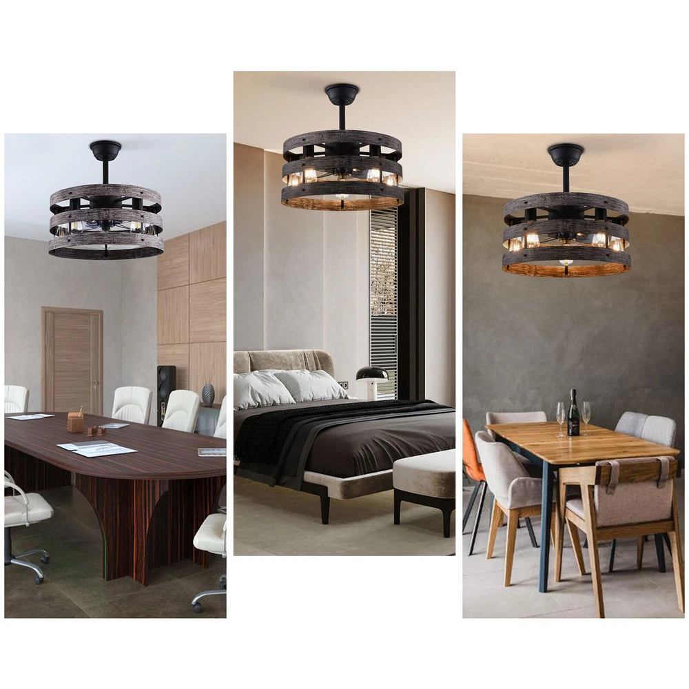 Specifications Color: Gray, Black Material: Metal, ABS Style: Modern Type: US Standard Shape: Round Surface Treatment: Baking Paint Electric Fan Design: Ceiling Fan Room Type: Bedroom, Living Room, Dining Room, Living Room, Kitchen Controller Type: Frequency Conversion Remote Control Motor Type: Pure Copper Assembly Required: Yes Mounting Type: Ceiling Mount Number of Fan Blades: 5 Number of Items: 1 Rated Voltage: 85-265V Max. Bulb Power(Each): 40W Power Source: DC Battery Type: 2*AA batteries(Included) Wind Speed Gears: 6 Timing: 1/2/4h Bulb Size: 5*E26 (Not Included) Suitable Area: 15-20㎡/161-215ft² Noise: About 35dB Base Diameter: 15cm/5.9inch Lampshade Size(L*H): 48*18cm/18*7.09inch Rod Height: 25cm/9.8inch, 12cm/4.8inch Caged Ceiling Fan with Light,Farmhouse Ceiling Fan with Remote Control,Rustic Description This 2-in-1 ceiling fan light allows you to feel the bright light and enjoy the coolness at the same time. It has six gears of wind speeds with a timing function to meet your daily usage needs, and y ou can also reverse the direction of the fan in winter. It can be integrated with different decoration styles and is ideal to create an excellent life and sleep environment to accompany you in all seasons. Specifications Color: Gray, Black Material: Metal, ABS Style: Modern Type: US Standard Shape: Round Surface Treatment: Baking Paint Electric Fan Design: Ceiling Fan Room Type: Bedroom, Living Room, Dining Room, Living Room, Kitchen Controller Type: Frequency Conversion Remote Control Motor Type: Pure Copper Assembly Required: Yes Mounting Type: Ceiling Mount Number of Fan Blades: 5 Number of Items: 1 Rated Voltage: 85-265V Max. Bulb Power(Each): 40W Power Source: DC Battery Type: 2*AA batteries(Included) Wind Speed Gears: 6 Timing: 1/2/4h Bulb Size: 5*E26 (Not Included) Suitable Area: 15-20㎡/161-215ft² Noise: About 35dB Base Diameter: 15cm/5.9inch Lampshade Size(L*H): 48*18cm/18*7.09inch Rod Height: 25cm/9.8inch, 12cm/4.8inch Key Features Stylish Appearance: Fashionable colors(black and gray)and delicate lines make it very stylish and can be a good decoration to blend in with different decor styles and add color to your room. Embrace Smart Life : Applied with remote control, you can easily adjust the wind speeds and timer while lying in bed and don't need to get up and press the switch, bringing more convenience to your life. Healthy and Energy-saving: The ceiling fan light provides more comprehensive air circulation and cooling, thereby reducing the frequency and time of air conditioning use, saving energy, and reducing expenses. It can avoid direct blowing and reduce the risk of air conditioning diseases. Build to last : The lampshade is made of high-quality metal and adopts a paint baking process , which is heat-resistant, strong, durable, and not easy to deform. The fan blades are made of ABS, which has high strength, good toughness, and good formability, which can ensure a smooth surface and good gloss. Multiple Functions: Integrating lighting and fans, illuminating the space while balancing room temperature, has become a new choice for home fashion! You can also reverse the direction of the fan in winter, blowing hot air from the top into the room and increasing the indoor temperature. High Safety: Five ABS blades are hidden in a semi-enclosed lampshade, which can allow for unobstructed lighting and air supply to avoid accidents caused by getting caught in the blades, making it much safer than traditional fans. Adjustable Speed&Working Time: It has 6 gears of wind speed and you can choose low speed to enjoy the comfortable breeze or high speed to cool down quickly. Meanwhile, You can control its working hours in advance (1/2/4 hour), so you don't have to worry about catching a cold or wasting electricity. Wide Application: T he equipped two rods(4.8", 9.8") make it suitable for a variety of ceiling heights while ensuring better lighting and air circulation effect. And it supports a wide voltage, which can adapt to different voltage environments. Easy to Clean : The smooth and flat shell, as well as the detachable fan blades, make this product easy to clean. You only need to clean it with a dry cloth, saving you lots of time and effort. Guaranteed Customer Service: We aim to provide quality products and services. If you have problems, please feel free to contact us. We will reply and solve the problem for you as soon as possible. Details Upgraded Blades: The fan blades adopt an aerodynamic design, providing a stable and powerful air supply with low noise. Solid Base: The thickened and enlarged base( 5.9inch )will bring stronger load-bearing capacity and stability. Pure Copper Motor: It has stable performance, low-temperature rise, and low noise(About 35dB), providing a quiet working and sleeping environment. Meanwhile, there are a lot of heat dissipation holes on the motor shell, which can provide a good heat dissipation effect to ensure the stable operation and long service life of the motor. E26 Lamp Holders: This product uses the standard E26 lamp base to facilitate the installation of various bulbs. Application It is suitable for the living room, dining room, kitchen, study bedroom, small bedroom, conference room, and other places of 15-20㎡/161-215ft². Package Included 1* Ceiling Fan Light 1* English Manual 1* Remote Control 2* AA Batteries All Accessories for Assembly Notes Please cut off the power supply when cleaning. This product does not include a light bulb. Please prepare four E26 bulbs in advance. Please read the manual completely before installation and use, and pay particular attention to the safety instructions included. Please allow the slight color difference caused by the shooting light and 1-3cm error due to manual measurement, and make sure you do not mind before you order. Payment Delivery details Terms of sales About us Contact us Payment We accept ebay payment 。 Fees such as import duties, taxes are not included in the item price or shipping