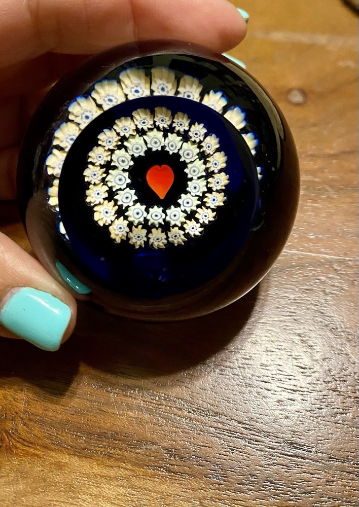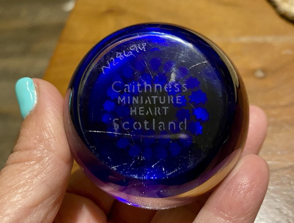 The Caithness Miniature Heart Art Glass Paperweight is a beautifully crafted decorative piece made in Scotland. This unique paperweight is numbered #N28694 features a multicolored millefiori design, adding a touch of elegance to any space. With its art glass production style, this paperweight showcases the brand's attention to detail and quality craftsmanship, making it a beautiful addition to any collection of decorative pottery and glassware.