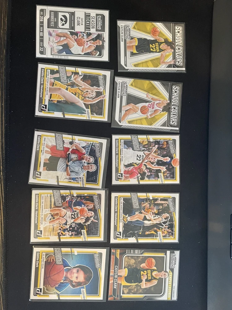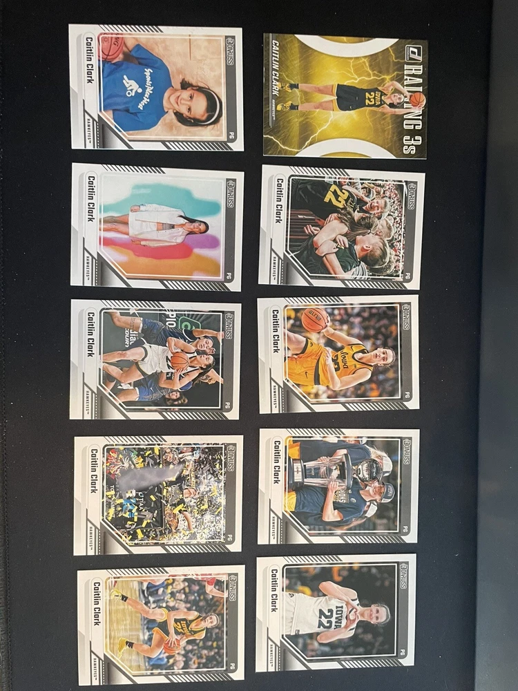 This is a fantastic 14-card lot of Caitlin Clark, a rising star in the world of sports trading cards. The set comes from the 2024 Donruss Clark Collection, and features the rookie card of this talented athlete. The cards are manufactured by Panini, a well-known name in the industry. The lot includes cards from various types of sports trading cards, and is perfect for collectors and fans alike. Whether you're a fan of Caitlin Clark or simply appreciate the artistry and quality of these cards, this lot is sure to impress. Don't miss your chance to own a piece of sports history.