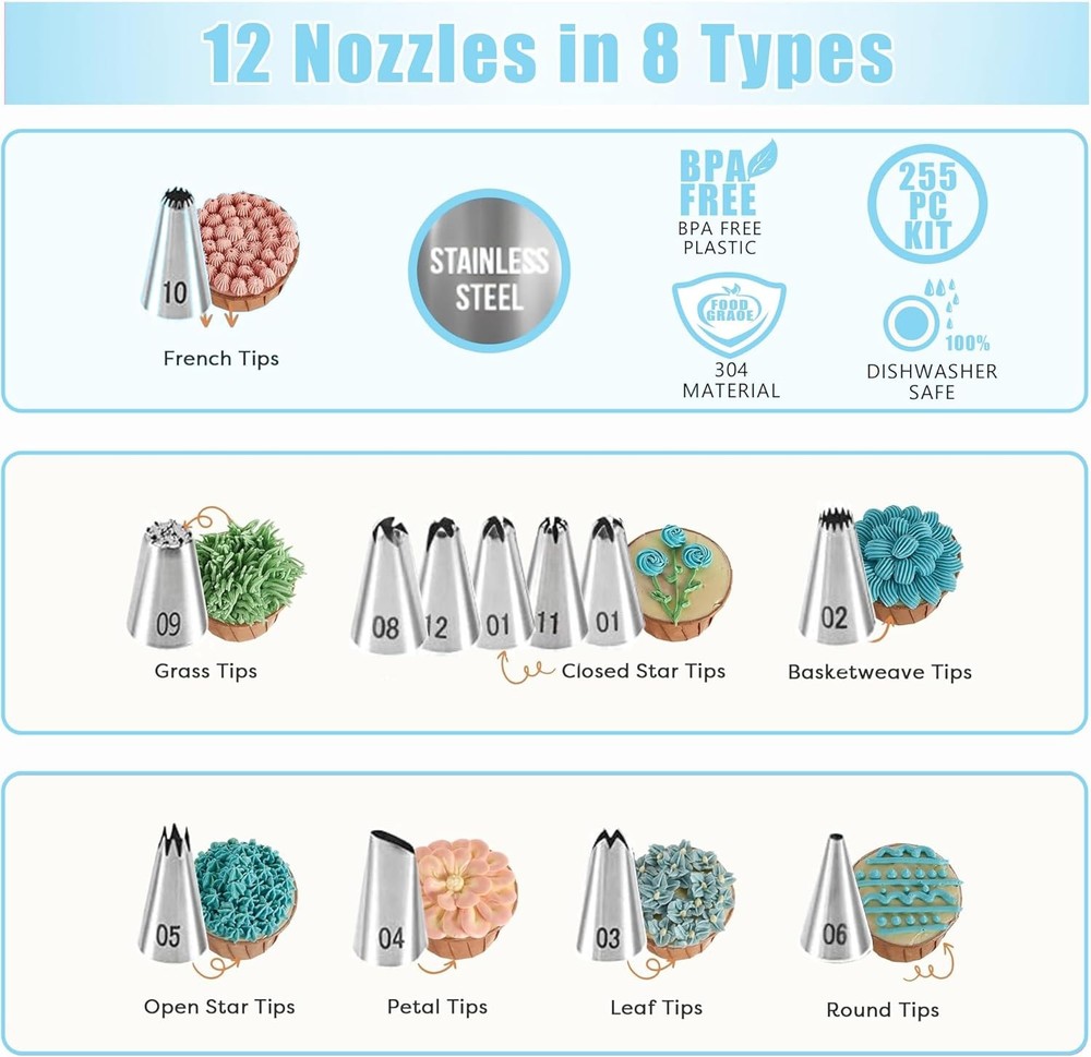 Free eBay listing template designed by dewiso.com Cake Decorating Supplies Kit Tools 255pcs, Cake Decorating Set with Cake Turntable, 12 Numbered Icing Piping Tips, Cookie Cutters, Icing Smoother & Other Accessories for Cake Decoration (Blue-255 PCS) FREE AND FAST SHIPPING! About this item Safe Materials: All accessories made of high quality 304 Stainless Steel, plastic and silicone; Sturdy safe for family cake making; Dishwasher Safety Cake Decorating Supplies Fondant Mold: 14pcs base mould that can print graphics and Patterns on cakes, diy cake, flexible combination, directly carved on the surface of the cake, use before baking supplies the cake Piping Bags and Tips Set: Includes 12 numbered icing piping tips, 50 disposable & 1 reusable 12” frosting pasty bags; Allow you to create a variety of designs, including simple dots and lines as well as intricate flowers and leaves; The included coupler makes changing tips on your piping bags a breeze without emptying the bag or creating any mess Revolving Cake Turntable: This cake turntable stand revolve smoothly with hidden ball bearings and helps you easily decorate cakes for birthdays, weddings and other events; It revolves clock & anti clock wise, good for both Right & Left handers; Use straight spatula for icing round cakes from sides and angled spatula from Top while rotating turntable Perfect for Various Occasions: With these baking accessories, you can create professional-looking cupcakes, cakes, bread, biscuits, and other desserts for different occasions, such as birthdays, weddings, Mother's Day, Christmas, Easter, housewarming, or anniversaries; Create beautiful and inviting desserts that will impress your guests at many event Product We offer a 30-Day Return Policy on items which you are not completely satisfied with. You have the option for a full-refund or an exchange of the item. No returns are available on items shipped outside of the US . Shipping We offer Free Shipping to the US and ship within 2 business days of payment, usually sooner. We use UPS express shipping. That's why your products are usually delivered within 3 days . Contact We try our very best to make sure every customer is completely satisfied. If there's a problem , message us! We're happy to help. 24/7 live chat available.
