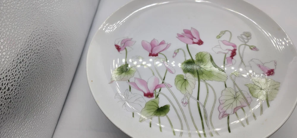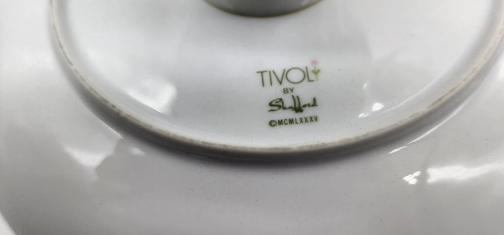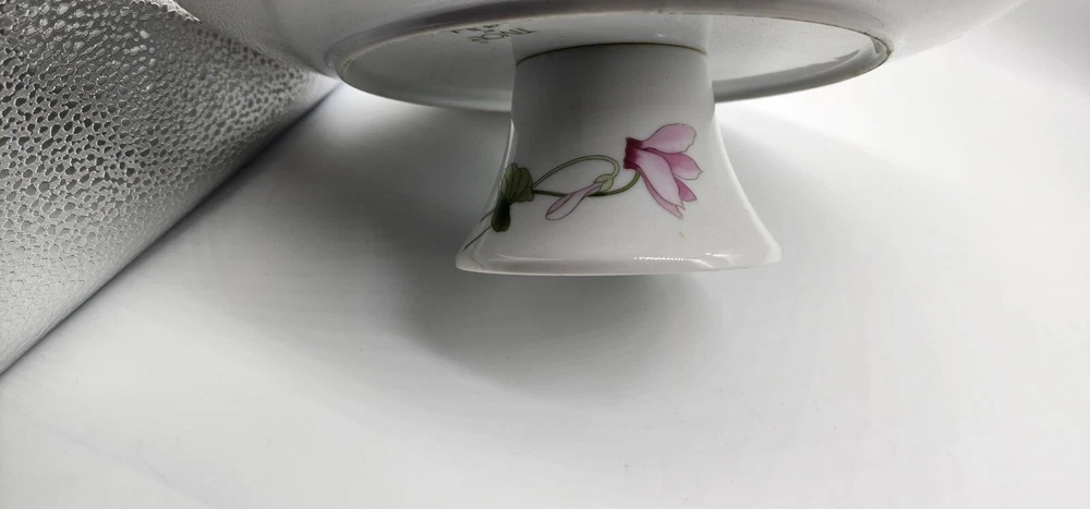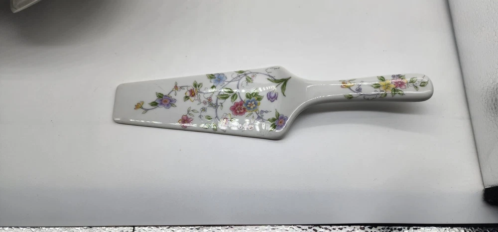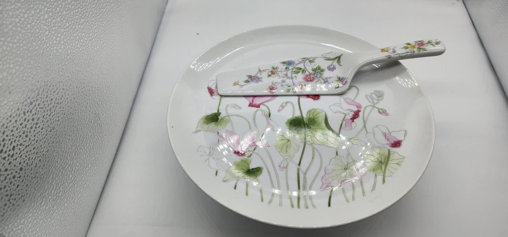 This cake pedestal and server is in great condition with no chips or cracks that can be seen. I is 3 1/4" tall and 10 1/2" in diameter. The server is 10" long.