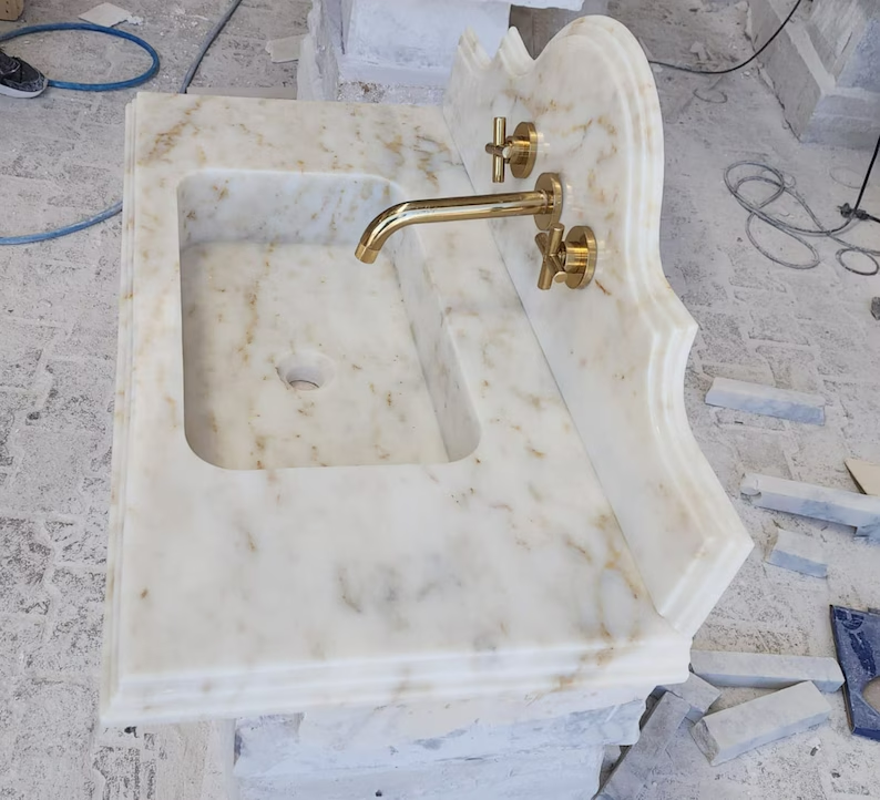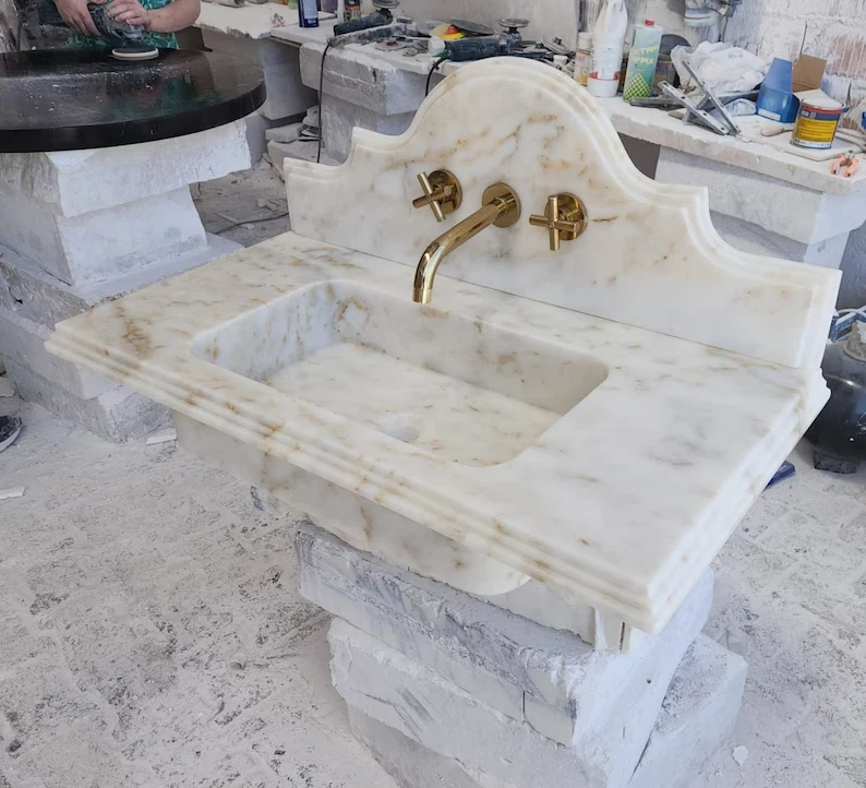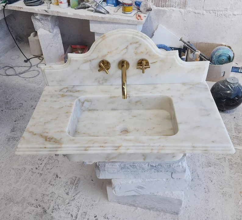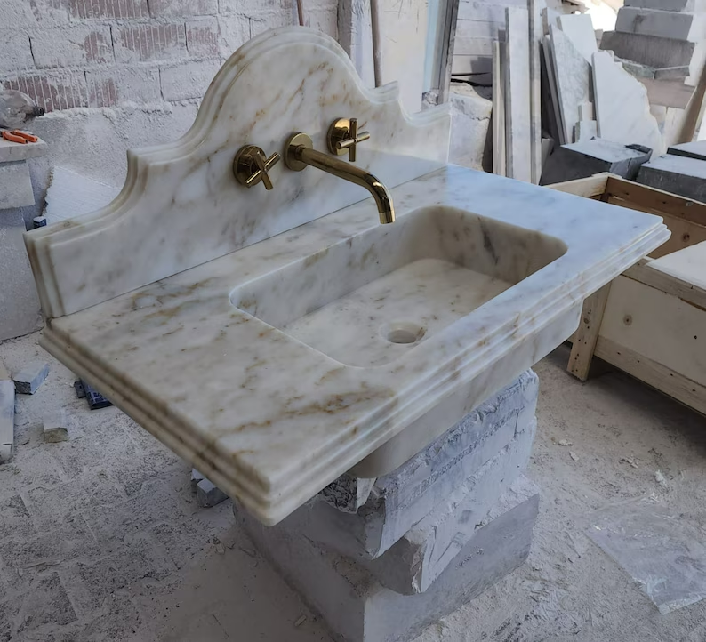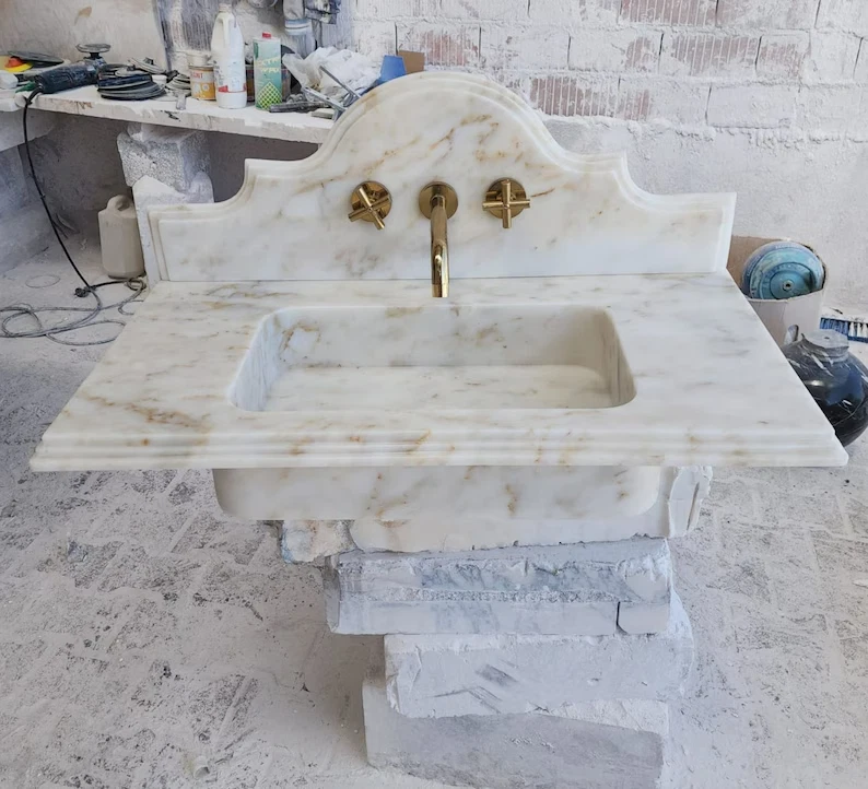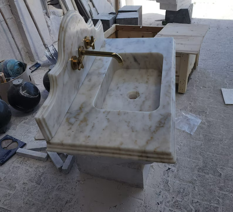 Dimensions:18"(W) 36"(L) 5"(H) Backsplash:12 Calacatta Viola Marble Sink With Ribbed on Three Side, Marble Sink, Custom Order Marble Sink, Hand Carved Marble Sink, Wall Mount Sink You can request special sizes and marble types. The products are sent in special crates wrapped in foam and air bags. It is very unlikely to reach you broken and cracked. However, if you encounter such a situation, you can quickly check and contact us when you open the crate. We will send a new one. The products are made by hand using natural stone marble. Especially in multi-patterned products, it is almost impossible for the patterns and color tones to be the same as in the photo (Calacatta viola). For this reason, we have to tolerate 10-20% difference in patterns and color tones. If you send us a message (specify your location) when you decide to order, we can help you with customs clearance.