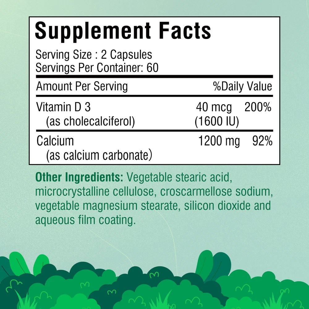 Effects: Immune Support,Muscle Health Ingredients: Calcium,Vitamin D3 Directions: Take 2 capsules once daily after a meal. Shipping: Ships within 48 hours on working days. Shelf life: 2 years Description: Bone & Teeth Support: Our potent calcium carbonate formula supports strong bones and teeth health. Immune Support: Fortified with Vitamin D3, our calcium and vitamin D supplement provides potent bone and immune support. Free of gluten, wheat, yeast, milk, lactose, flavors and non-GMO. Document
