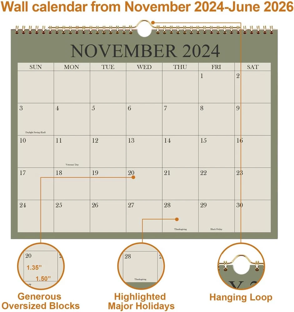 Store New Arrivals Add to Favorite View Feedback Contact Fast deliveries to the customer's home Quality customer service John Make the customers happy! Calendar 2024-2025, Wall Calendar from November 2024 - June 2026, 20 Months Calendar with Premium Paper, Twin-Wire Binding & Hanging Hook, 8.5" X 11", Green Description 2024-2025 CALENDAR - 21 months wall calendar run from November 2024 - June 2026, the size of this 2025 wall calendar is 8.5" x 11", focus on easy and efficient planning, scheduling and tracking for a manageable life. MONTHLY OVERVIEW - Wall Calendar 2024-2025 monthly page with daily blocks. Wall calendars each block is 1.35”×1.5” and large writing space for daily scheduling. Monthly overview to help you organize your work and life well. STURDY WIRE BINDING - The monthly calendar 2024-2025 with strong twin-wire binding and the hanging loop helps the wall calendar 2025-2026 hangs on the wall easily and sturdy. PREMIUM QUALITY - Using 120 gsm high quallity paper for this 2024-2025 wall planner. The thick, matte paper allows smooth writing and prevents ink bleeding, make it fits most pens. IMPROVE LIFE EFFICIENCY & MANAGEMENT - The calendar planner 2024-2025 can help you become more efficient and you can control your own life with the help of our calendar. Live your own life and become a better version of yourself with this 2025 monthly wall calendar! FIND MORE ABOUT THIS ELEGANT 2024-2025 WALL CALENDAR Features of this calendar 2024-2025: 21 Months Calendar from November 2024 - June 2026. Page size is 8.5 x 11.5 inch. Strong twin-wire binding and the hanging loop. Writing blocks (1.35" x 1.5") for scheduling. Using 120 gsm high quallity paper prevents ink bleeding. Remind you every important holidays with your life. Beautiful monthly calendar 2024-2025 can help you become more efficient and you can control your own life. Item model number WALL-CALENDAR-8-11-GREEN-4C Color Cyan Manufacturer Part Number WALL-CALENDAR-8-11-GREEN-4C Item Weight 5.3 ounces Product Dimensions 8.5"W x 11"H Size 12" x 14.5" ABOUT US We offer the best prices around on high quality products. Our E-store includes media such as books, movies, music and games while offering electronics, toys, sporting apparel, clothing, tools, general home, garden items and more. SHIPPING We are always working hard to ensure your package arrives as soon as possible. Please understand that some factors like weather, high postal traffic, and the performance of shipping companies are outside of our control. We offer free shipping to the lower 48 states and ship within 2 business days of payment, usually sooner. We do not accept P.O. Boxes. Please provide a physical address. For shipping outside of the continental USA, we only use eBay's Global Shipping Program. The item is shipped to KY and then sent to the rest of the world. International customers are responsible for all duties and taxes. Continue to 'check out' to calculate costs for shipping the item to your country. Messages regarding eBay's Global Shipping Program MUST be directed at eBay EXCLUSIVELY. RETURNS We offer a 30-Day Return Policy on items in which you are not completely satisfied with. You have the option of a full-refund or an exchange of the item. No returns are available on items shipped outside of the USA PAYMENT We accept PayPal. CONTACT US This page content is yet to come Please ad us to your favorite seller and visit again later Thank You CUSTOMER SATISFACTION We try our very best to make sure every customer is completely satisfied. If there's a problem, message us! We're happy to help. WE ACCEPT
