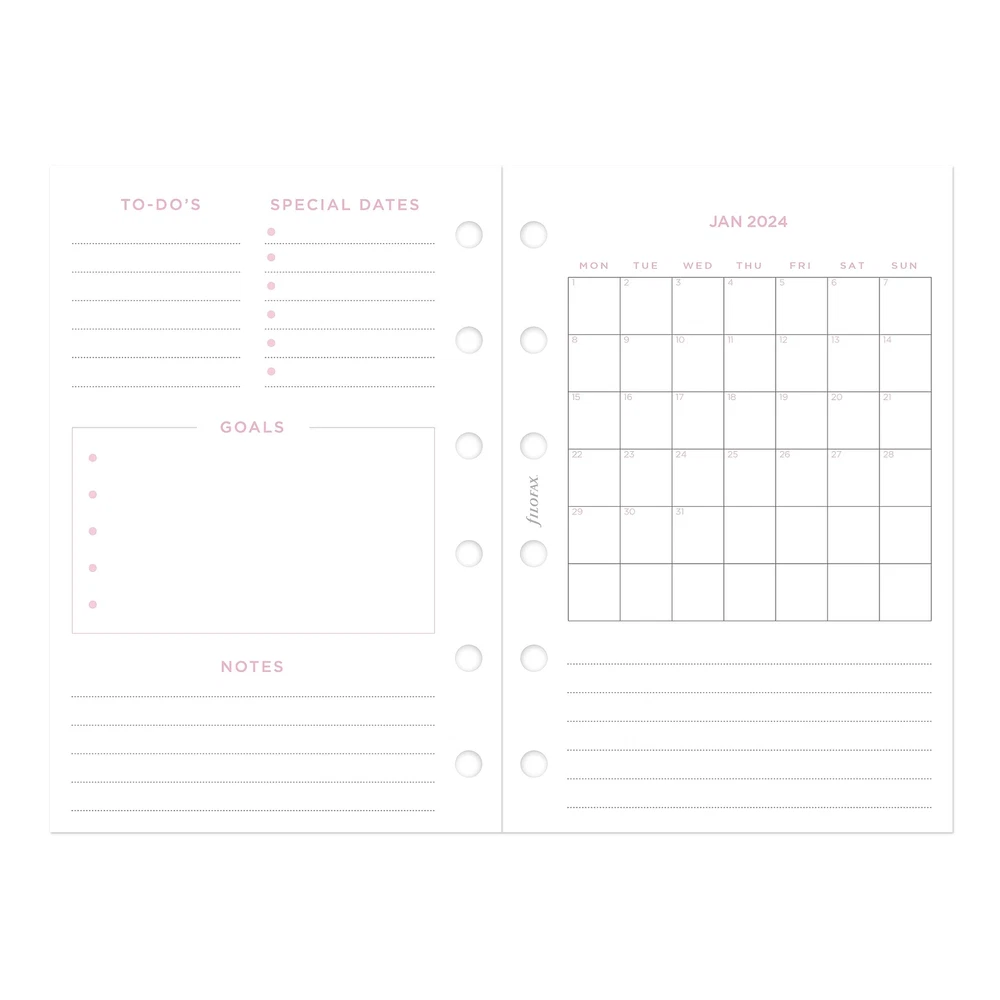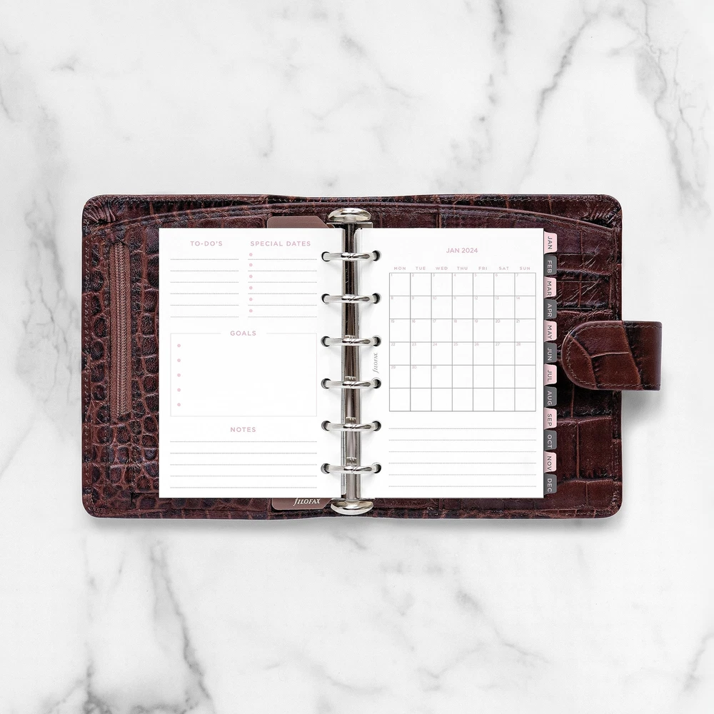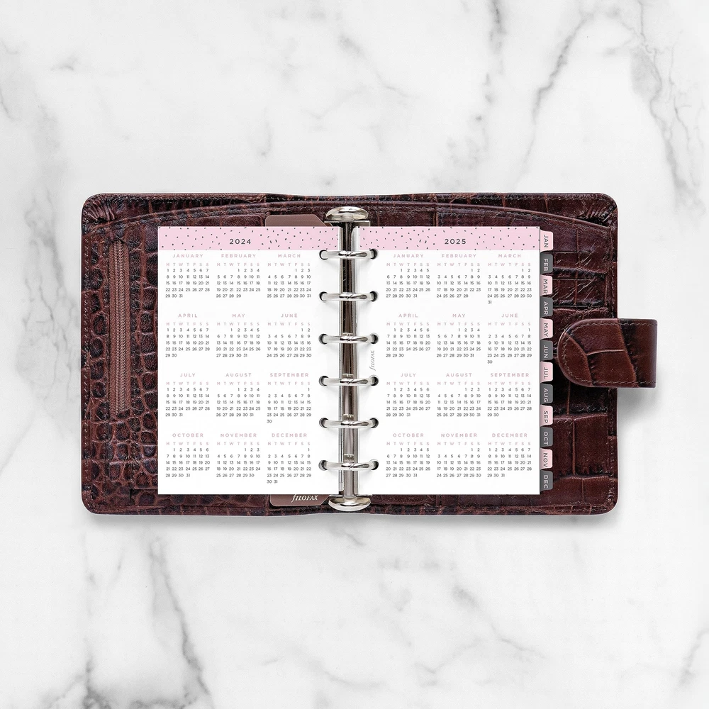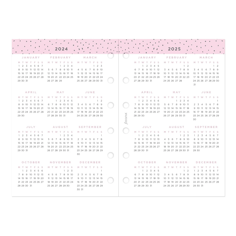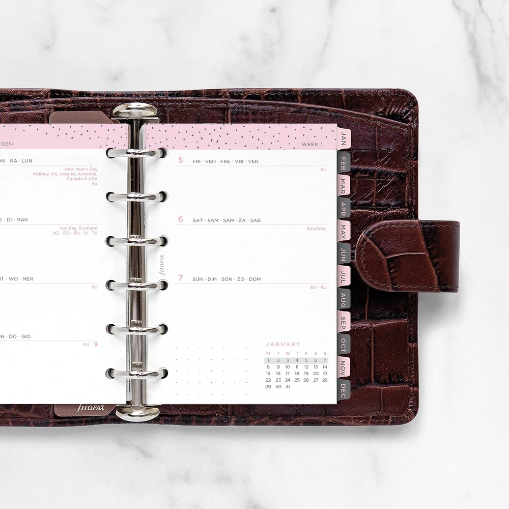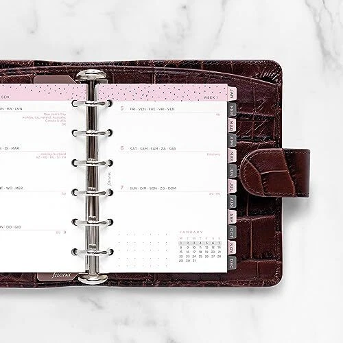 Add a personal touch to planning with Minimal Dated Refills, featuring a contemporary look with grayscale tones and clean design header. Plan ahead and stay inspired. Minimal Calendar Diary Refill features: Week-to-View (WTV), Week on pages format, January to December, 2024, Year calendars, Big Plans pages, Dashboard pages for each month, To Do pages, Pages for monthly goals, and dotted and ruled pages at the end of each month. 116 sheets of 80 gsm fountain pen-friendly paper. Weekly dated refill is pocket size for planners, organizers, agendas and diaries. Multilingual dated calendar diary in five languages in: English, French, German, Dutch and Italian. FSC Mix - Forest Stewardship Council - Certified to help promote environmentally appropriate, socially beneficial, and economically viable management of the world's forests. Made with a mixture of materials from FSC-certified forests, recycled materials, and/or FSC-controlled wood. Over the years, the organizer has evolved from a simple loose-leaf system into an indispensable everyday accessory. The logo promises authenticity and the finest craftsmanship. It's a hallmark of impeccable quality, trusted worldwide, since 1921. Minimal Calendar Diary Refill features: Week-to-View (WTV), Week on pages format, January to December, 2024, Year calendars, Big Plans pages, Dashboard pages for each month, To Do pages, Pages for monthly goals, and dotted and ruled pages at the end of each month. Weekly dated refill for planners, organizers, agendas and diaries. Refill size with pocket size Organizers. Pocket Size: 4-3/4" x 3-1/4" Multilingual: Five languages (English, French, German, Dutch and Italian) Paper Color: Confetti, Minimal, 80 gsm fountain pen-friendly paper. 116 sheets. FSC Mix. Forest Stewardship Council (FSC) Certified to help promote environmentally appropriate, socially beneficial, and economically viable management of the world's forests. Made with a mixture of materials from FSC-certified forests, recycled materials, and/or FSC-controlled wood.