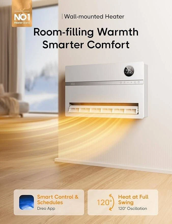 Calidez generalizada: la calefacción por oscilación de 120° distribuye el aire caliente de manera uniforme de arriba a abajo, lo que ayuda a llevar calor rápido a cada rincón de su habitación de manera más eficiente que los calentadores de pared comunes. Control inteligente, estilo de vida sin problemas: programe las horas de calefacción de la habitación para que coincidan con su rutina, acceda a la configuración de su calentador desde cualquier lugar con la aplicación Dreo o incluso use su voz para controlarlo gracias a la compatibilidad con Alexa y Google Home. Control de temperatura rápido y preciso: configure la temperatura de la habitación como desee, elija entre un rango de 41 a 95 °F con una precisión sin precedentes de 1 °F. El calentador de ambiente de cerámica PTC brinda un calentamiento rápido y constante para una experiencia de comodidad excepcional. Listo para una buena noche de sueño: este calentador inteligente para dormitorio ajusta automáticamente el brillo de su panel LED a condiciones de poca luz, mientras brinda calidez con menos ruido, asegurándose de que nada interrumpa su sueño. Instalación sin complicaciones, mantenimiento sin estrés: monte su calentador de ambiente fácilmente. El paquete viene con todos los accesorios, incluida una práctica guía de perforación con pasos fáciles de seguir. Mantener su calentador de pared como nuevo es muy conveniente gracias a su filtro reutilizable y diseño desmontable. Cobertura de calefacción: para garantizar la máxima calidez y comodidad, utilícelo como fuente de calor principal para áreas de 200 pies cuadrados o hasta 750 pies cuadrados como fuente complementaria. Verifique si su habitación tiene el aislamiento adecuado para una eficiencia óptima.