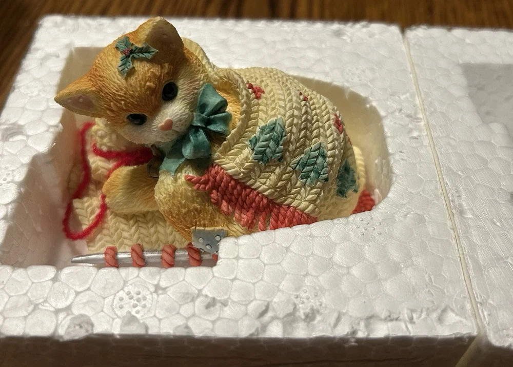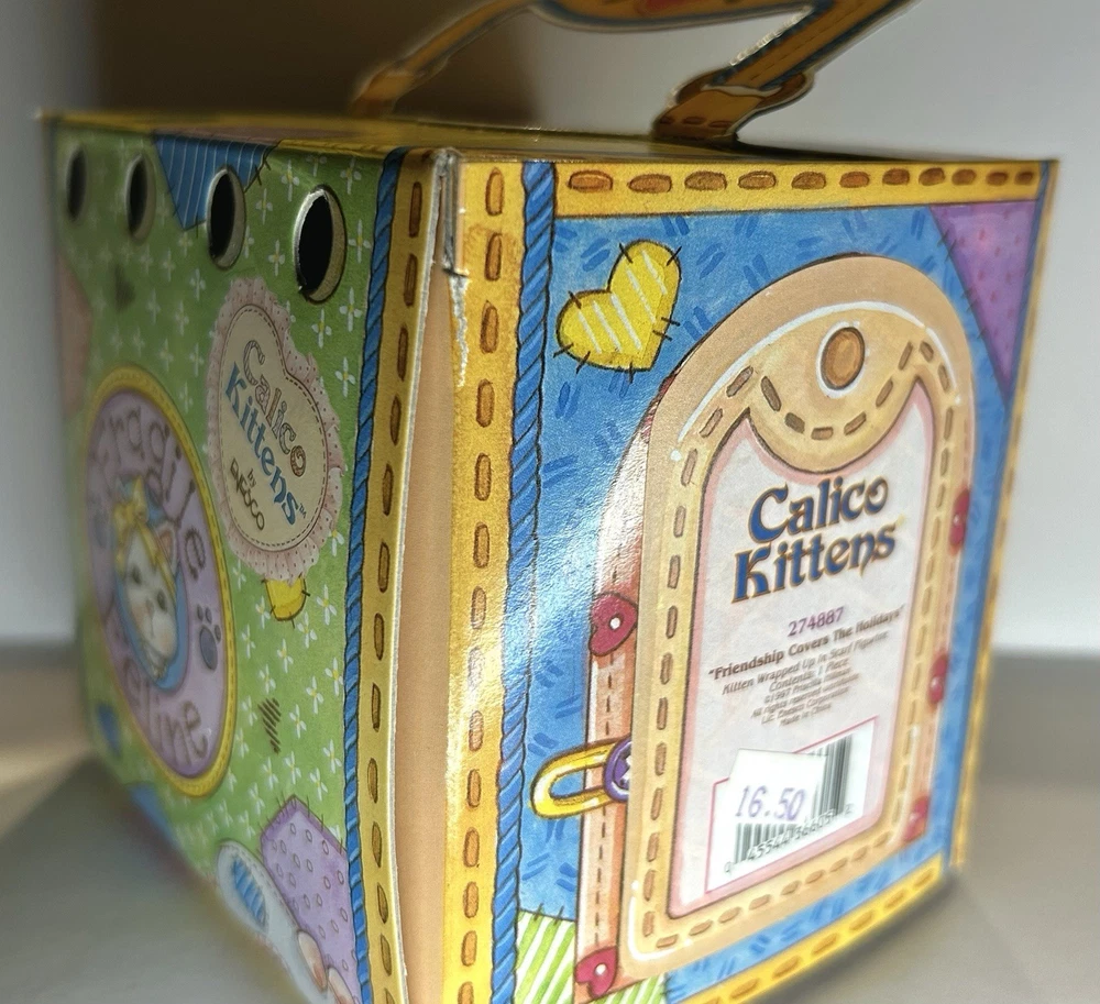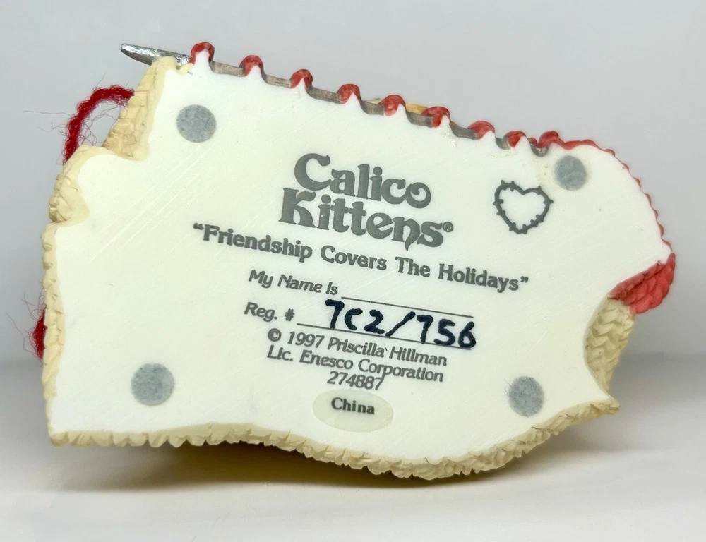 Embrace the warmth of the holiday spirit with the "Friendship Covers The Holidays" figurine from the beloved Calico Kittens collection. Crafted by Enesco and artist Priscilla Hillman, this charming piece features a cozy kitten wrapped in a scarf, exuding a sense of seasonal joy and companionship. This collectible, a representation of friendship and the festive season, is made from resin and comes in its original box and styrofoam packaging, making it a perfect piece for your collection or as a thoughtful gift. With its retirement status, this 1997 figurine becomes a unique treasure for collectors and cat enthusiasts alike, embodying the timeless theme of the collection.
