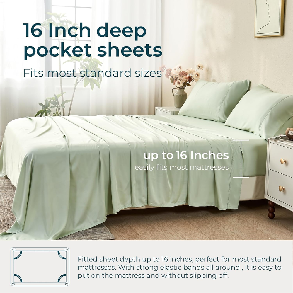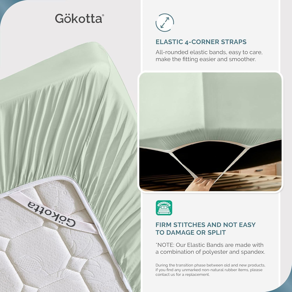 Store New Arrivals Add to Favorite View Feedback Contact California King Size Bed Sheets 4 Piece Set, 100% Rayon Derived from Bamboo, Cooling for Hot Sleepers-Ultra Soft Sheets, Deep Pocket 16" Fitted Sheet with Elastic Corner Straps,Sea Glass Description Item model number Bed Sheet Set Style Modern Pattern Solid Country of Origin China Theme Solid Number of Pieces 4 Unit Count 4.0 Count Pillowcase Quantity 2 Material Rayon Derived from Bamboo Age Range (Description) Adult Seasons All Package Dimensions 12.5 x 8 x 4.75 inches Closure Type Envelope Item Weight 6.44 pounds Occasion everyday/casual Fitted Sheet Pocket Depth 16 Inches Special Feature Fully Elasticized Color 09 Sea Glass Thread Count 300 Included Components Fitted Sheet * 1 Product Care Instructions Machine Wash, Tumble Dry Low, Do Not Bleach, Do Not Iron Size California King 100% RAYON DERIVED FROM BAMBOO:Gokotta california king size bed sheets are made of 100% bamboo rayon with 300 thread count, a premium quality fabric that is softer and smoother than silk. This natural material is hypoallergenic, naturally cooling, and breathable, making it perfect for a comfortable sleep experience ULTIMATE COOLING COMFORT & BREATHABLE SHEETS: These cooling bed sheets are thermo-regulating, keeping you cool and relaxed all night long, perfect for hot sleepers or those with sensitive skin. The moisture-wicking properties ensure year-round comfort, allowing you to indulge in luxurious softness with every wash 16'' DEEP POCKET PERFECT MATTRESS FIT: This california king sheets set with deep pocket up to 16" which provides perfect mattress fit, not only that, we also design 4 highly elastic straps at the corners and all round elastic bands, which can effectively prevent wrinkles and shifting, and can always keep the bed tidy OEKO-TEX CERTIFIED: Gökotta’s fabric suppliers are certified to OEKO-TEX 100 standards, ensuring that the fabric and thread used in our products are rigorously tested for harmful substances and meet strict safety and environmental requirements Outstanding Customer Care:We offer a 90-day warranty service, so feel confident in your purchase and if you have any questions, please don't hesitate to contact us. Imported Product Description Deep Pocket Up to 16" GOKOTTA Experience Ultimate Comfort with GOKOTTA 100% Bamboo Rayon Sheets GOKOTTA Bamboo Rayon Sheets are Made from 100% bamboo rayon, without blending other fabrics, these sheets are highly breathable and cool to the touch, making them ideal for those with sensitive skin. The 300-thread count sateen weave provides a luxuriously silky feel , ensuring a truly restful night's sleep. 1 Sheets With Corner Straps 2 300 Thread Count 3 OEKO-TEX Certification 4 Ultra Soft Sheets 5 Size Chart Multi-color Real Shot Display 1 Multiple Color 2 Pillow Cases 3 Latex-free Elastic 4 Warm Tips ABOUT US We offer the best prices around on high quality products. Our E-store includes media such as books, movies, music and games while offering electronics, toys, sporting apparel, clothing, tools, general home, garden items and more. SHIPPING We are always working hard to ensure your package arrives as soon as possible. Please understand that some factors like weather, high postal traffic, and the performance of shipping companies are outside of our control. We offer free shipping to the lower 48 states and ship within 2 business days of payment, usually sooner. We do not accept P.O. Boxes. Please provide a physical address. For shipping outside of the continental USA, we only use eBay's Global Shipping Program.The item is shipped to KY and then sent to the rest of the world. International customers are responsible for all duties and taxes. Continue to check out in order to calculate costs for shipping the item to your country. Messages regarding eBay's Global Shipping Program MUST be directed at eBay EXCLUSIVELY. RETURNS We offer a 30-Day Return Policy on items which you are not completely satisfied with. You have the option for a full-refund or an exchange of the item. No returns are available on items shipped outside of the USA. PAYMENT We accept PayPal. CONTACT US This page content is yet to come Please ad us to your favorite seller and visit again later Thank You CUSTOMER SATISFACTION We try our very best to make sure every customer is completely satisfied. If there's a problem, message us! We're happy to help.