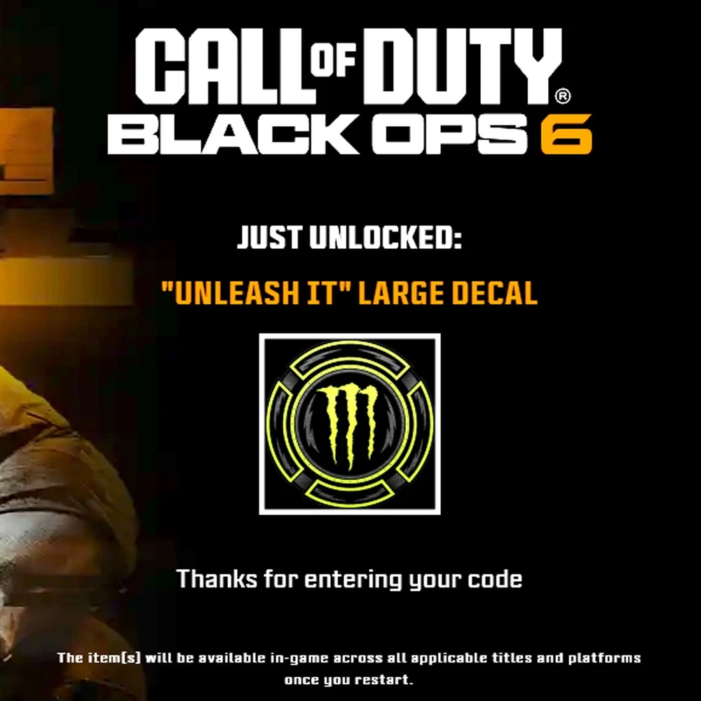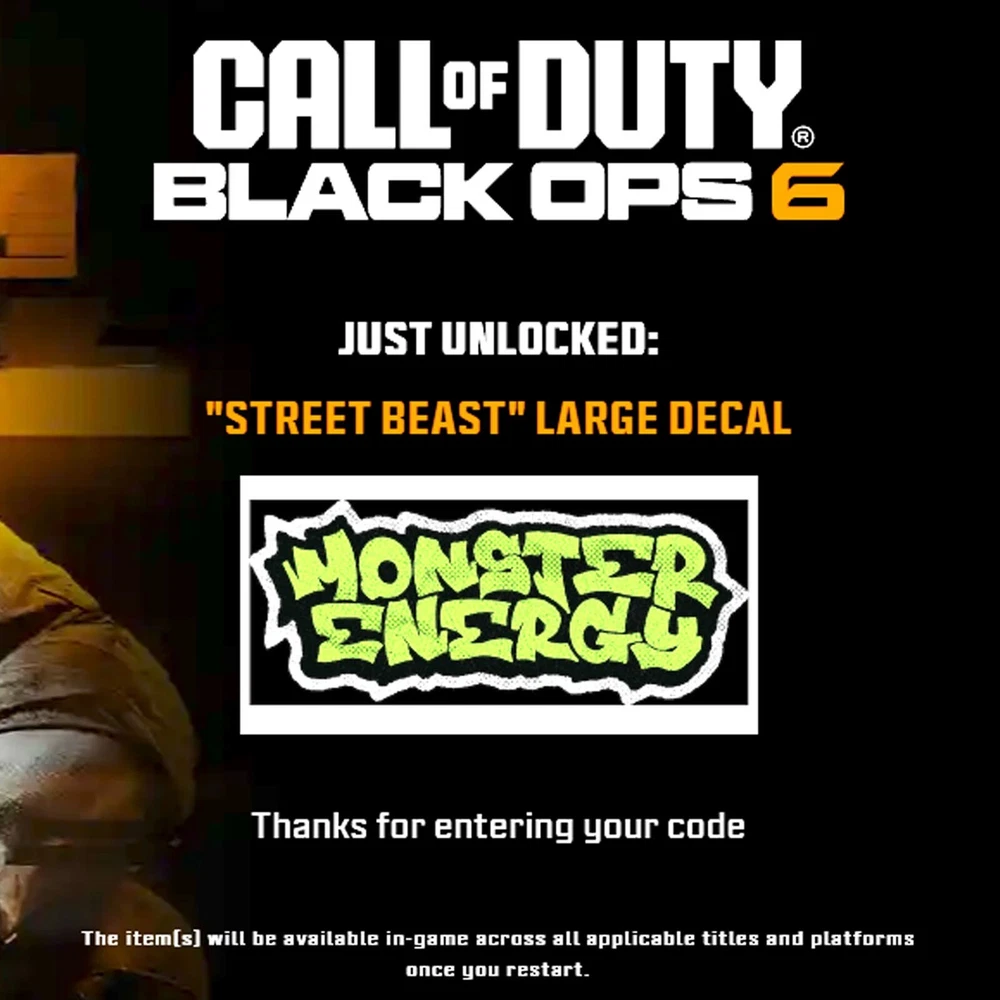 10 Hours of Double Rank XP - Black Ops 6 DLC Monster Energy Full Promo Set -All 6 Monster Energy Items Included (Weapon Blueprint, 2x Weapon Vinyl, 3x Operator Skins) -Instant Automatic 24/7 Delivery via eBay Messages 📥 -Codes are REGION-FREE and Work Worldwide 🌍 -Works on ALL Consoles & Platforms ✅ -Trusted Seller (Over 1,000+ Feedback) ⭐ -Redeem Directly on Call of Duty's Official Website 🌐 Description Call Of Duty Black Ops 6 - Monster Energy Full Promo Set You will receive 6 Unique Codes to unlock the Full Monster Energy Promo Set in Call of Duty: Black Ops 6 on any platform. Codes are region-free and work worldwide. Items Included: 1. Weapon Blueprint "Green Fury" 2. Operator Skin (Green) "Unleash The Truth" 3. Weapon Vinyl Large Decal "Street Beast" 4. Operator Skin (Blue) "Cold Trail" 5. Weapon Vinyl Large Decal "Unleash It" 6. Operator Skin (White) "The Beast Inside" Supported Platforms Instant Automatic Delivery 24/7 Codes will be sent Instantly Automatically via eBay message upon payment completion. Codes are sent 24/7 no matter the time, day or night. On average orders are fulfilled within 5-10 minutes. Instructions for redeeming the codes on the official Call of Duty website will be included. Any Questions? If you have any questions, feel free to reach out to us by clicking the button below: Contact Us What Our Customers Say ⭐⭐⭐⭐⭐ 1000+ Positive Feedback Disclaimer eBay Personal Information Policy: These are codes for online gaming virtual items. No personal information is exchanged during the sale of these items. eBay Electronically Delivered Policy: This is an online gaming virtual item meaning this item is not sent physically but is digitally delivered. This has an exclusion under the 4th sub-section of the Electronically Delivered Items Policy (Online gaming virtual items) allowing this to be listed in categories outside of the Everything Else > Information Products category. For more information, please refer to eBay's Digitally Delivered Goods Policy . This is an online gaming virtual (digital) item. Not physical. It will be delivered via eBay messages. jamie7114 eBay Store
