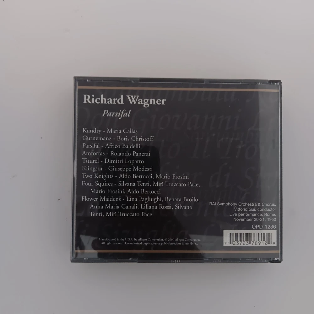 This 3 CD set of Richard Wagner's Parsifal is a must-have for any classical music collection. Featuring the RAI Symphony Orchestra and Chorus, this live edition of the opera is conducted by the composer himself. The CD grading is near mint (NM or M-), and the inlay condition is excellent (EX). The set comes in a standard jewel case with a multicolor design, and is produced by Richard Wagner. The release year is 2000, and the CD format is CD. The record label is Allegro Corporation, and the genre is classical. This item is perfect for fans of Wagner and classical music alike.