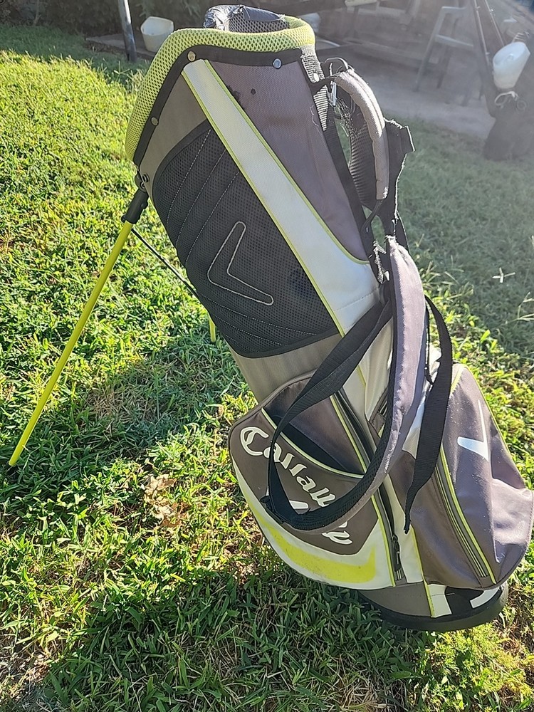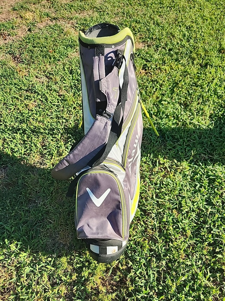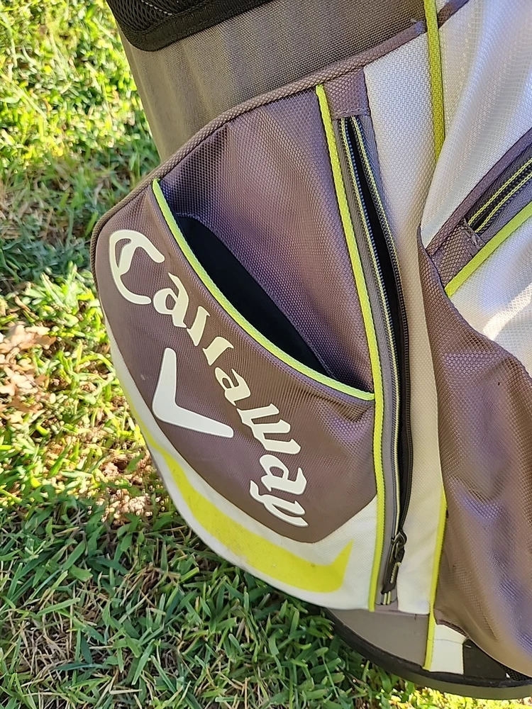 The Callaway Golf 6-Way Cart Bag in gray and green is a large, spacious golf bag. With 6 different dividers, this bag provides plenty of storage for all your golf clubs. The zip closure ensures your clubs stay secure while on the course, and the 5 pockets offer additional space for storing essentials like tees, balls, and snacks. The sport theme and high-quality Callaway branding make this bag a stylish and functional choice for any avid golfer.
