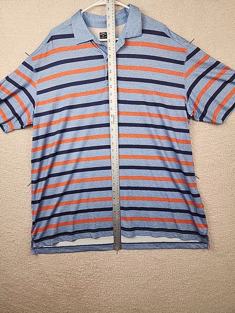 Refer to photos for measurements The Callaway Golf Shirt is a men's short sleeve polo designed for optimal performance on the golf course. Made with Opti Dri technology, this shirt helps keep you dry and comfortable during your game. The striped pattern adds a touch of style, while the XL size ensures a comfortable fit for larger individuals. Perfect for any golfer looking for a high-quality shirt that combines comfort and style on the course.