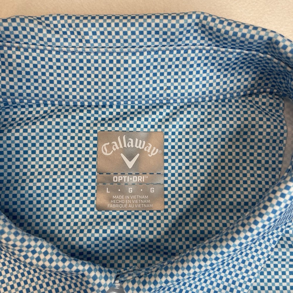 Callaway Shirt Men's LG Blue Square Opti-Dri performance golf Polo. Condition is Pre-owned - Excellent. Shipped with USPS Ground Advantage.