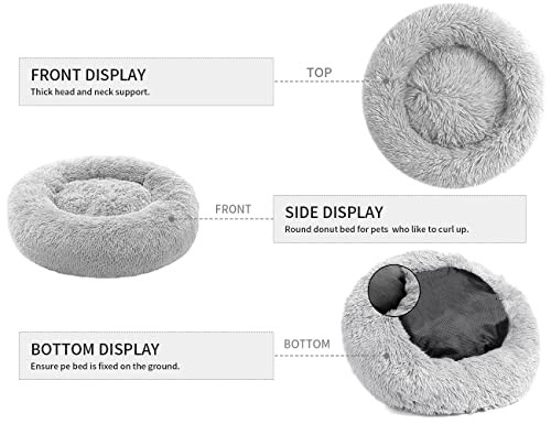 Features: Sweet Calming Dog Donut Bed - The fluffy donut large dog bed is made of high quality nylon and faux fur, the interior is filled with thick PP cotton to make the whole puppy bed more comfortable. All crafting materials are 100% safe and will not cause allergies to your pets. Scientific Design Extra Large Dog Beds-The raised edge of our large dog beds gives your dog enough support to the head and a sense of security, there is also enough padding on the bottom and sides to relieve the dog's muscle soreness and joint pain. Non-slip Bottom Fluffy Dog Bed - Our calming xl dog bed adopts non slip bottom, which can be fixed on the floor. The bottom of the bed is designed with sticky beads and high-density fabric, which is waterproof, dustproof and anti-skidding, providing a dry and warm environment for your pets. Washable Anti-Anxiety Dog Bed - The donut cuddler dog bed is machine washable, make sure that the doughnut dog bed is washed in cold water with gentle mode(no bleach), and thoroughly dried in low temperature. Regular washing can avoid dirt and provide a comfortable sleeping environment for your pet. Choose the Right Size - The large dog bed with 3 size option: 70*70cm-Outer diameter 70cm/27.6inch roundInner diameter 40cm/15.7inch round; 80*80cm-Outer diameter 80cm/31.5inch roundInner diameter 50cm/20inch round; 90*90cm-Outer diameter 90cm/35.4inch roundInner diameter 60cm/24inch roundPlease select the most suitable size and your favor color, according to your pal's actual size.