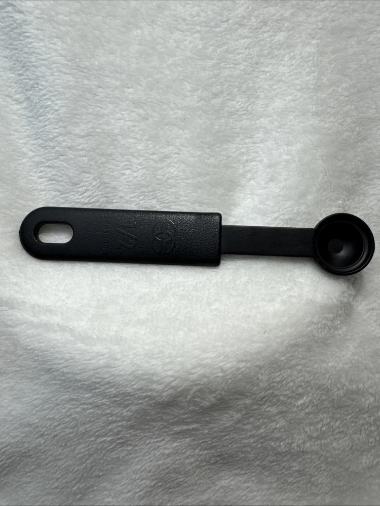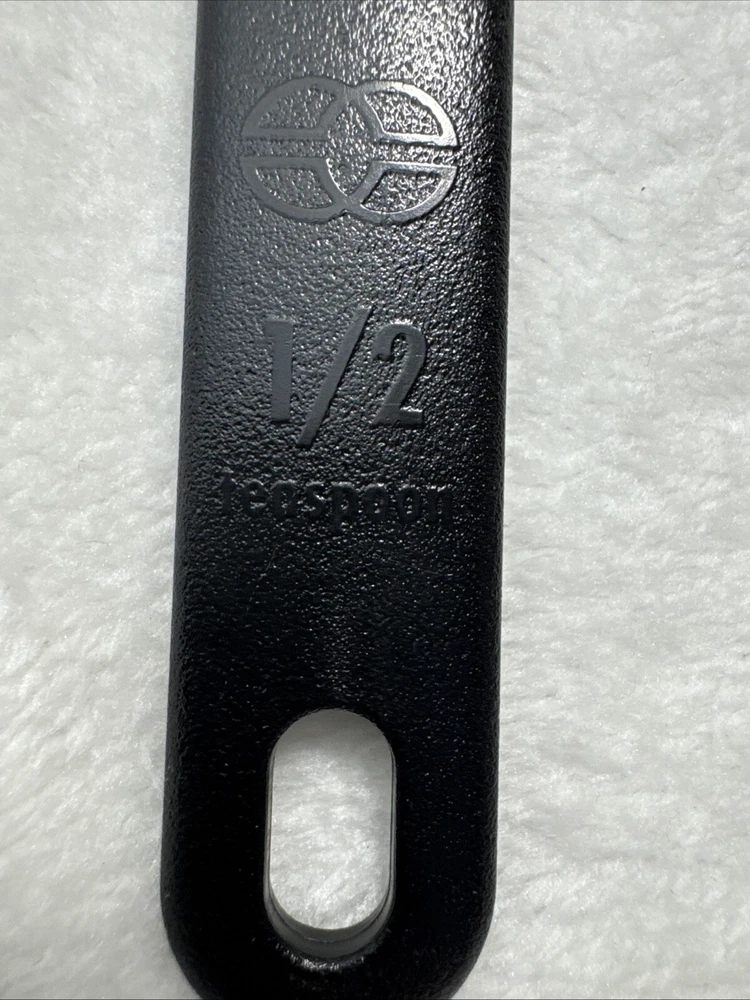 This Calphalon 1/2 TEASPOON measuring spoon is a must-have in any kitchen. It features a solid pattern in black and gray, with a set that includes one spoon. The spoon is made of nylon and silicone, making it heat resistant and easy to clean. The lightweight spoon has a soft grip and is dishwasher safe. Perfect for cooking, this measuring spoon is a great addition to any kitchen tool collection. It is manual in making method and has a unit quantity of one. The spoon's handle is made of silicone and nylon, making it durable and long-lasting. Get accurate measurements for your cooking needs with this Calphalon measuring spoon.