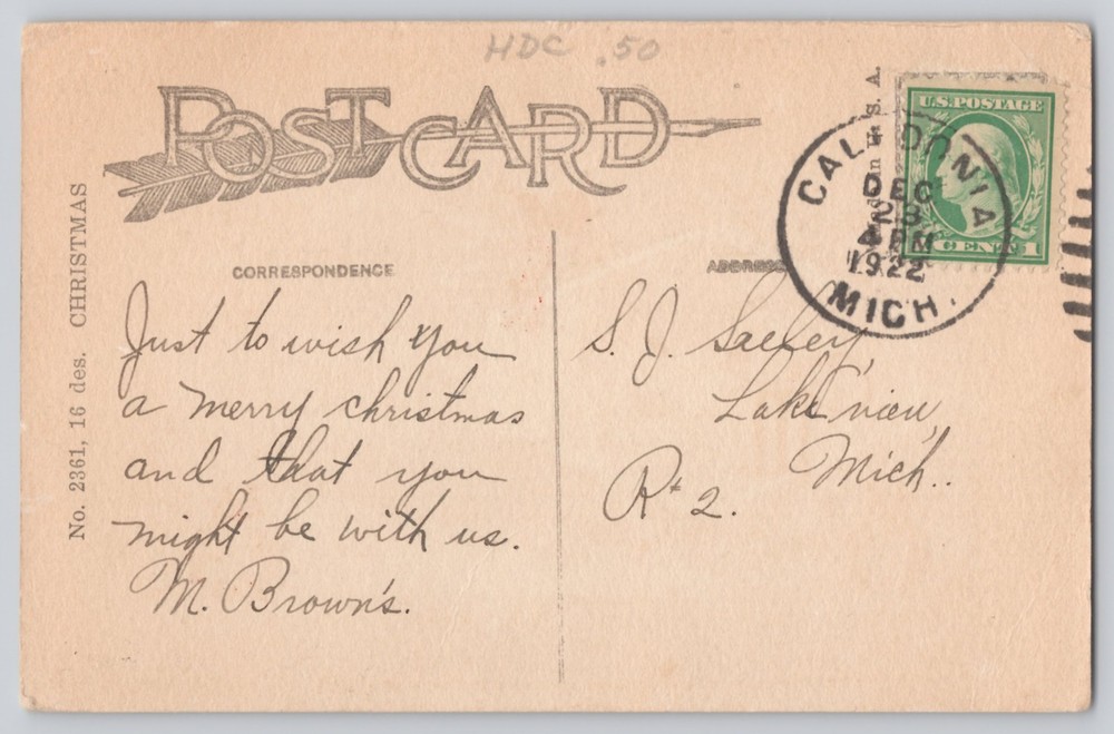 Printed Christmas greeting card illustrated with a child holding a doll beside a decorated tree, wreath motifs and the caption 'Merry Christmas.' Back is printed "No. 2361, 16 des. CHRISTMAS" and shows a divided back layout with a handwritten greeting. Cancelled in Calumet, Mich., in Dec 1922 with a 1c green U.S. stamp; handwriting sends "a merry Christmas." Additional Information: • High-resolution scans/photos of both front and back are provided, and you can zoom in to examine all details closely. Please review them carefully for condition. • All postcards are shipped in protective packaging to ensure safe delivery. • Cards under $20 are sent through eBays Standard Envelope program (with tracking). We never ship stamp only. • Cards over $20 are shipped via USPS Ground Advantage with tracking.