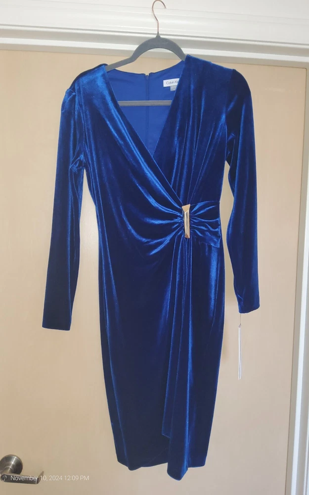 Calvin Klein Elegant Velvet Royal Blue Faux Wrap Easy Fit Sheath Dress size 6. Condition is New with tags. Shipped with USPS Ground Advantage.