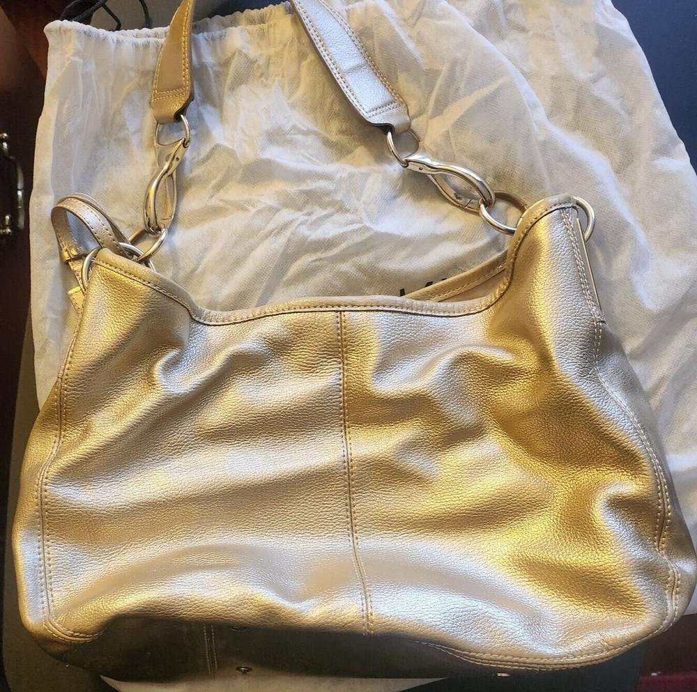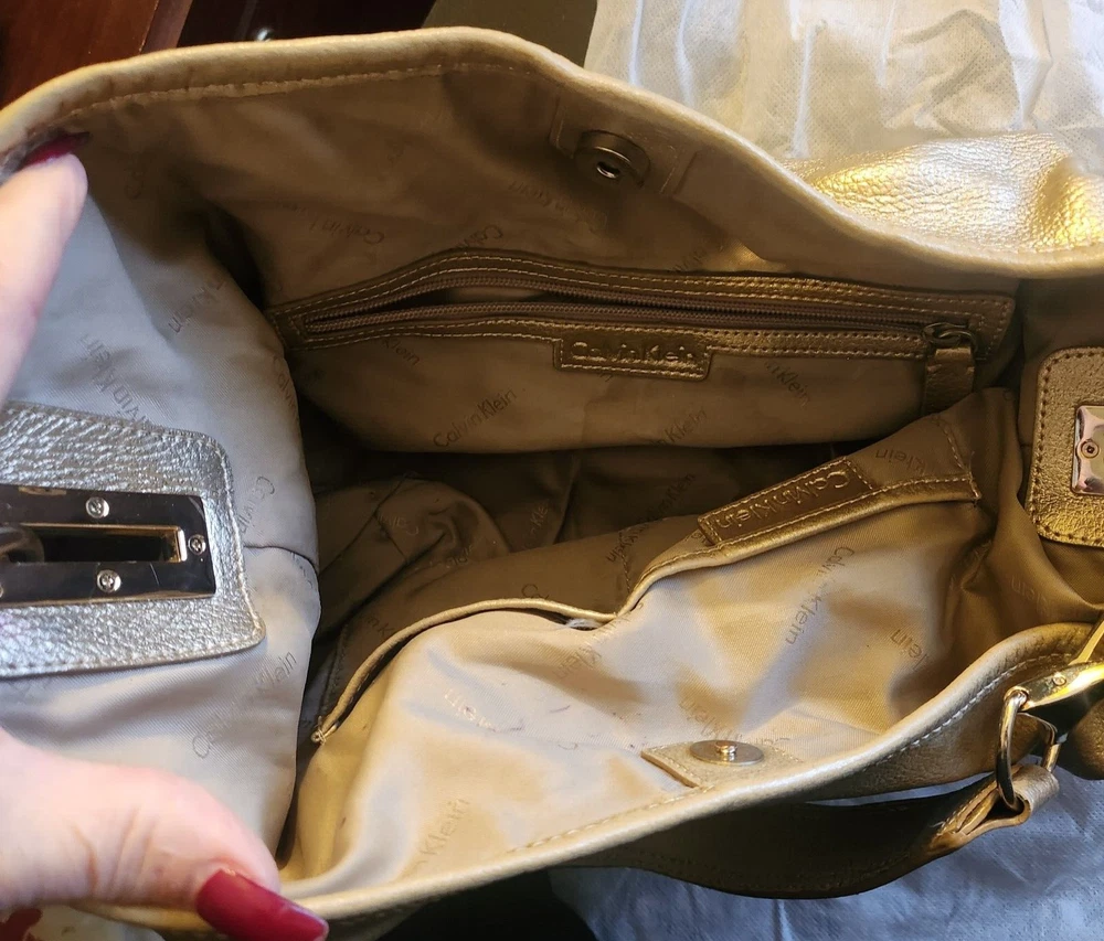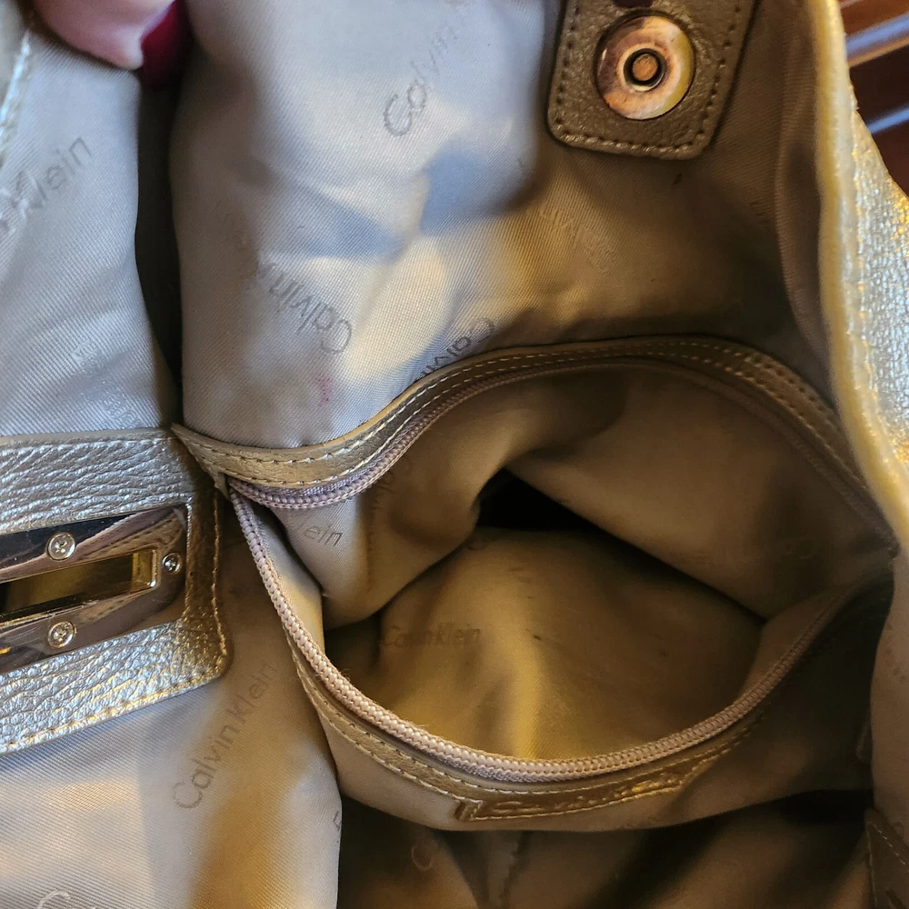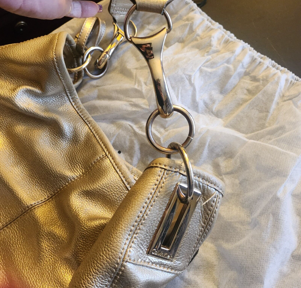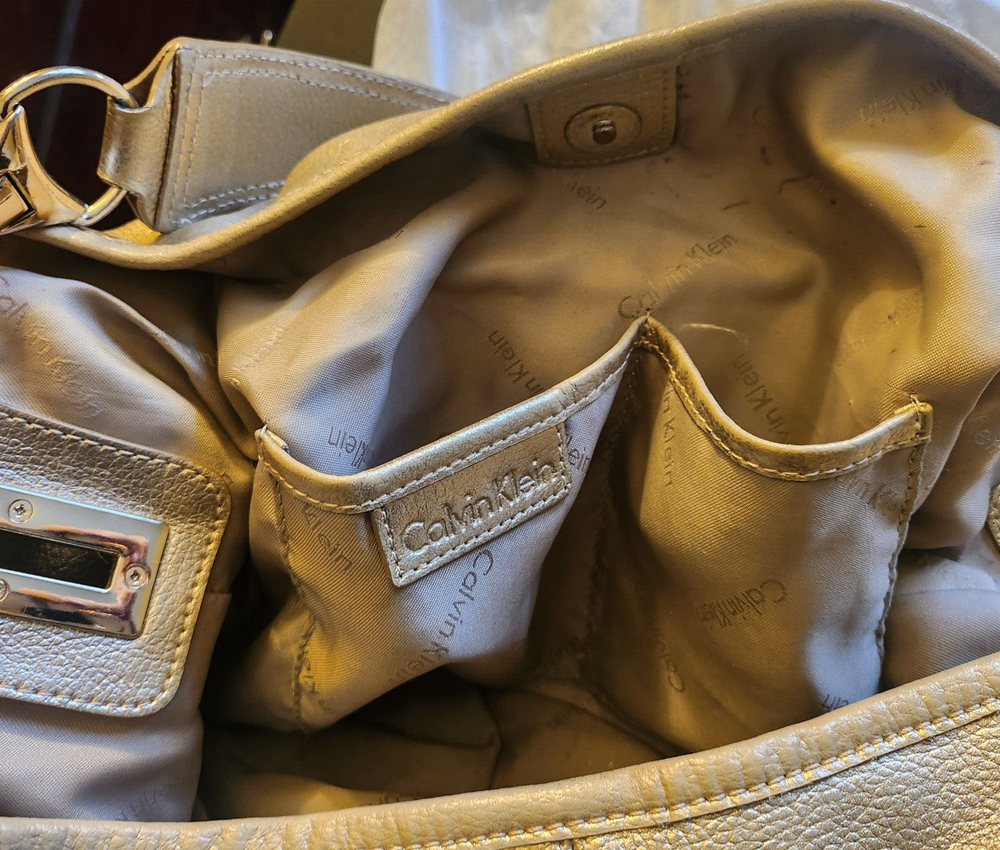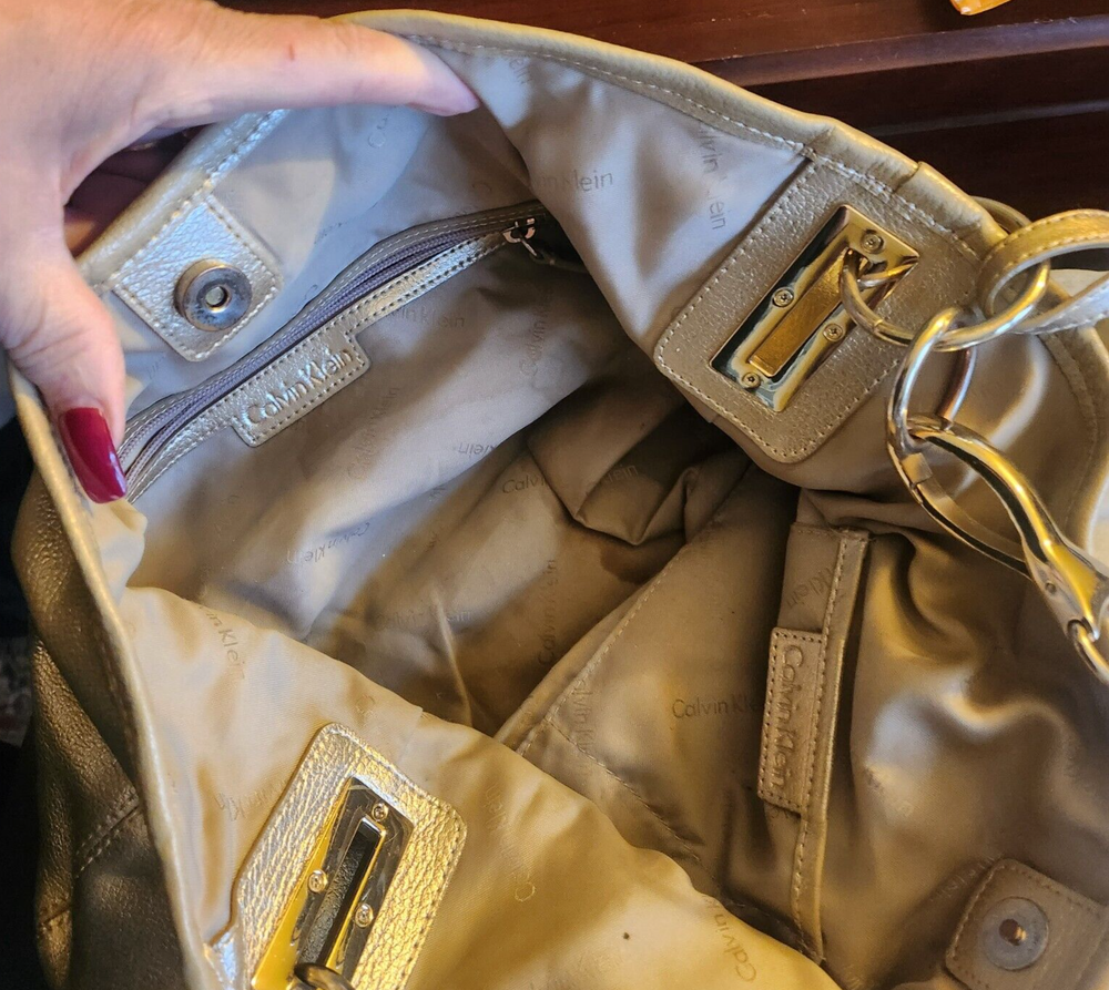 Elevate your style with this high-end Calvin Klein handbag. The gold bucket leather shoulder hobo bag is perfect for travel or casual occasions. It features a snap closure, bottom studs, and pockets for added convenience. The bag charm and original dust bag make it a unique accessory. The pebbled finish and solid pattern add a touch of elegance. The large size, measuring 14 inches in width, 10 inches in height, and 5 inches in depth, makes it an ideal choice for carrying your essentials. The gold-plated hardware and handles give it a luxurious appeal. The bag is made of high-quality leather and lined with polyester, ensuring durability and comfort. Dust bag included. Be sure to view my other listings!