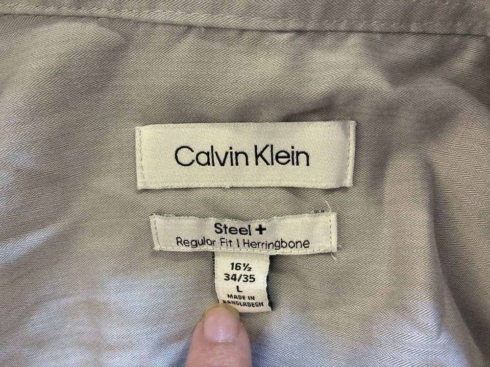 Calvin Klein Men's Steel + Regular Fit Herringbone Dress Shirt Gray 16.5 34/45 L. Condition is pre-owned. Smoke free, pet free home. Shipped via USPS Ground Advantage. In very good condition. Free of rips or stains.