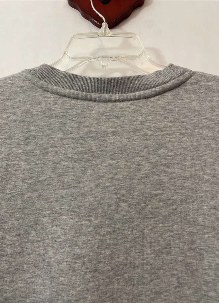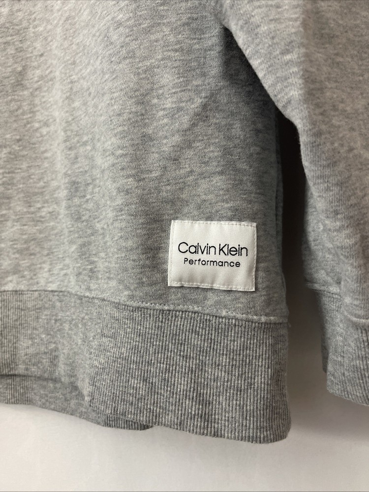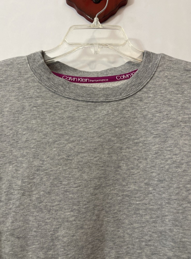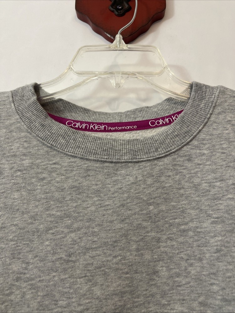 This Calvin Klein Performance Women's Petite Large Gray Pullover Sweatshirt is a stylish and comfortable activewear piece perfect for petite women. Made from a blend of polyester and cotton, this sweatshirt features a solid gray color with the iconic Calvin Klein logo accent. The long sleeves, crew neckline, and pullover closure make it easy to wear for any occasion. With its athletic fit, stretchy fabric, and breathable design, this sweatshirt is designed for all seasons and offers a modern and classic style. Perfect for the fashion-forward active woman. Length: 25 inches. Chest: 21 inches across laying flat.
