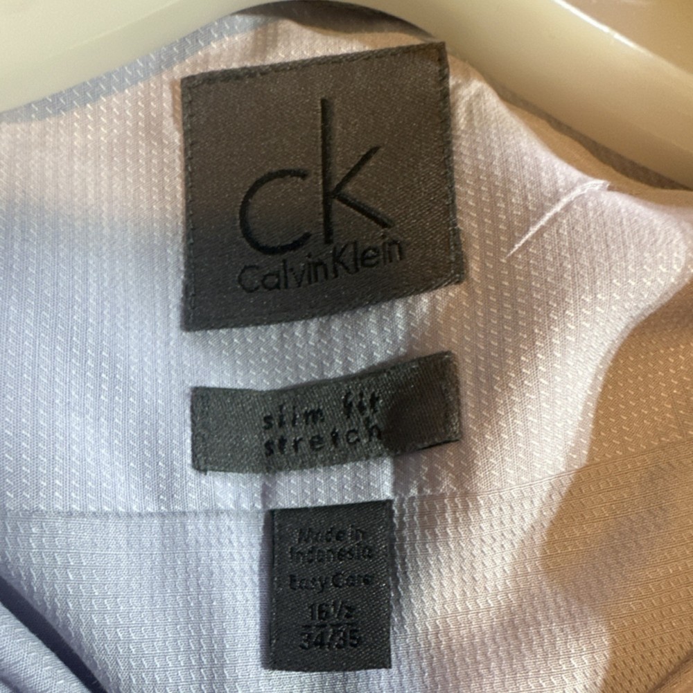 The Calvin Klein Slim Fit Light Purple Stretch Men's Dress Shirt in size 16.5 with a 34/35 sleeve length features a solid pattern, collared neckline, and button closure. Made from woven fabric with a slim fit design, this shirt is perfect for formal and business occasions. Easy to care for with machine washable instructions, it also offers stretch for added comfort. The classic design with accents of button detail and a barrel cuff style make it a versatile and stylish addition to any man's wardrobe.