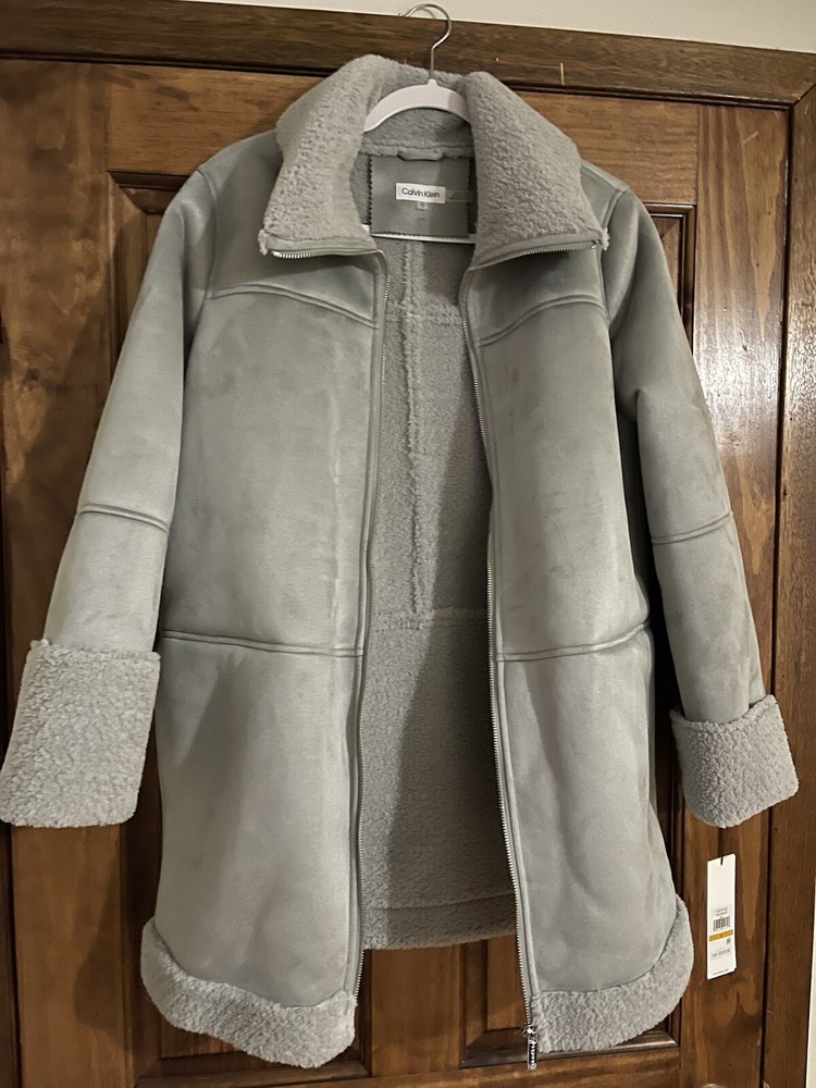 Outer Shell Material: Faux Leather Fabric Type: Faux Suede Brand: Calvin Klein Style: Walker Coat Features: Not Specified Country/Region of Manufacture: China Sleeve Length: Long Sleeve Season: Winter Size: S Type: Walker Coat Material Composition: 100% Polyester Size Type: Regular MPN: M2HJB433 Color: Gray Department: Women Closure: Zipper