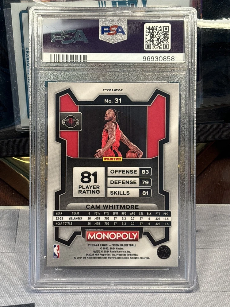 Parallel/Variety: Prizm Grade: 10 Season: 2023-24 League: National Basketball Association (NBA) Original/Licensed Reprint: Original Professional Grader: Professional Sports Authenticator (PSA) Type: Sports Trading Card Year Manufactured: 2024 Features: Parallel/Variety, Rookie Team: Houston Rockets Card Number: 31 Player/Athlete: Cam Whitmore Manufacturer: Panini Print Run: SP Set: 2023-24 Panini Prizm Sport: Basketball