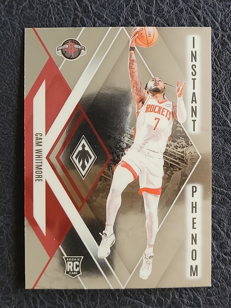 Cam Whitmore 2023-24 Phoenix Instant Impact Rookie & Prizm Draft 98 Rockets RC is a set of two standard-sized sports trading cards featuring Cam Whitmore from the Houston Rockets and Villanova Wildcats. The cards are part of the 2023 Panini Prizm Draft Picks and 2023-24 Panini Phoenix sets, showcasing Whitmore as a rookie player. The cards are made of card stock and include base set and insert features, perfect for basketball fans collecting NBA memorabilia.
