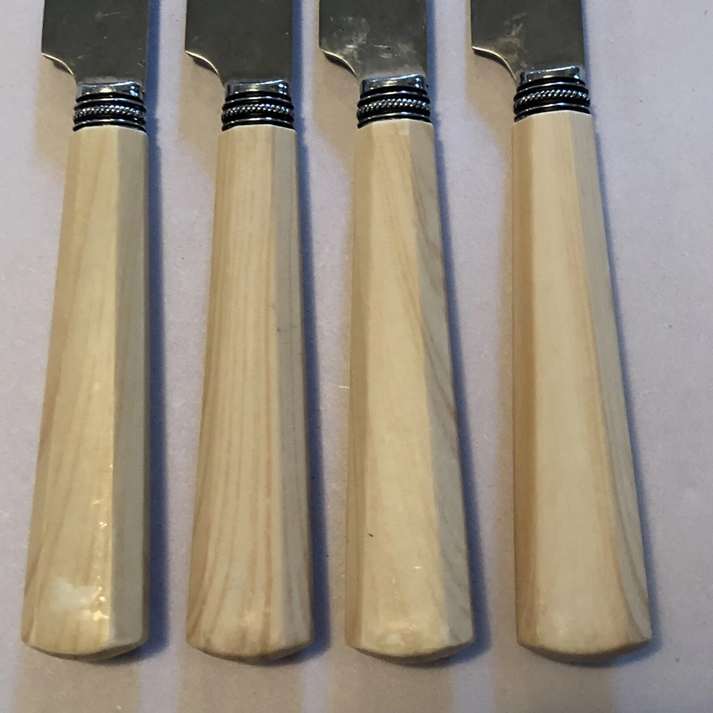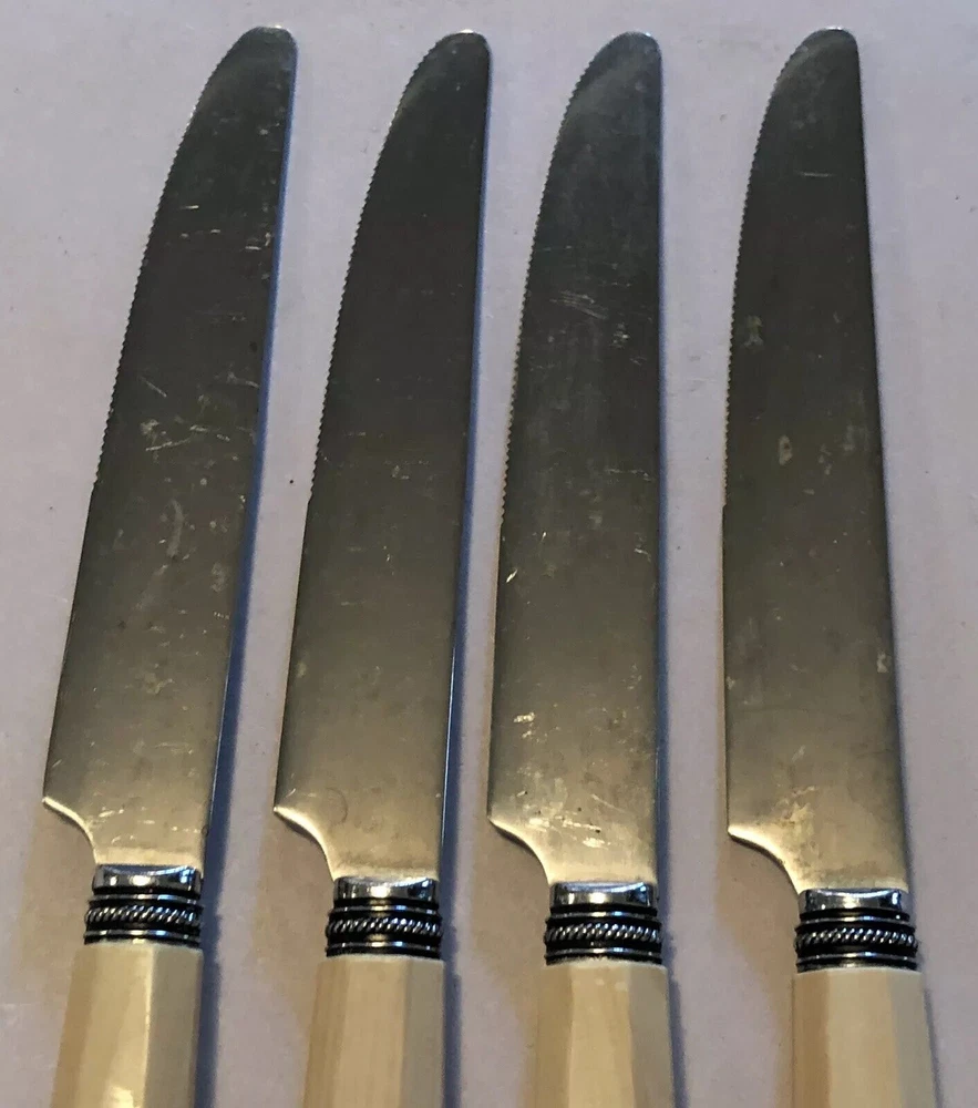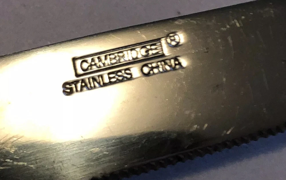 Set of 4 Dinner Knives. Marked on back: Cambridge Stainless China. Each measures approx. 9 1/4" long. Shows signs of light use and may need additional cleaning. Little spotting in places but no dishwasher or disposal damage. Overall very nice condition. Please see pictures for details as this is part of my description.
