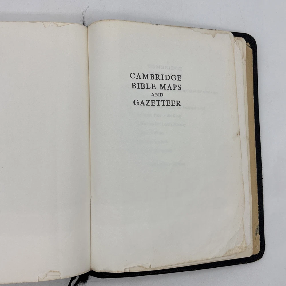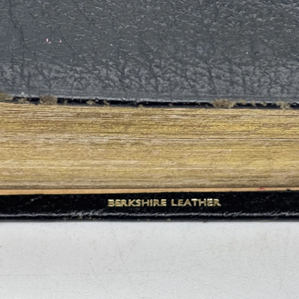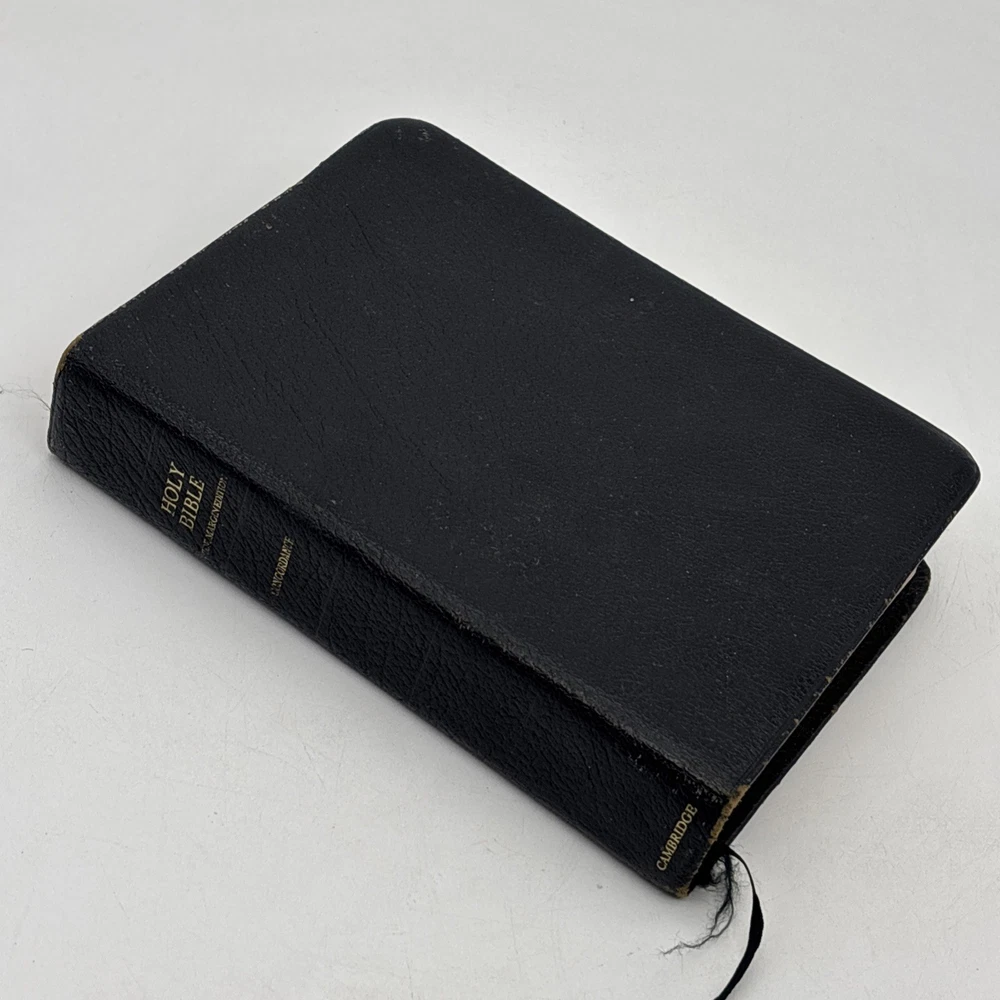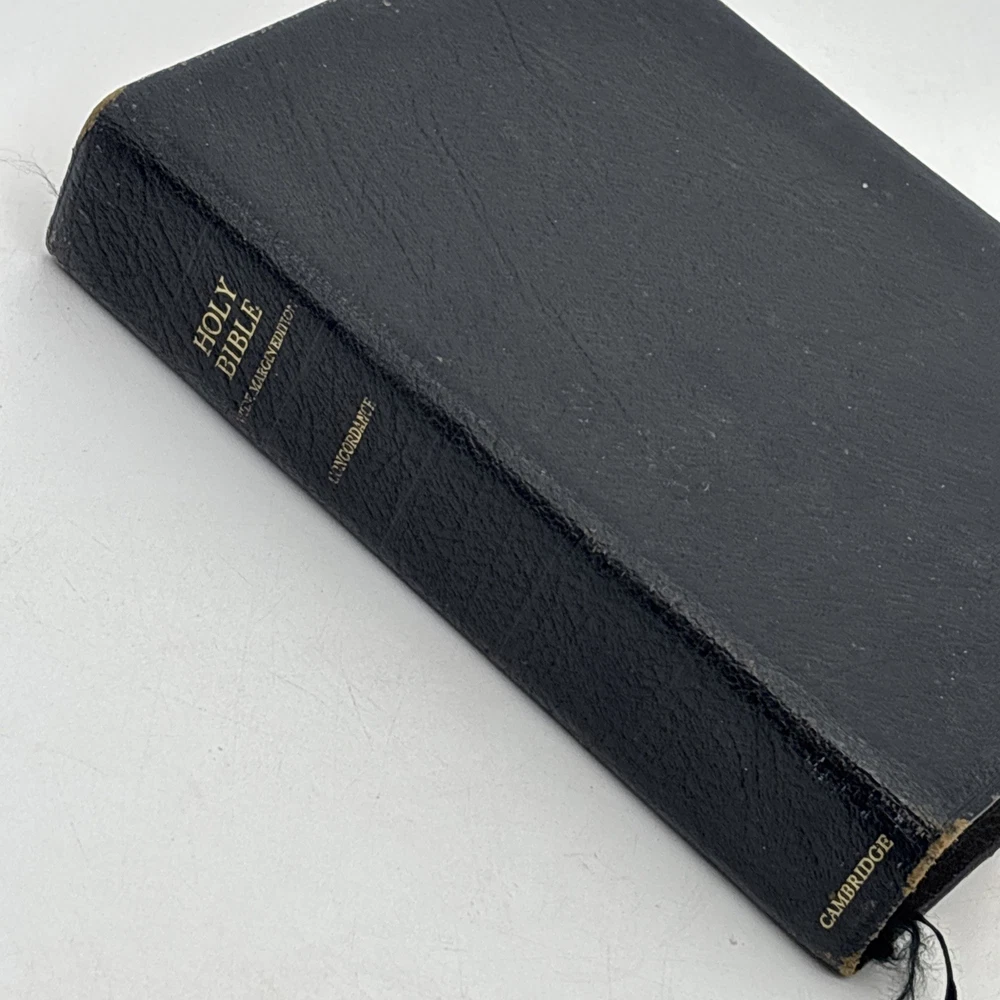 Badly worn Bible. Significant damage to the binding at the front hinge. The title page is missing. Several pages near the front and back are badly frayed, and it’s missing about half of the first page of Genesis. There are two ribbon bookmarks, one is badly frayed. And the Berkshire leather cover has a lot of wear and tear, especially on the edges. Please see pictures for a better idea of the cosmetic condition. Again, this is a wide margin addition with concordance bound in black Berkshire leather from Cambridge University press.