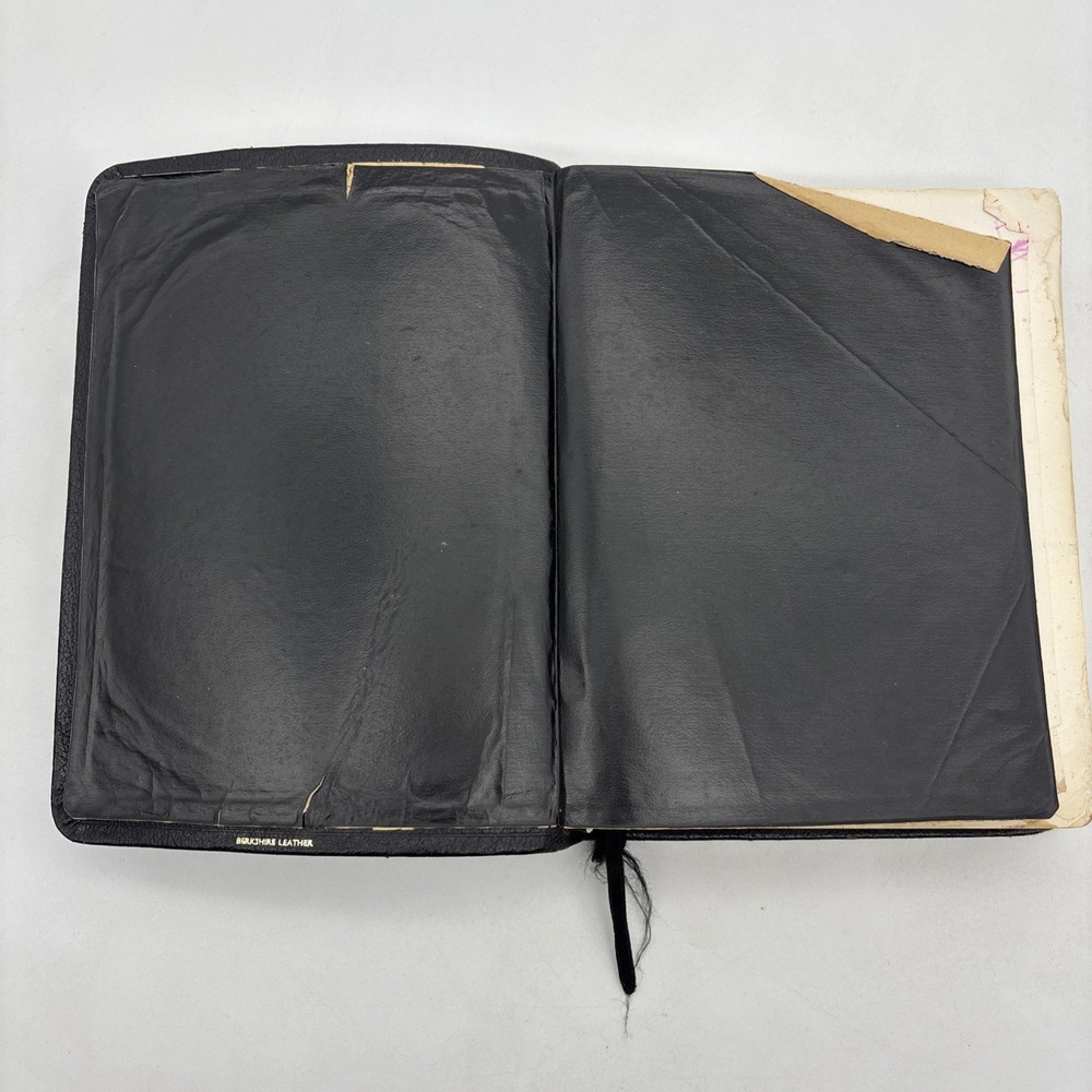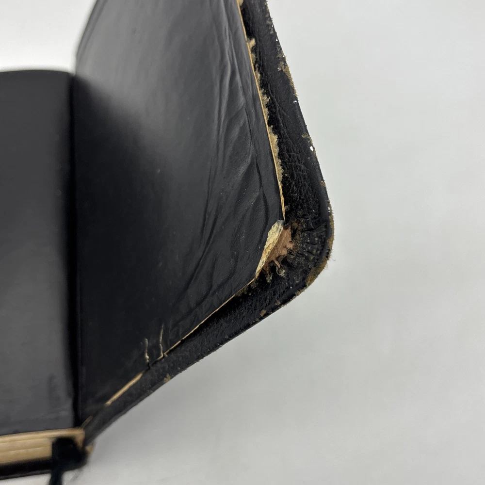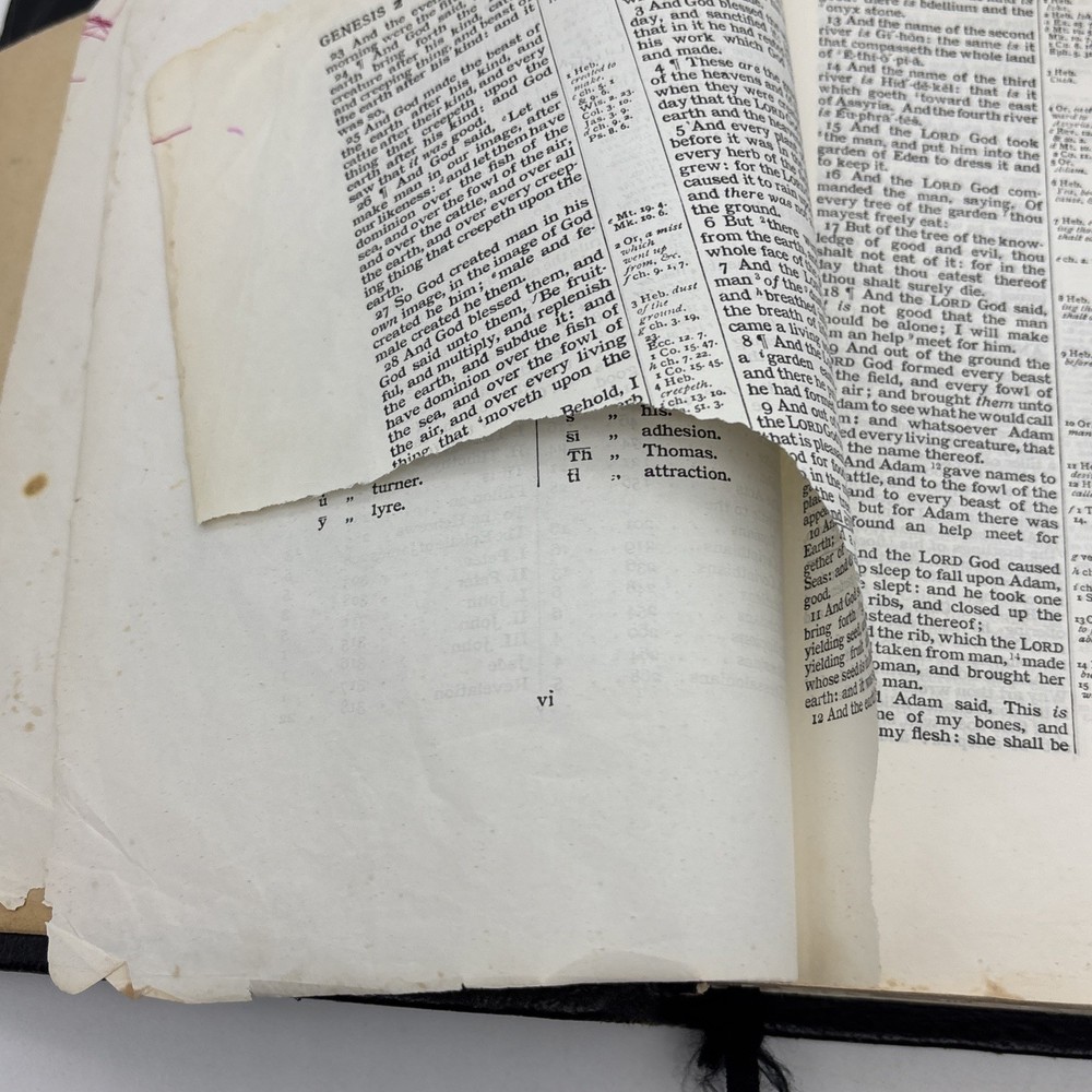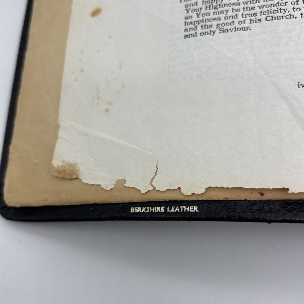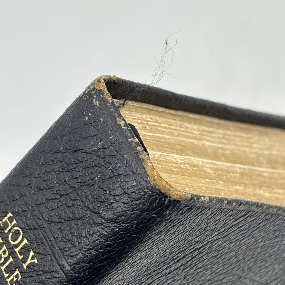 Badly worn Bible. Significant damage to the binding at the front hinge. The title page is missing. Several pages near the front and back are badly frayed, and it’s missing about half of the first page of Genesis. There are two ribbon bookmarks, one is badly frayed. And the Berkshire leather cover has a lot of wear and tear, especially on the edges. Please see pictures for a better idea of the cosmetic condition. Again, this is a wide margin addition with concordance bound in black Berkshire leather from Cambridge University press.