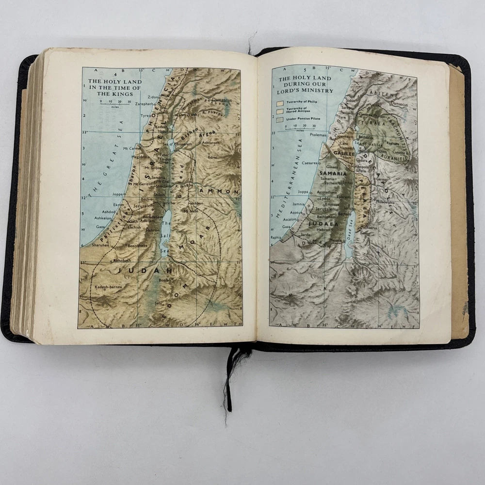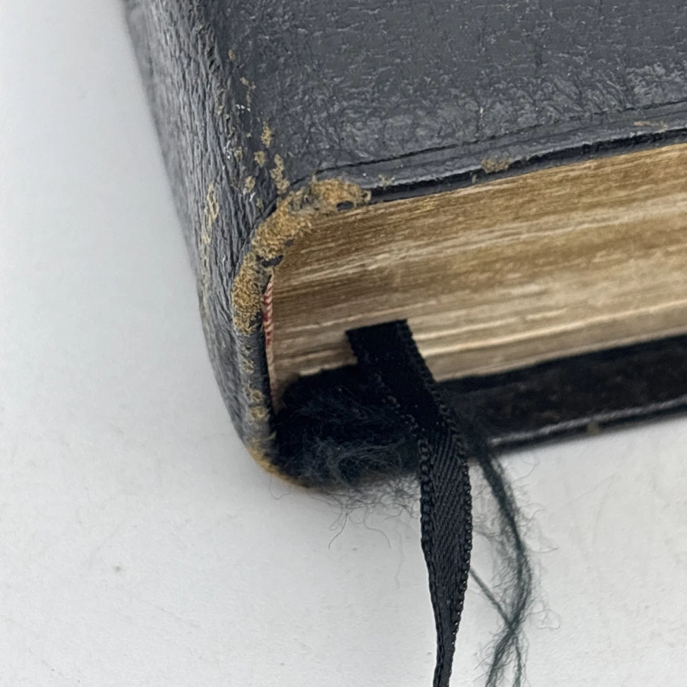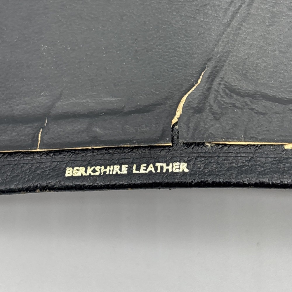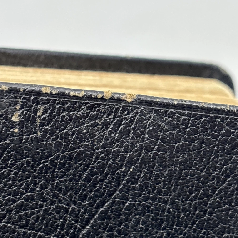 Badly worn Bible. Significant damage to the binding at the front hinge. The title page is missing. Several pages near the front and back are badly frayed, and it’s missing about half of the first page of Genesis. There are two ribbon bookmarks, one is badly frayed. And the Berkshire leather cover has a lot of wear and tear, especially on the edges. Please see pictures for a better idea of the cosmetic condition. Again, this is a wide margin addition with concordance bound in black Berkshire leather from Cambridge University press.