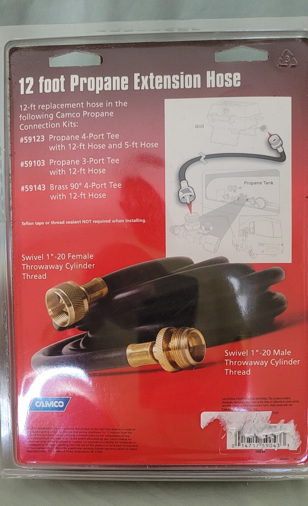 This CAMCO RV propane extension hose throwaway connector is the perfect addition to your RV. At 12 feet long, it provides ample length for connecting your propane tank to your camper. The hose is made in the United States and is designed to fit most standard propane tanks. With a no-warranty option, you can be sure that this product is built to last and will provide you with years of reliable use. The manufacturer part number is 59043, and it is easy to install. This extension hose is perfect for anyone who enjoys traveling in their RV and wants to ensure that they always have enough propane on hand.