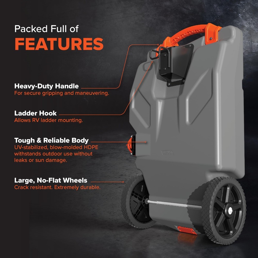 About this item Simplify RV Waste Disposal: Make waste disposal hassle-free with Camco's portable waste tank. Easily transport waste from your RV black water tank to a dump station— perfect for when you're parked far away & your RV sewer hose won't reach. Effortless Transport: Haul your waste with ease with no-flat wheels built for any terrain, an oversized handle for easy maneuvering, & a steel tow adapter for effortless towing behind a truck or golf cart. Tough & Reliable: Measuring 15 ½″ (L) x 25″ (W) x 46″ (H) and weighing 45 lb, this RV essential is constructed from durable, UV-stabilized blow-molded HDPE. It withstands outdoor use without leaks or sun damage. Patented Design Made In The USA: Rhino Tote Tanks are proudly manufactured in the USA with premium materials for unmatched durability. The patented design ensures exceptional craftsmanship and quality. RV Tote Tank Features: Rhino’s 36-Gallon Tote Tank is equipped with (2) oversized wheels, a large handle, tank rinser, ladder hook, and gate valve for easy use. Kit Accessories: This kit includes (1) tote tank, (1) 3' sewer hose w/swivel fittings, (1) 15″ female/female grey water hose, (1) clear elbow w/4-in-1, (1) clear double bayonet elbow, (4) storage caps, (2) caps w/lanyards, & (1) steel tow adapter. Easy To Clean: This RV camping must-have comes with a built-in gate valve for quick emptying. The smooth interior makes cleaning a breeze and the integrated tank rinser ensures a thorough cleanse with minimal effort. Simple To Store: Hang the portable waste water tank on your camper ladder using the ladder hook. Secure the Camco tote with tie-down straps that fit into grooves on the tank body. The 3' sewer hose compresses for storage.
