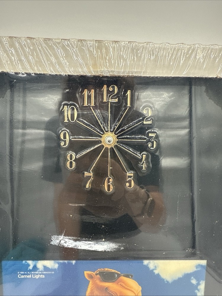 Approx 19"x12". Enhance your space with a sleek, timeless piece that combines functionality with a touch of vintage flair. The Camel Lights Wall Clock is a newly revealed old stock item, featuring a classic black design that effortlessly complements any room. Its distinctive Joe Camel Leather Jacket Motorcycle theme adds a unique appeal, making it a standout addition or a thoughtful gift for collectors and enthusiasts alike. Crafted with precision, this clock is a testament to the enduring legacy of the Camel brand. Its unbranded versatility allows it to blend seamlessly with various decor styles, from rustic to modern. The clock's rich history and iconic branding make it more than just a timekeeper; it's a statement piece with a story.